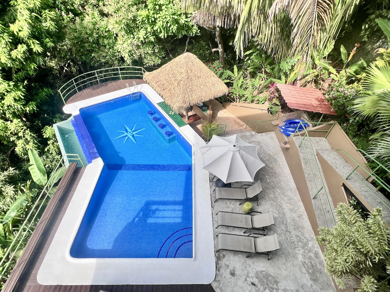 3 BR Manuel Antonio Villa + 2 BR and Huge Pool for sale. An exceptional gated estate nestled in the heart of nature, this breathtaking villa offers over 5,000 square feet of luxurious living space spread across four levels. This stunning villa promises an unparalleled experience with five expansive bedroom suites, each featuring its own private full bathroom. Whether enjoying the impressive multi-level pool with a swim-up tiki bar or relaxing on the rooftop entertainment area with a BBQ, this property guarantees a retreat, with mesmerizing views of the jungle and the ocean.