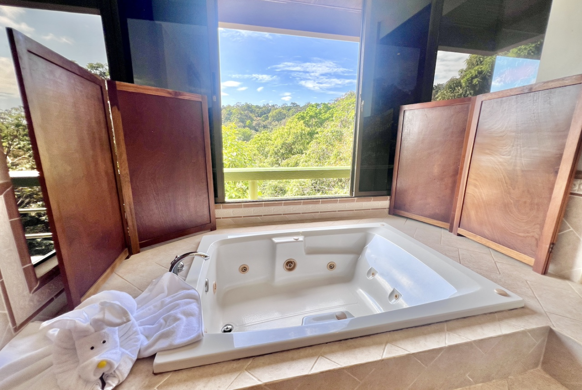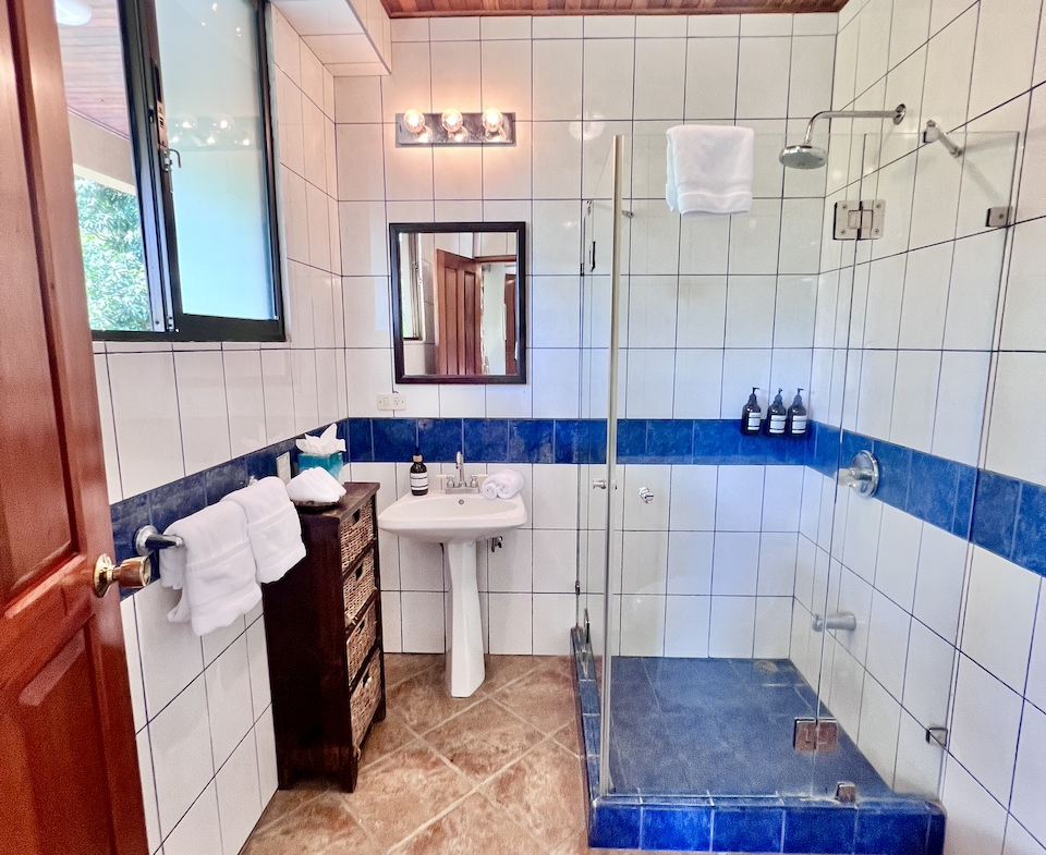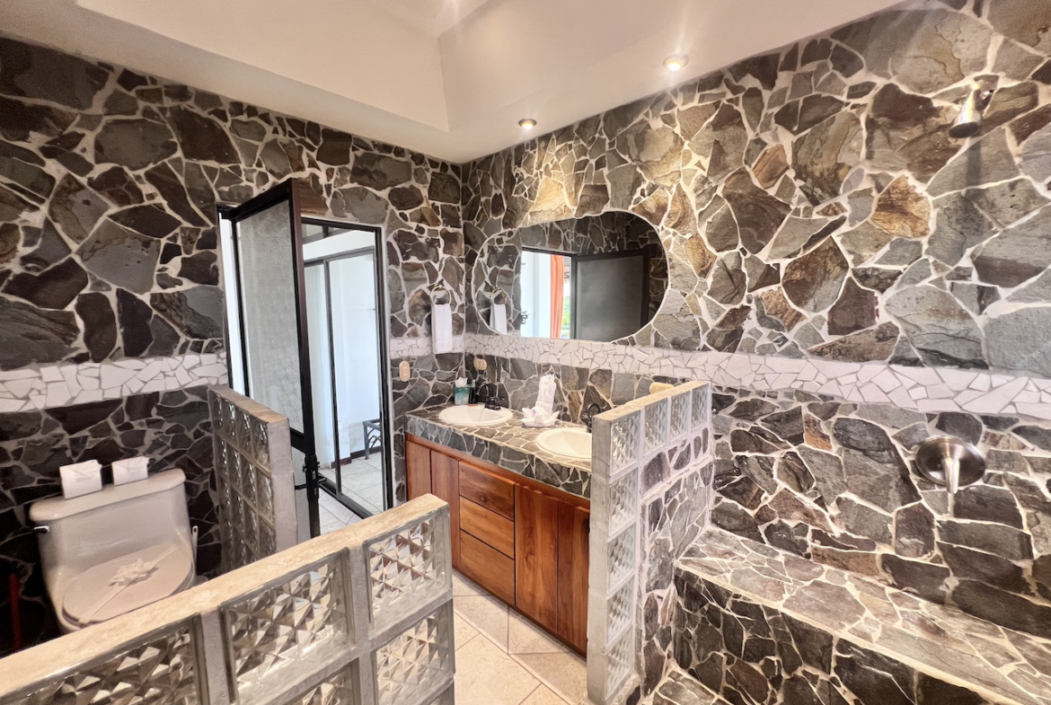 For those seeking a little more privacy, a staircase from the main living area leads to the stunning Penthouse Bedroom, which occupies the entire top level. This lavish suite boasts a king-size bed, plus a sofa bed and a sophisticated slate-stone bathroom with dual shower heads. An expansive sundeck with a bar, dining area, and gas grill offers the ultimate space for entertaining or soaking in the unparalleled jungle and ocean vistas. The Penthouse truly feels like a home within a home, offering complete privacy and luxury.