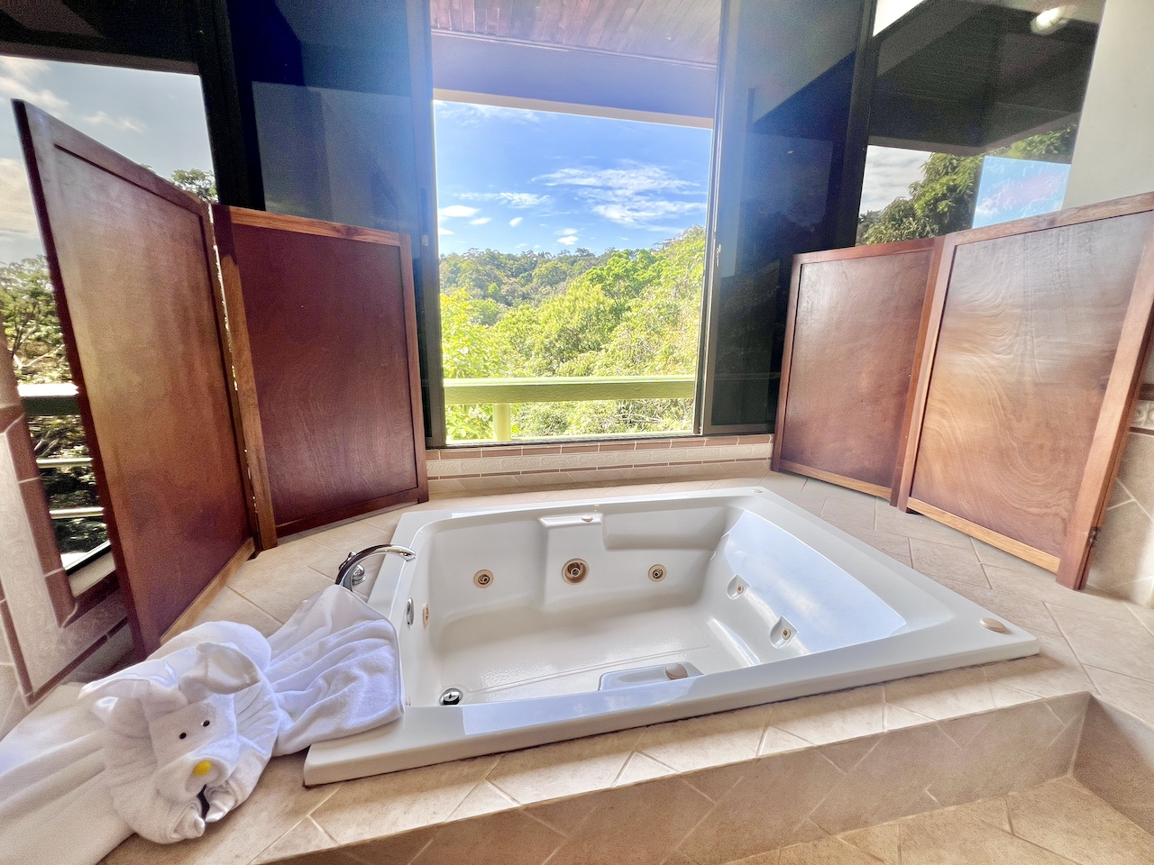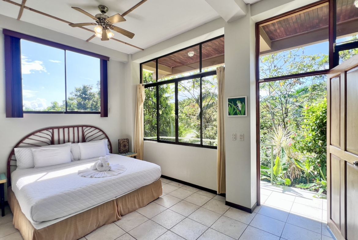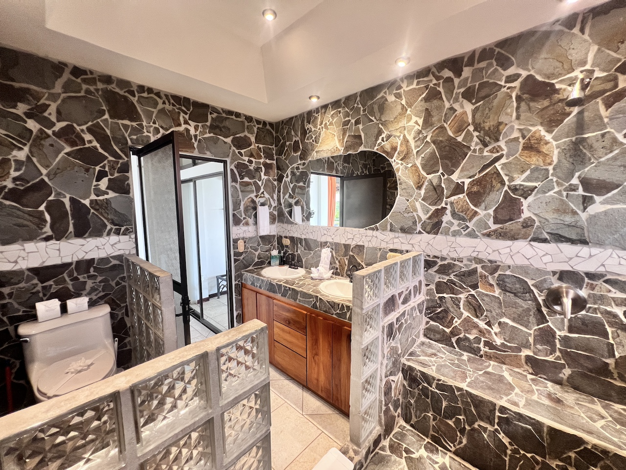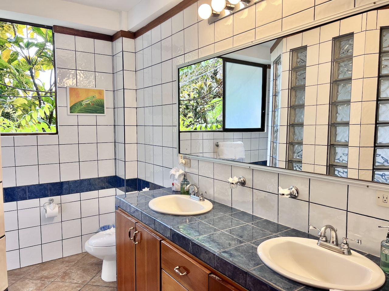 The master bedroom suite is a serene retreat, accessible by an internal staircase or private entrance from the carport. This generous suite includes a king-size bed, a queen bed, separate his-and-hers sinks, a large walk-in shower, and an indulgent Jacuzzi tub. The private balcony offers views of the jungle and connects seamlessly to the pool area, providing a peaceful sanctuary for relaxation.