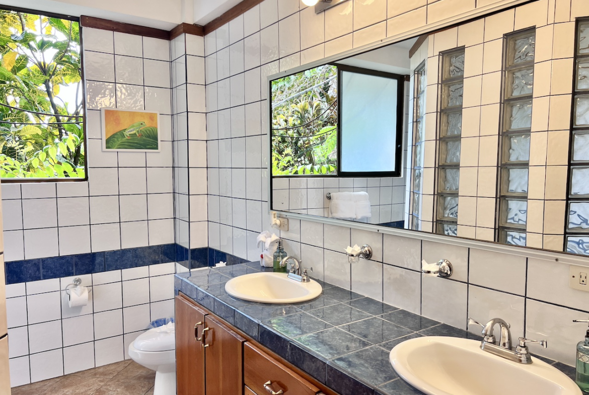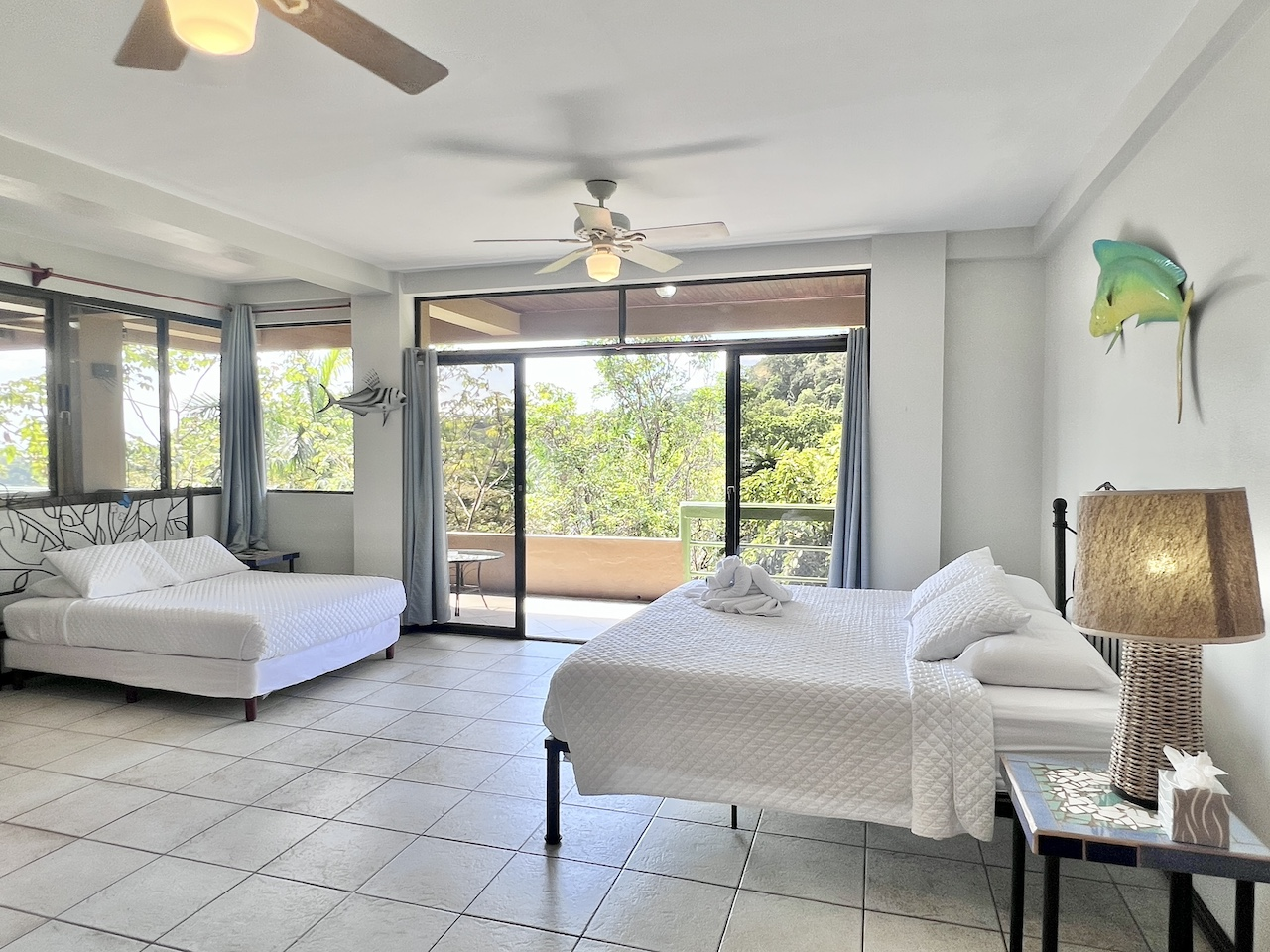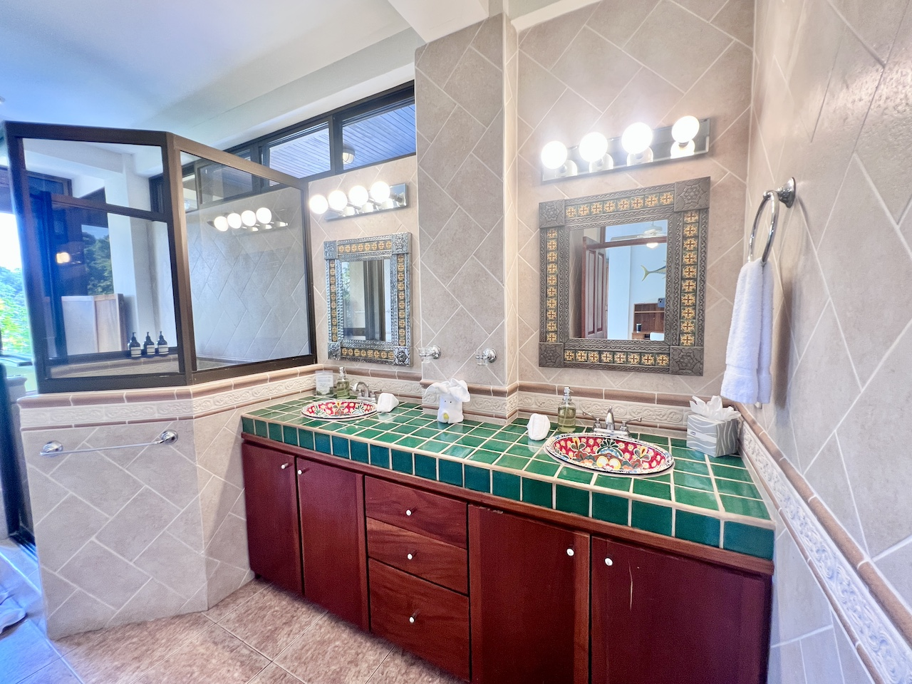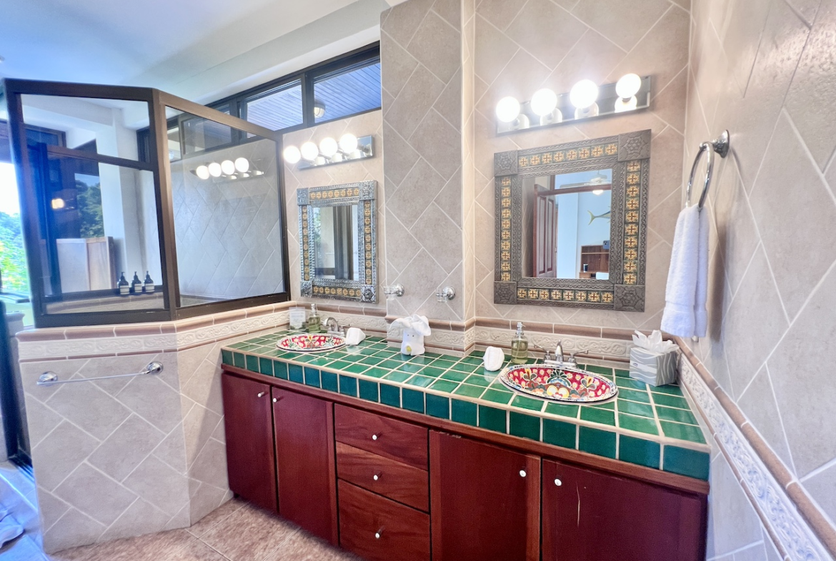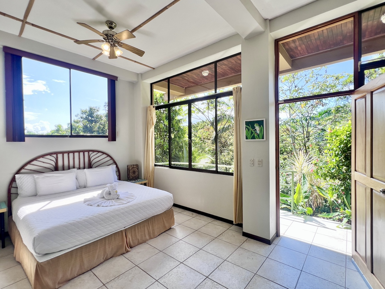 The master bedroom suite is a serene retreat, accessible by an internal staircase or private entrance from the carport. This generous suite includes a king-size bed, a queen bed, separate his-and-hers sinks, a large walk-in shower, and an indulgent Jacuzzi tub. The private balcony offers views of the jungle and connects seamlessly to the pool area, providing a peaceful sanctuary for relaxation.