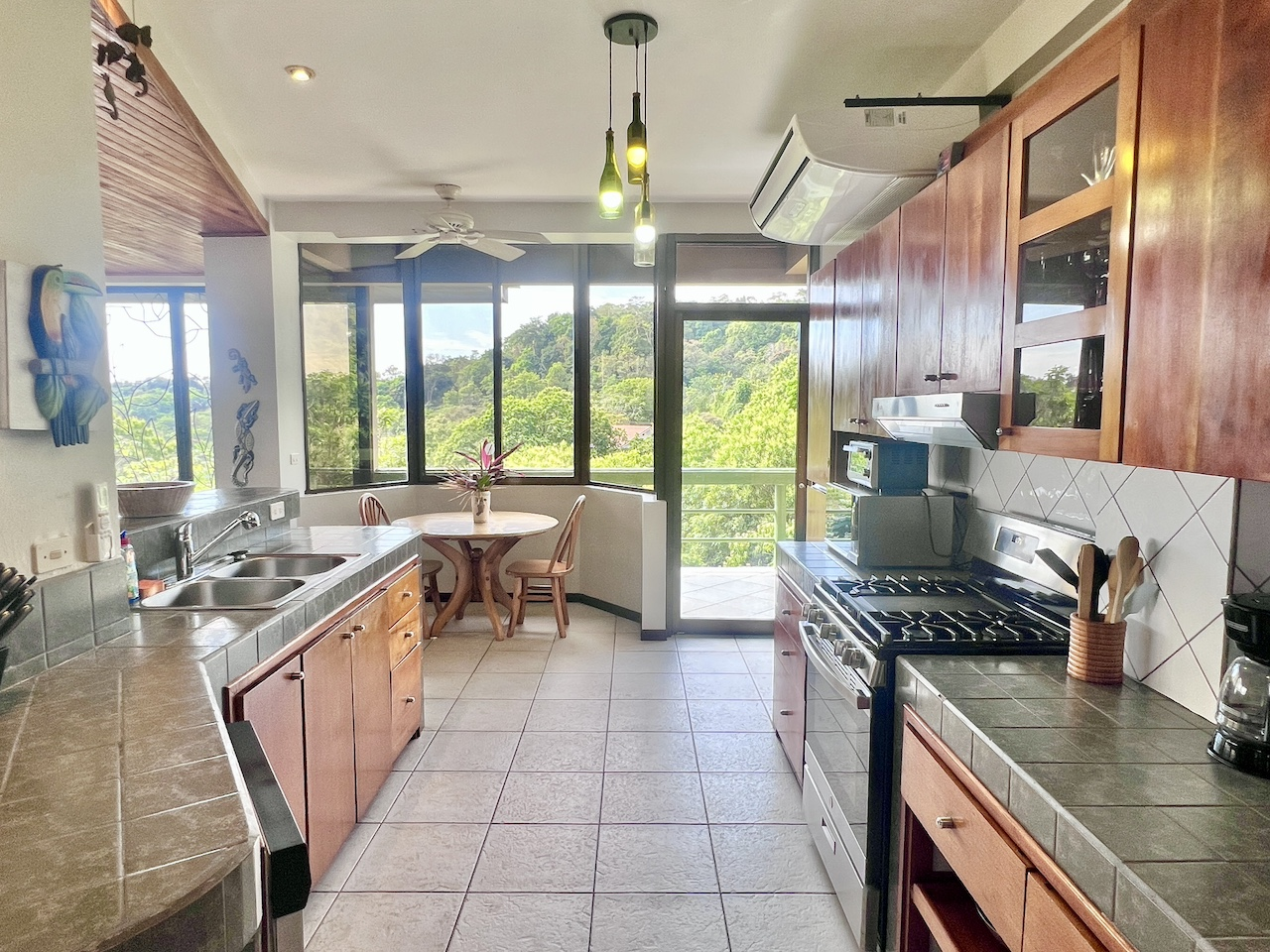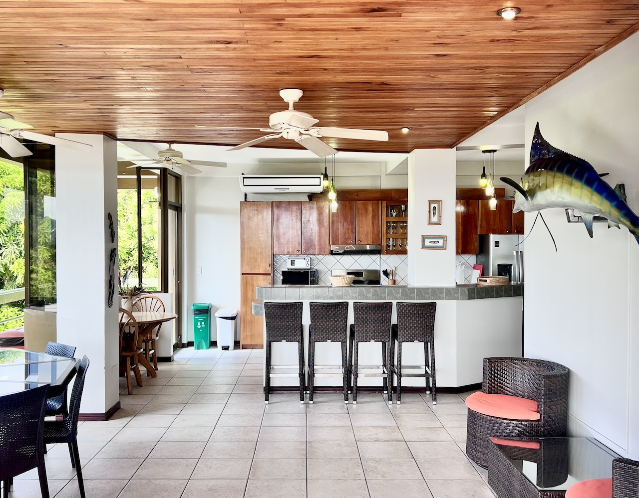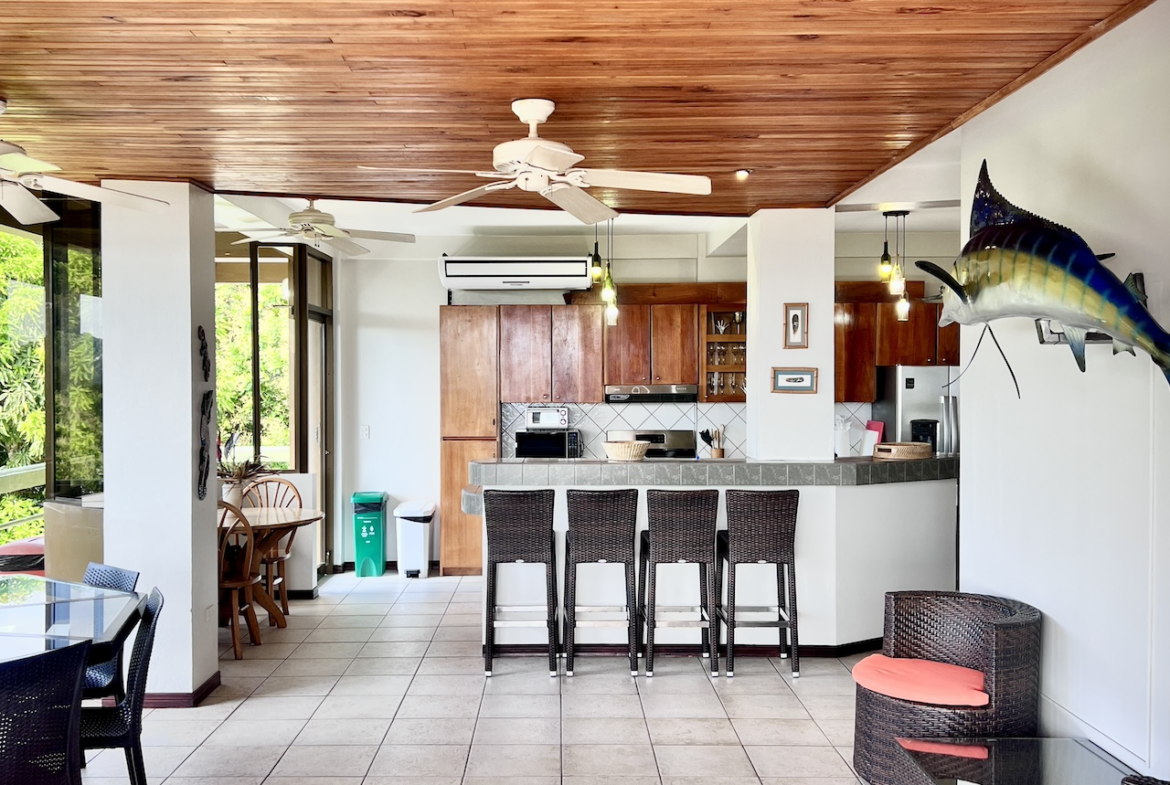 Above the pool area, the main living space serves as the heart of the home. Large windows frame stunning views of Manuel Antonio National Park and the distant ocean towards Dominical Beach. This open-concept area features a well-equipped kitchen with modern appliances, a spacious dining area, and a cozy living room that comfortably accommodates up to 14 guests—ideal for gathering and unwinding. A convenient half-bathroom completes this level, making it both functional and inviting.