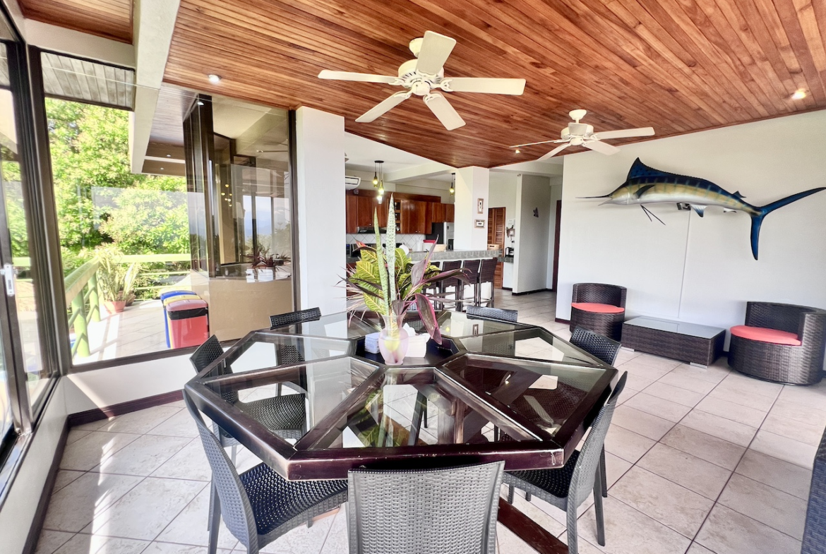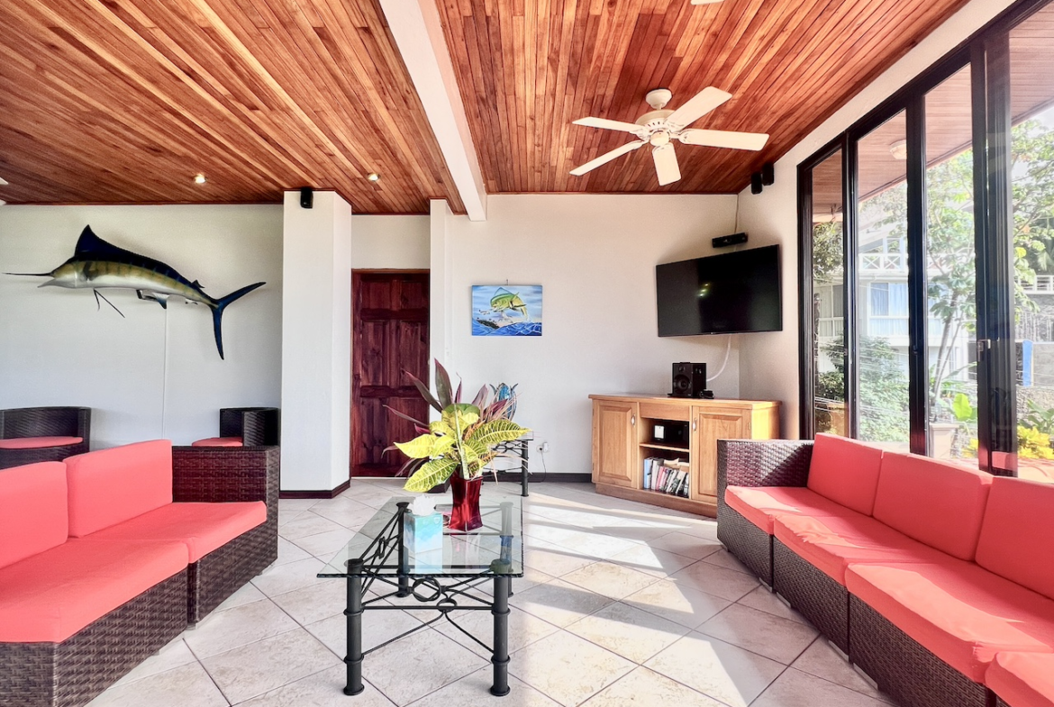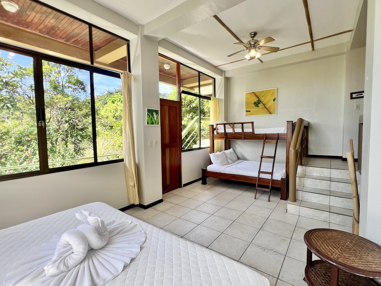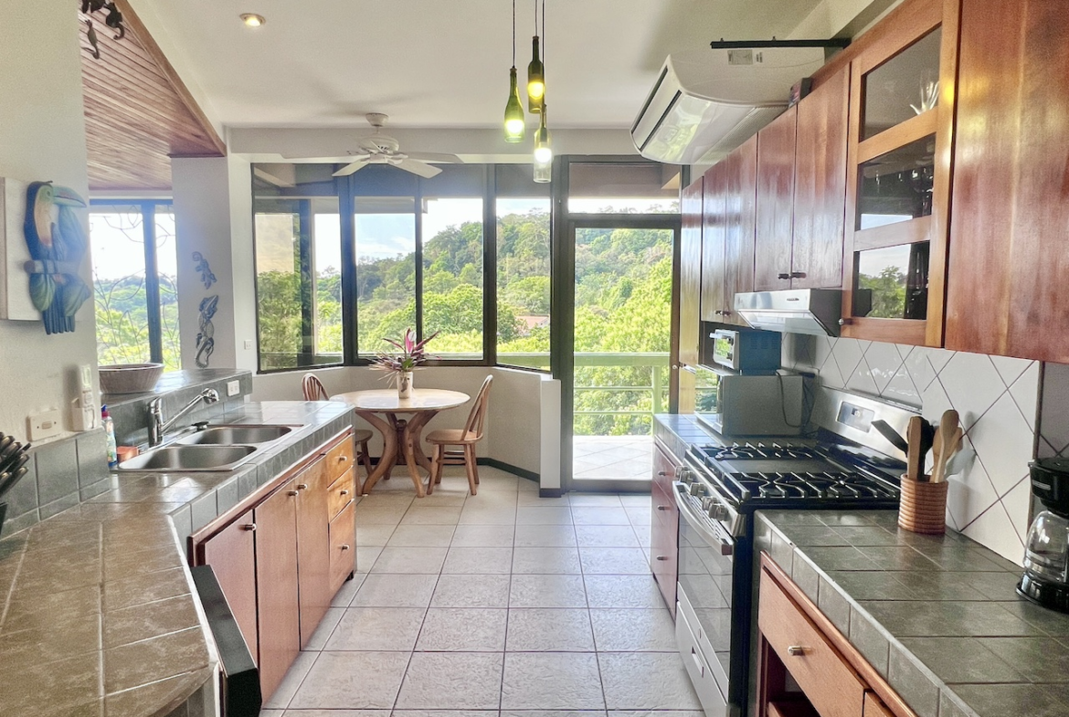 Above the pool area, the main living space serves as the heart of the home. Large windows frame stunning views of Manuel Antonio National Park and the distant ocean towards Dominical Beach. This open-concept area features a well-equipped kitchen with modern appliances, a spacious dining area, and a cozy living room that comfortably accommodates up to 14 guests—ideal for gathering and unwinding. A convenient half-bathroom completes this level, making it both functional and inviting.