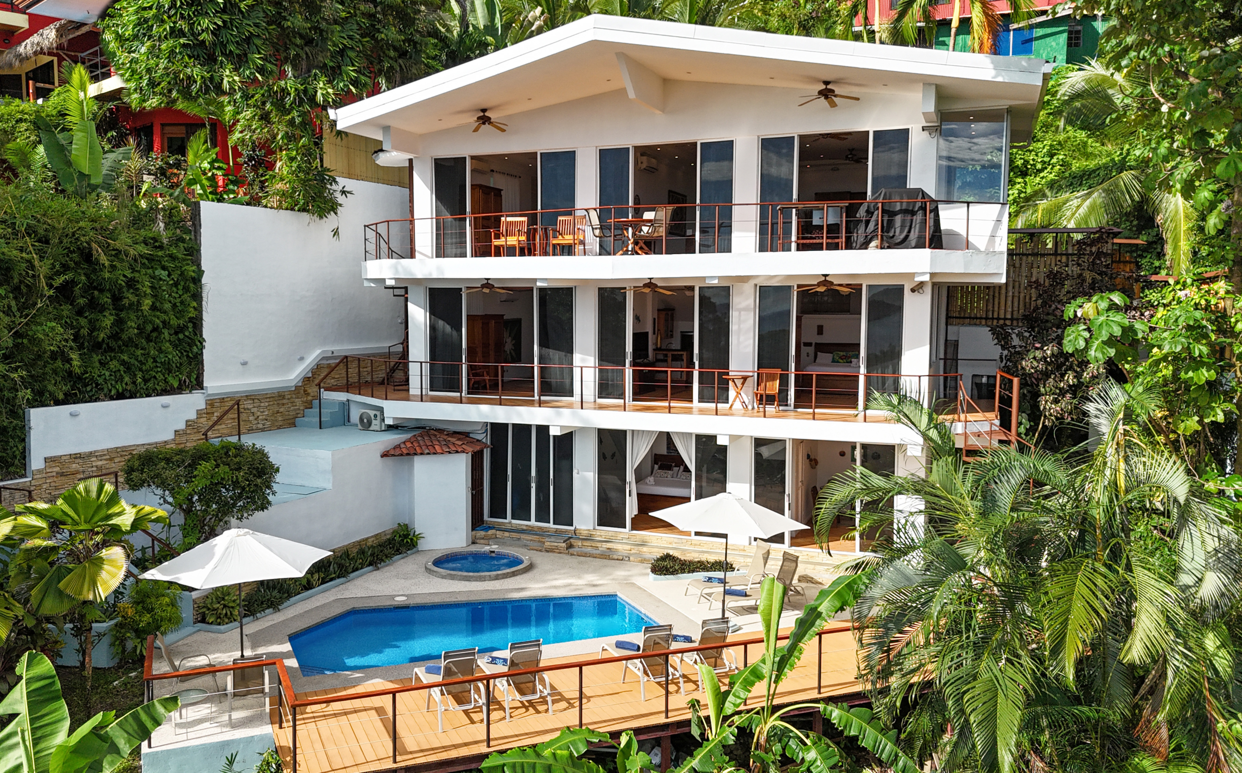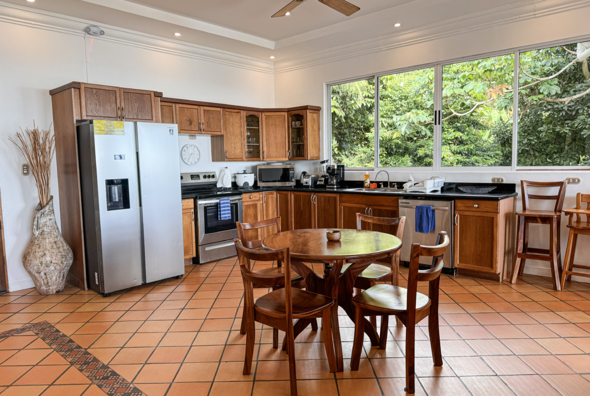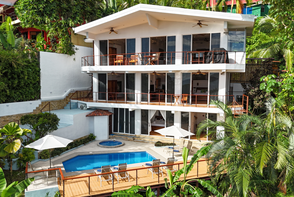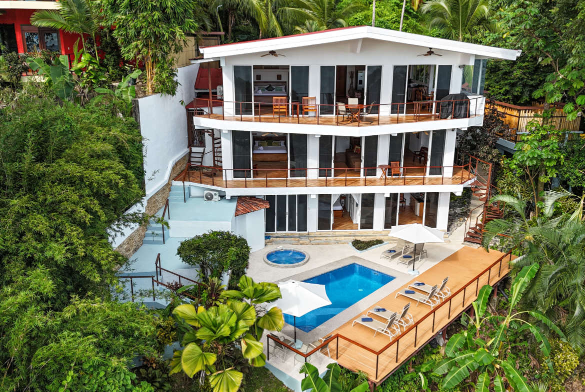 Designed with the utmost comfort, this three-level sanctuary features 4.5 elegantly appointed bathrooms and is fully air-conditioned, ensuring a pleasant and refreshing atmosphere throughout your stay. The expansive layout of the villa encompasses ample balconies on the top two levels, providing breathtaking views of the ocean, lush jungle, and the surrounding area. From these vantage points, you can observe three species of monkeys, sloths, and many colorful birds that call this tropical paradise home.