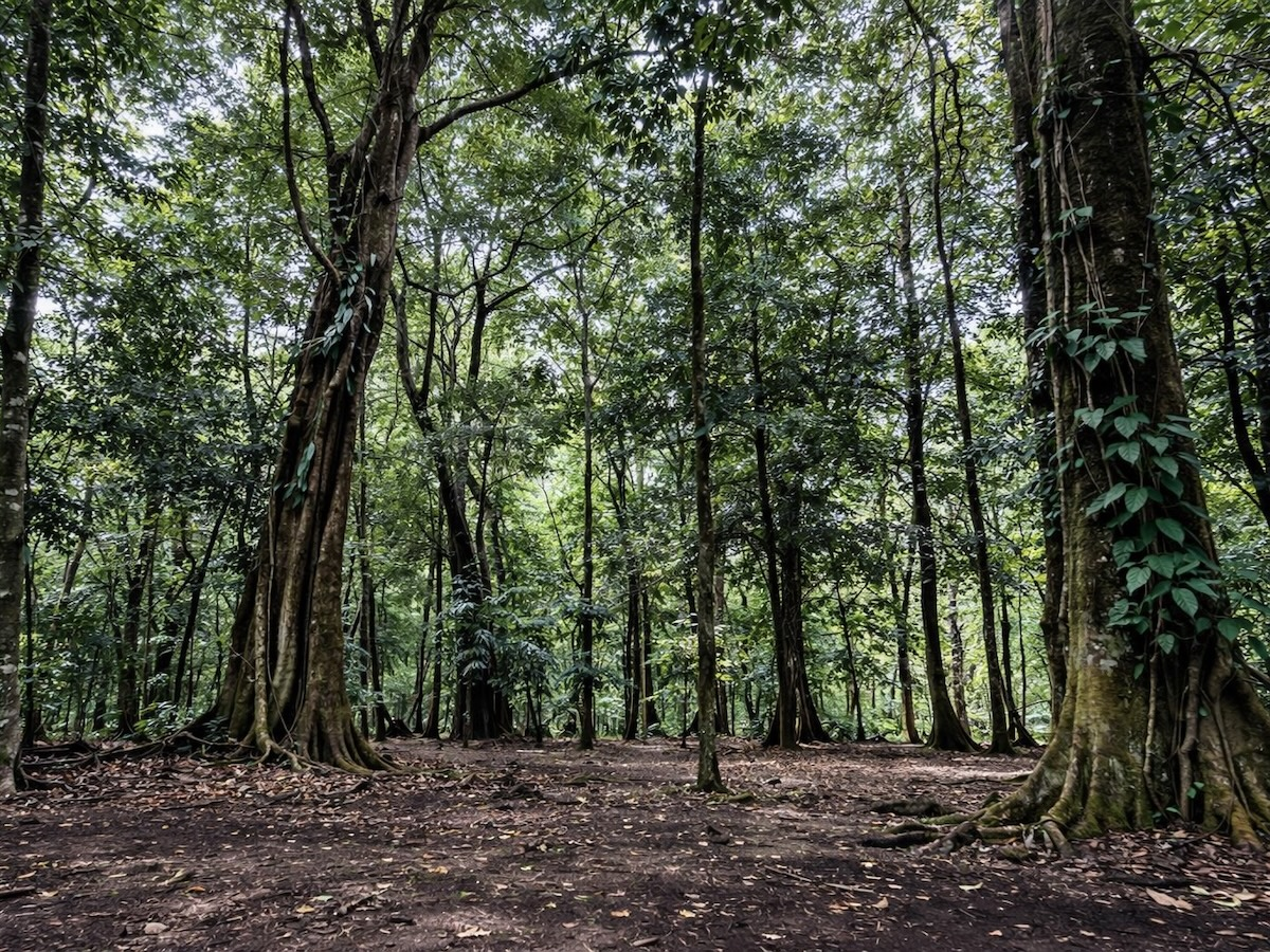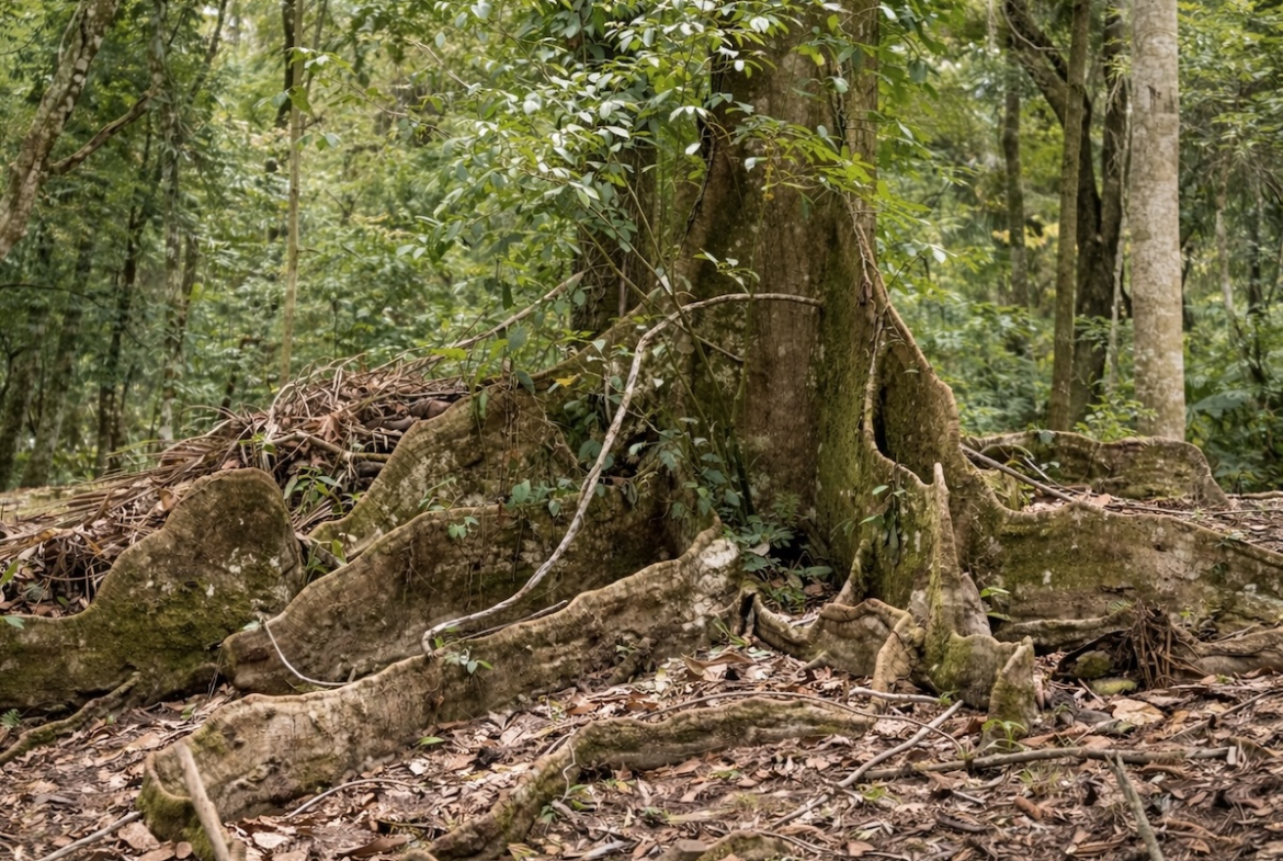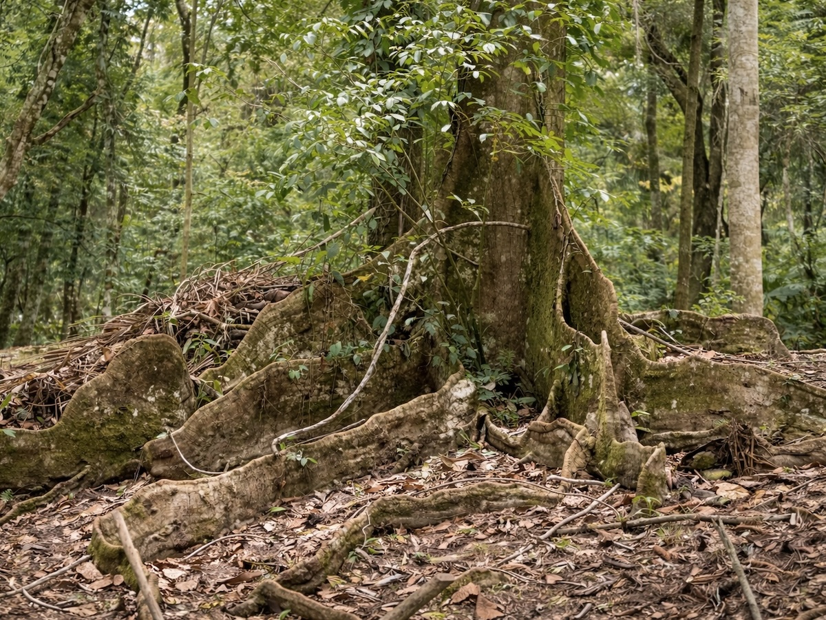 - Mature rainforest trees with striking root systems throughout
