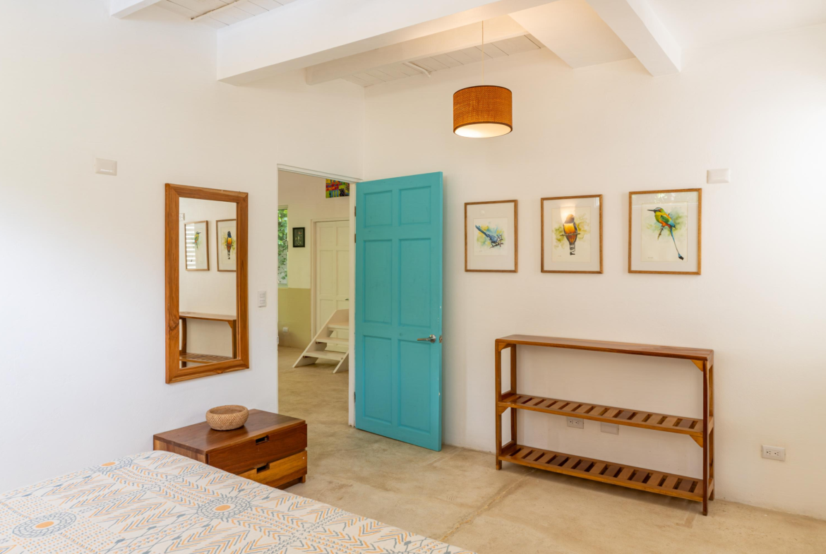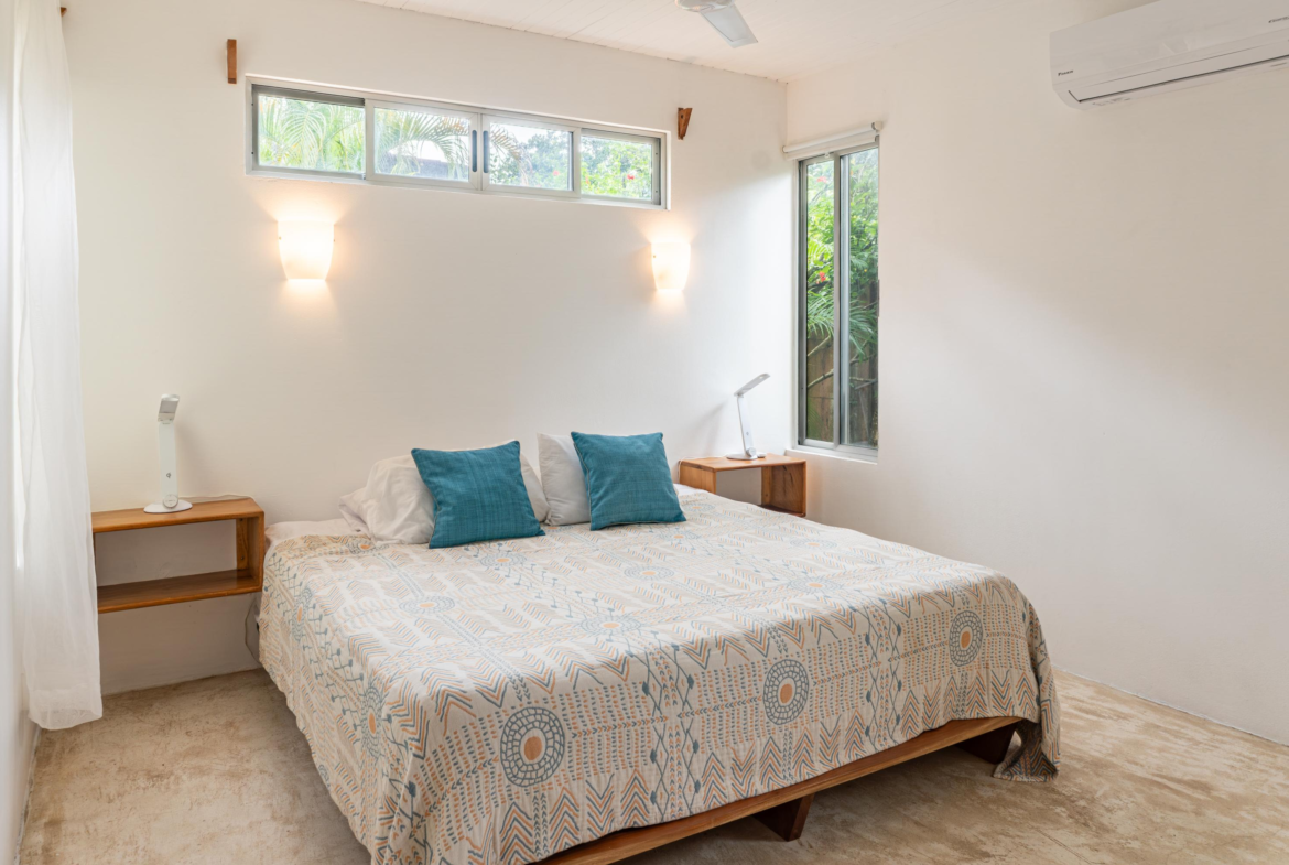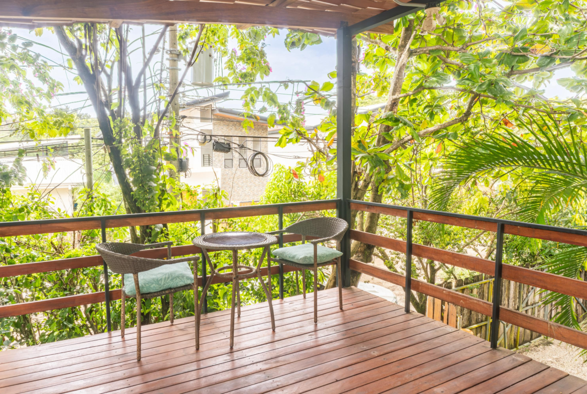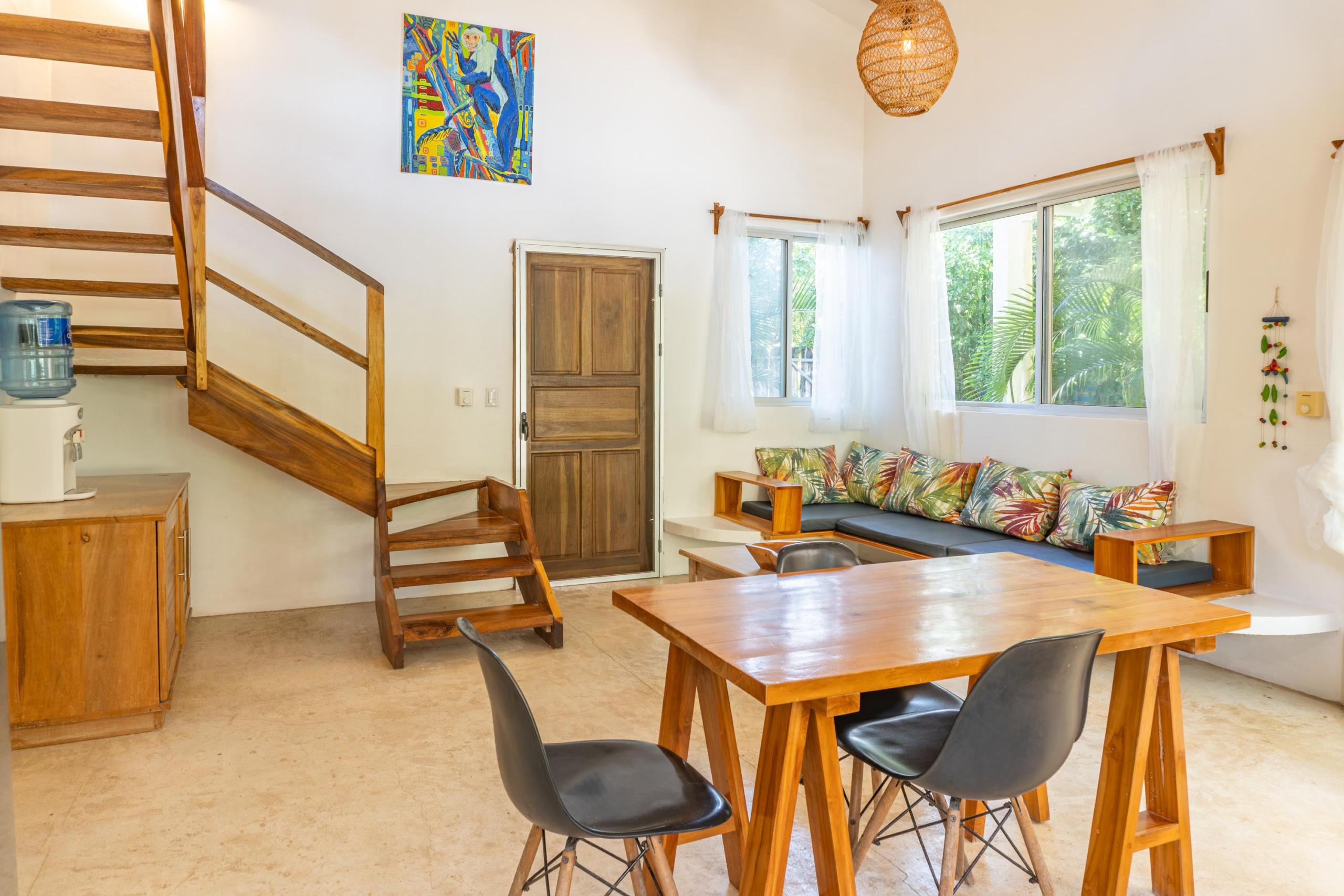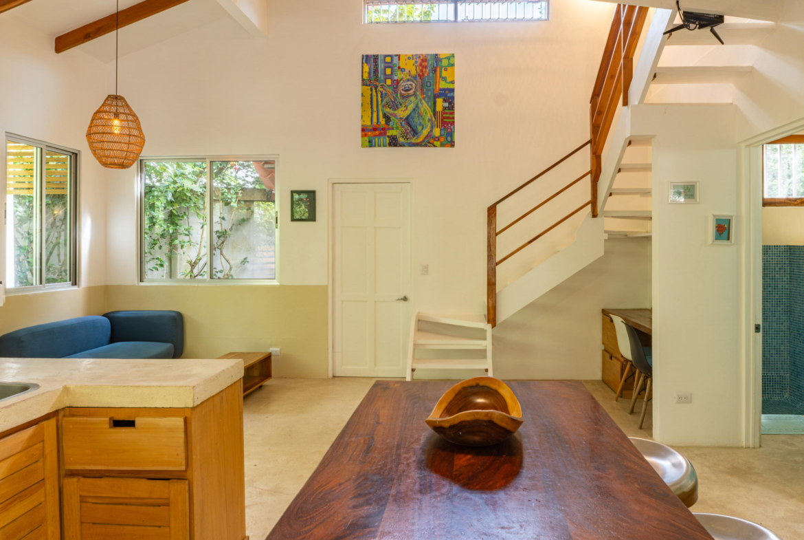 The second home is divided into two rentable spaces, maximizing flexibility and income potential. The Main unit in the second home offers one bedroom and one bathroom with a loft that can be used as a second bedroom. Its open-plan kitchen and living room feature accordion windows opening onto the patio, creating a seamless connection between indoor and outdoor areas. The bedroom is air-conditioned, and a large bathroom with a walk-in shower and a laundry room are located on the first floor. Beautiful Guanacaste stairs lead up to the loft space.