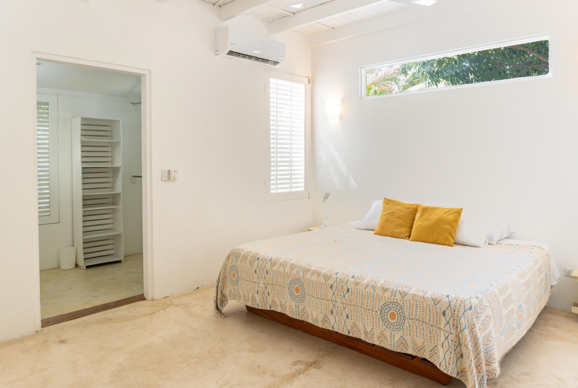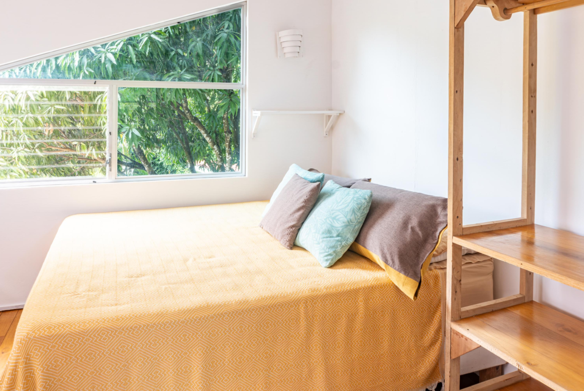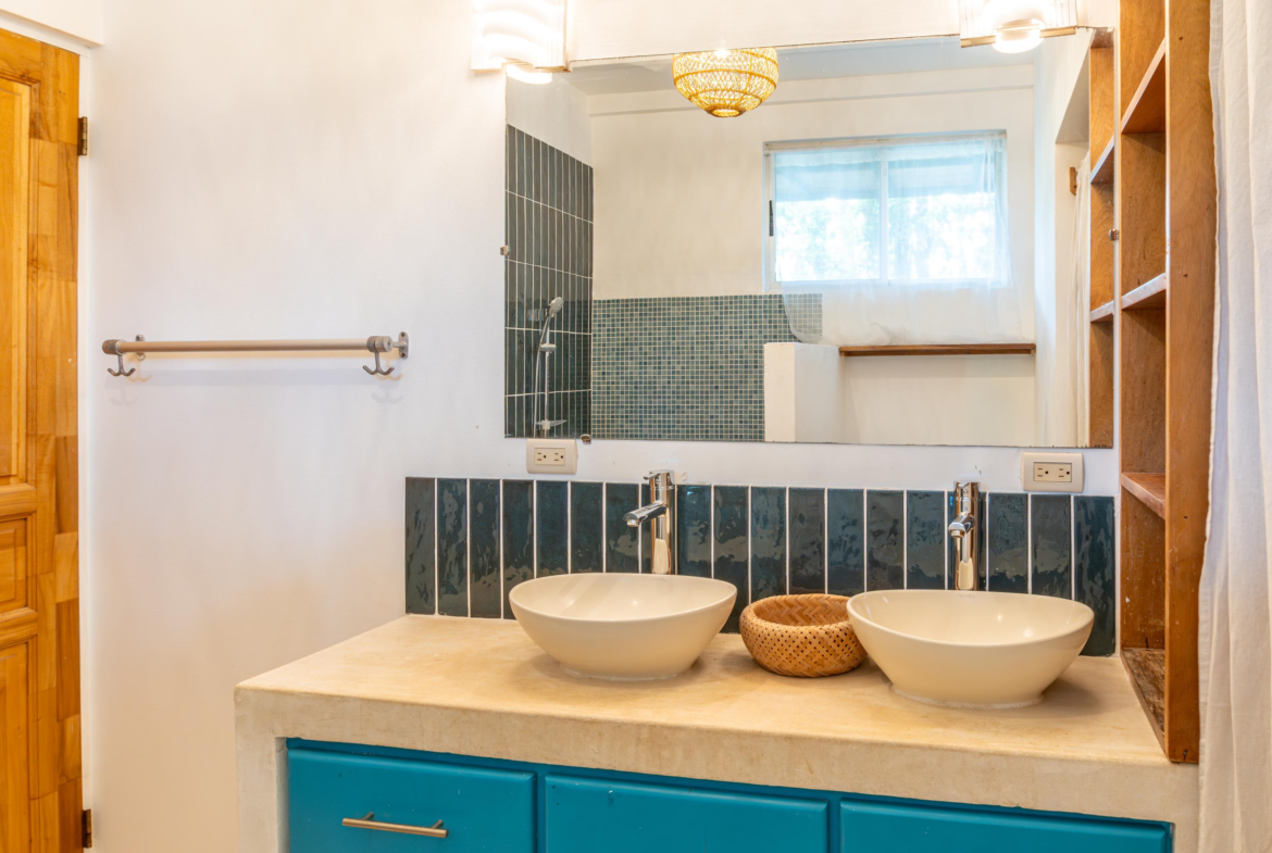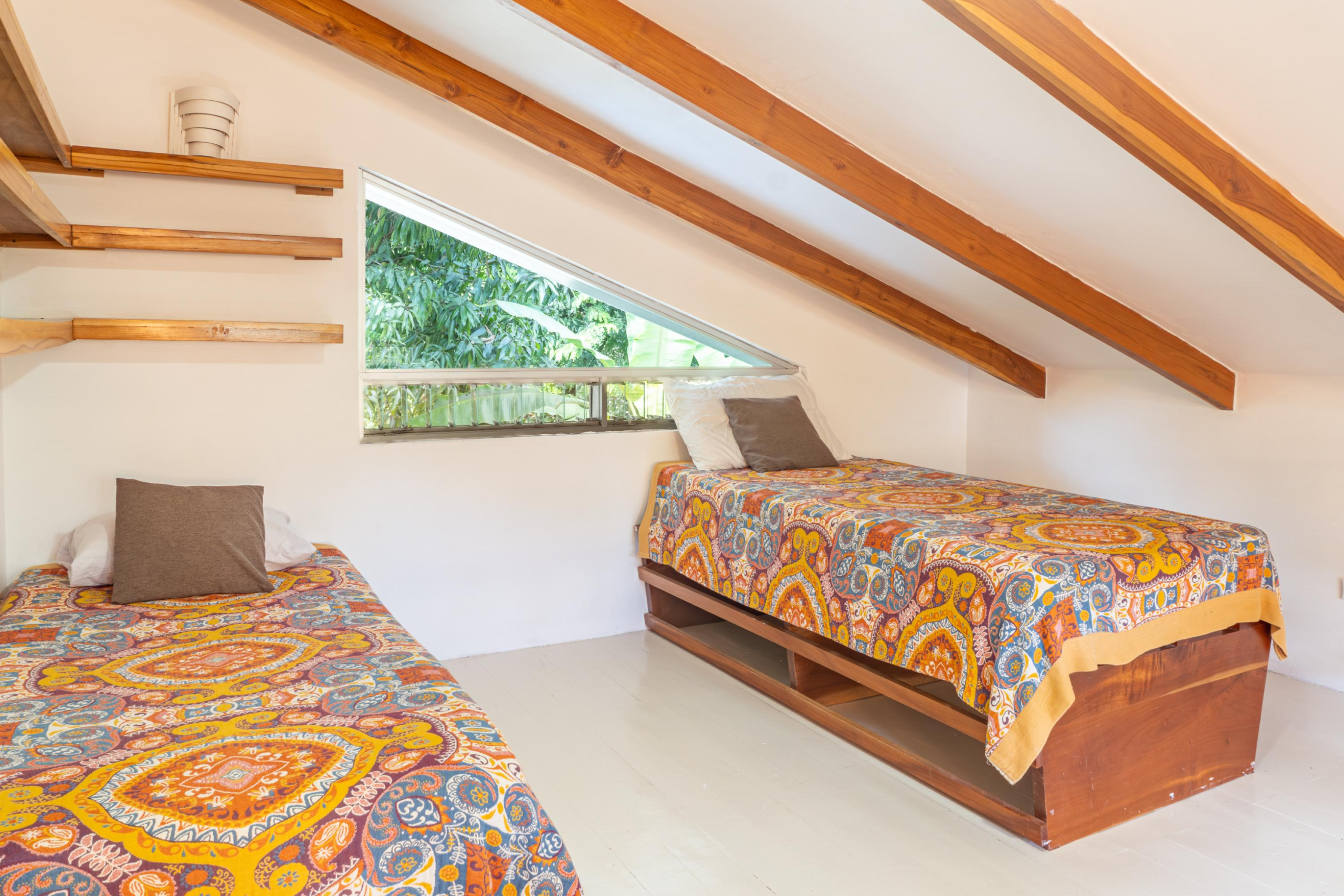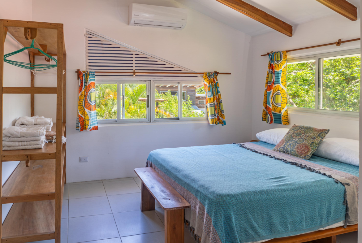 The second home is divided into two rentable spaces, maximizing flexibility and income potential. The Main unit in the second home offers one bedroom and one bathroom with a loft that can be used as a second bedroom. Its open-plan kitchen and living room feature accordion windows opening onto the patio, creating a seamless connection between indoor and outdoor areas. The bedroom is air-conditioned, and a large bathroom with a walk-in shower and a laundry room are located on the first floor. Beautiful Guanacaste stairs lead up to the loft space.