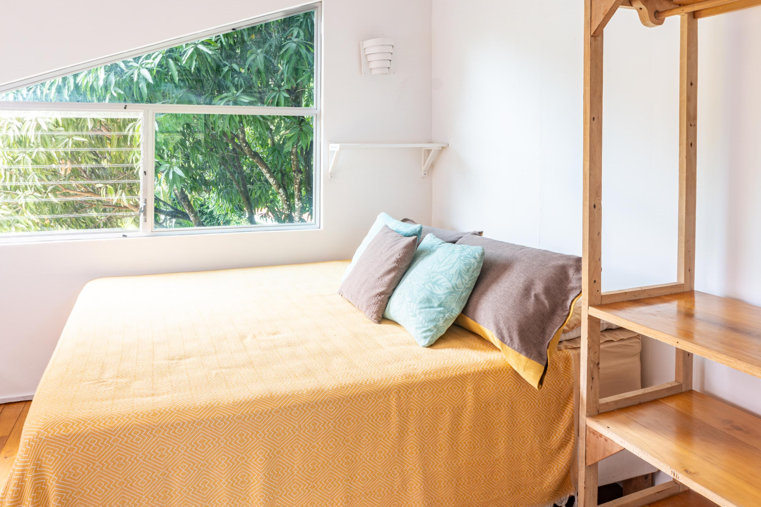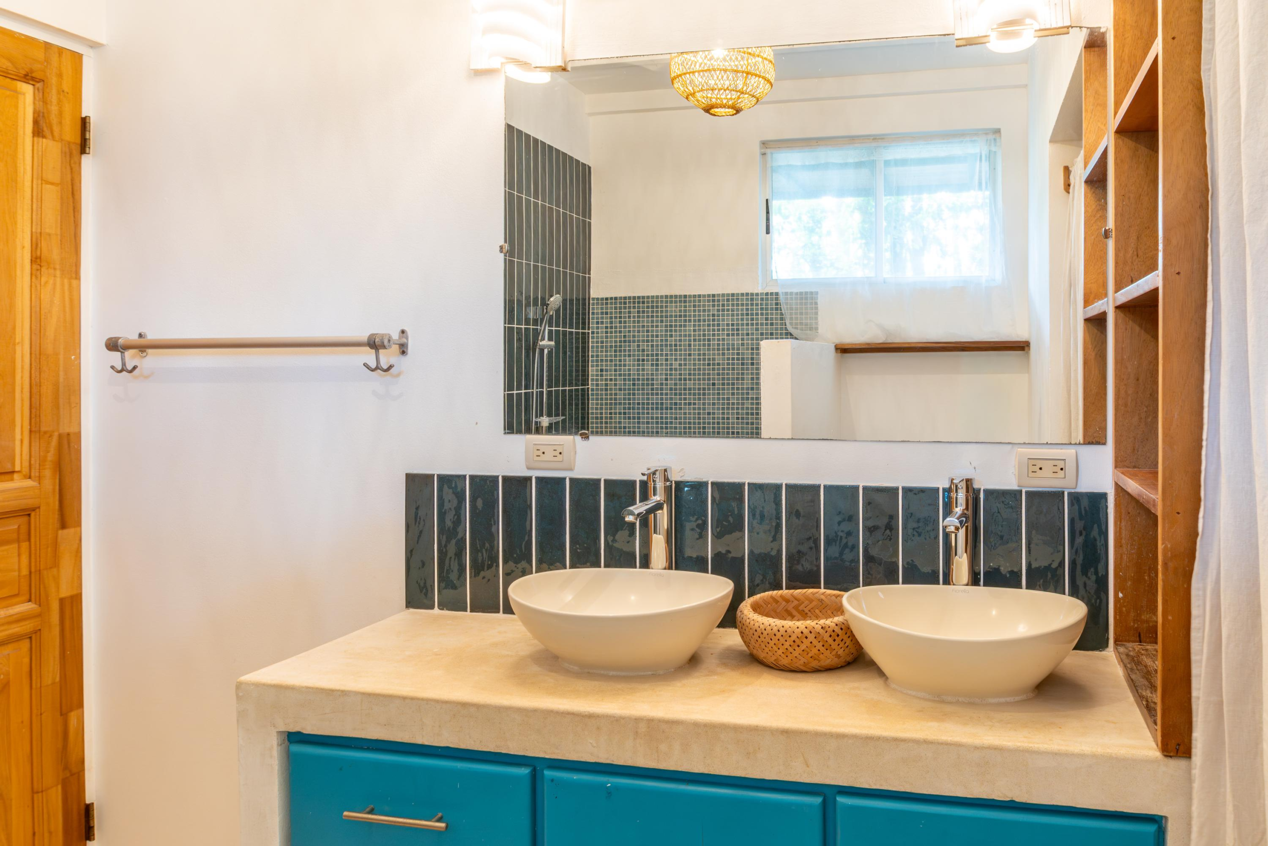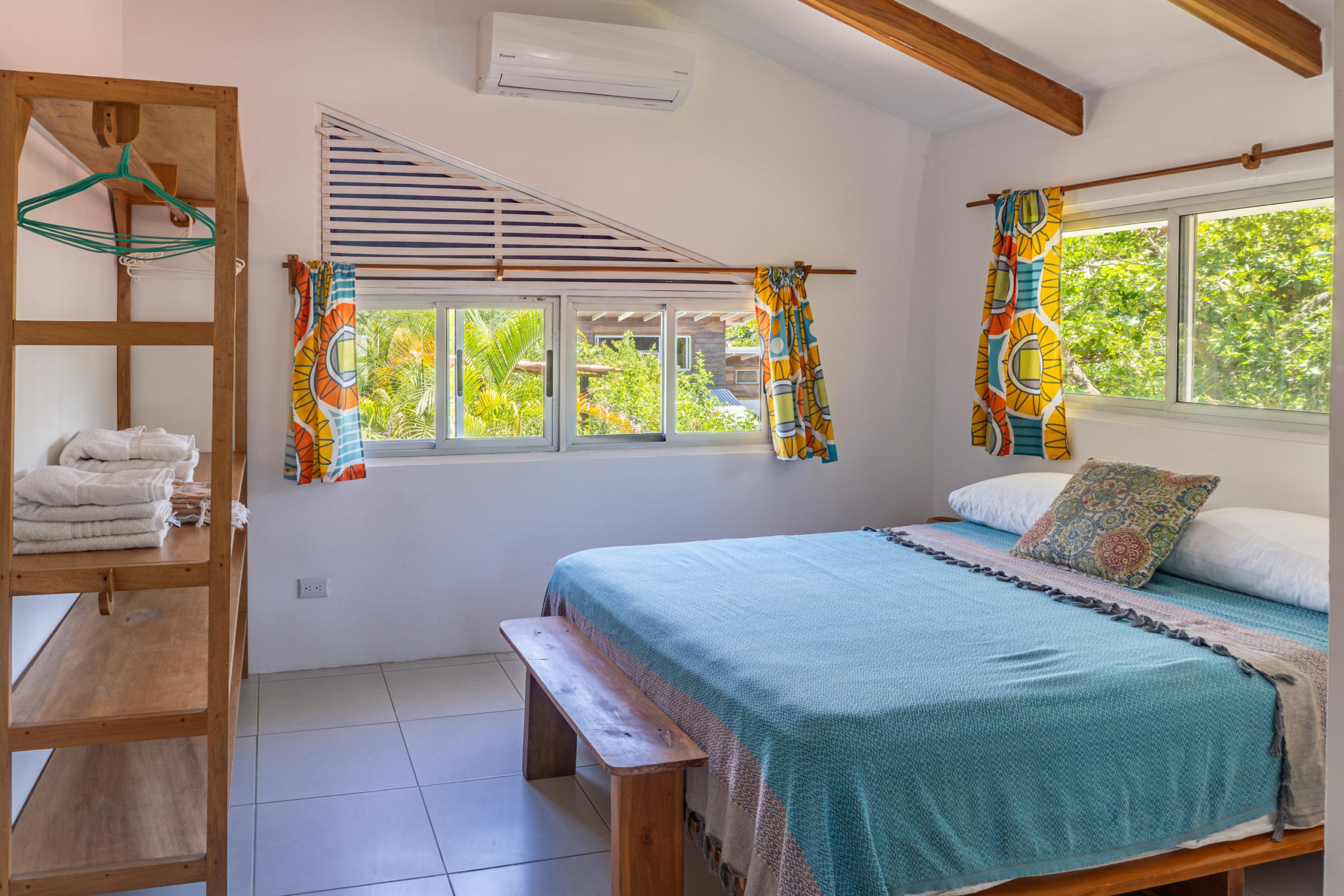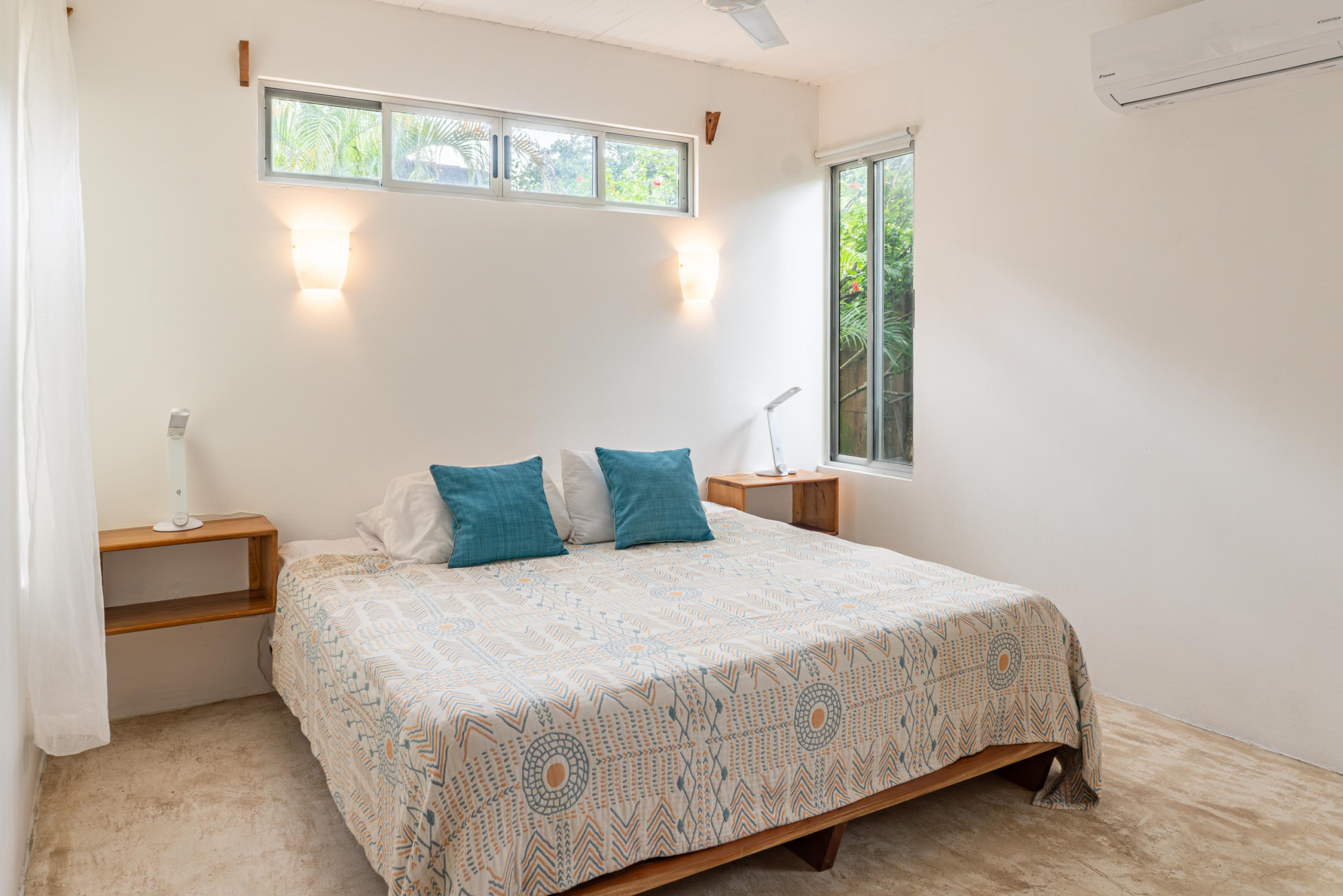 The second home is divided into two rentable spaces, maximizing flexibility and income potential. The Main unit in the second home offers one bedroom and one bathroom with a loft that can be used as a second bedroom. Its open-plan kitchen and living room feature accordion windows opening onto the patio, creating a seamless connection between indoor and outdoor areas. The bedroom is air-conditioned, and a large bathroom with a walk-in shower and a laundry room are located on the first floor. Beautiful Guanacaste stairs lead up to the loft space.