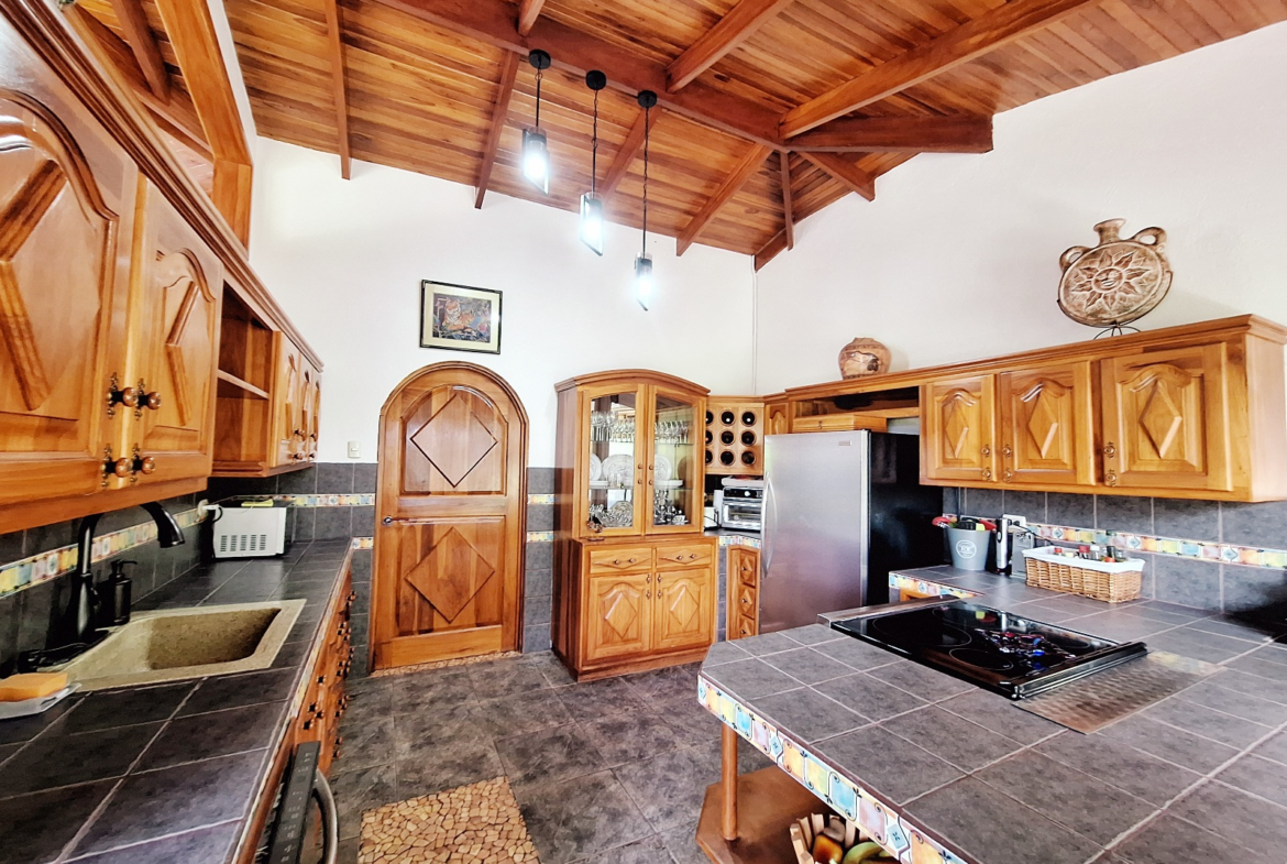 The custom-made kitchen has solid hand-crafted wood cabinetry, plenty of counter space, and a spacious pantry perfectly blending rustic style and functionality to create a culinary haven where cooking becomes a joy.