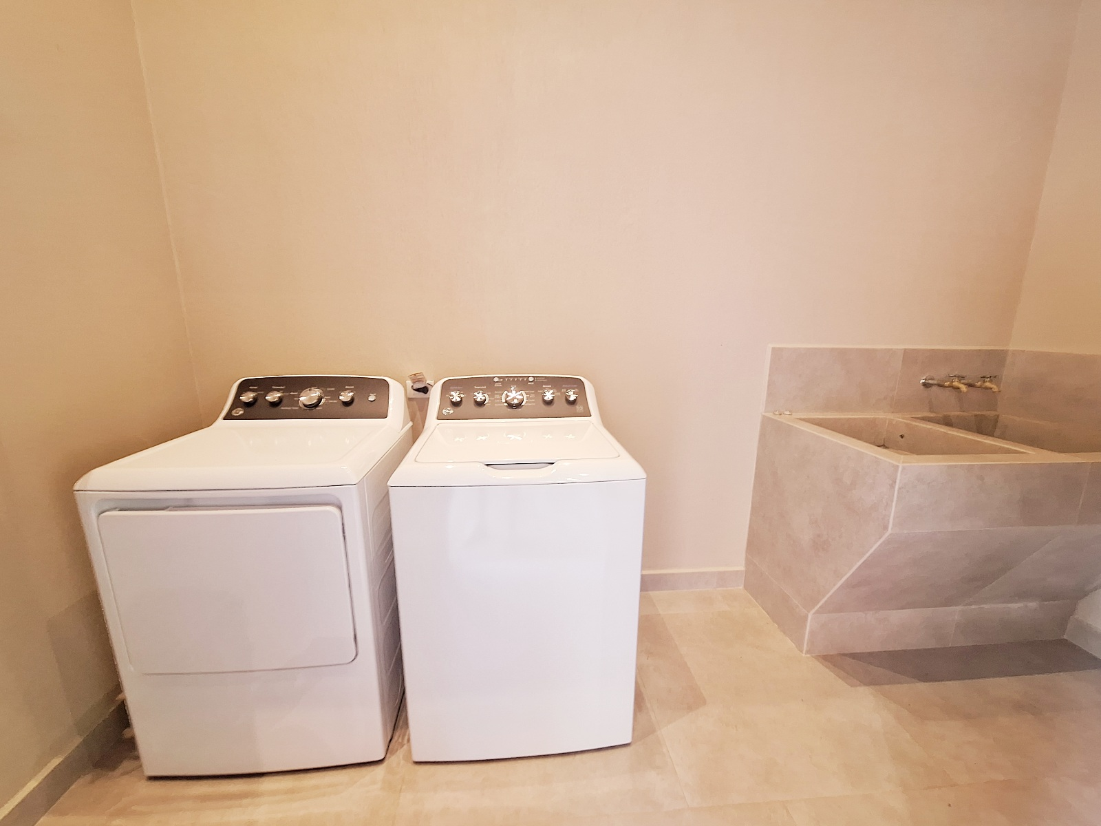 The fully equipped kitchen includes all appliances, generous custom-made, solid-wood cabinetry, and a dedicated pantry/storage room that can also serve as extra office space. Additional highlights include a separate laundry room with a washer and dryer and a convenient mud sink.