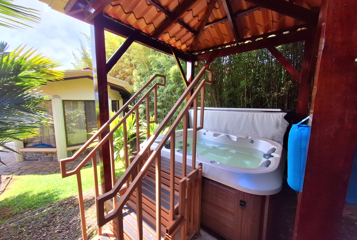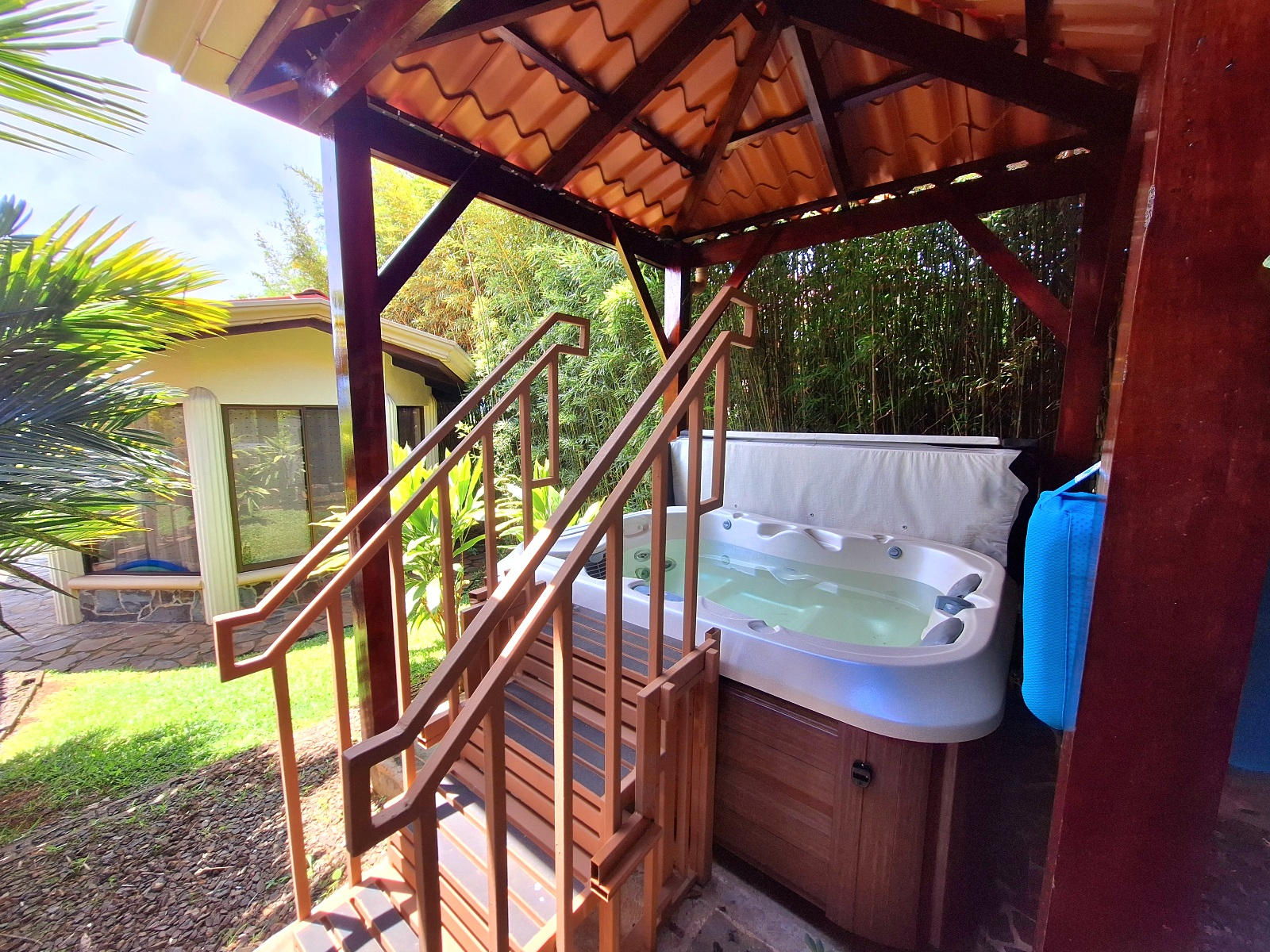 The kidney-shaped solar heated pool has a natural stone deck for sunbeds and lounge chairs. Offside the veranda there is a covered jacuzzi hot tub.