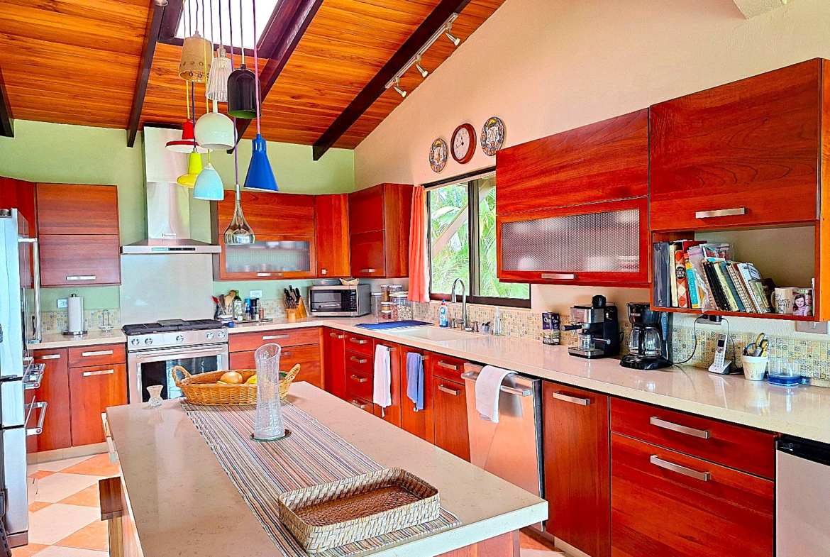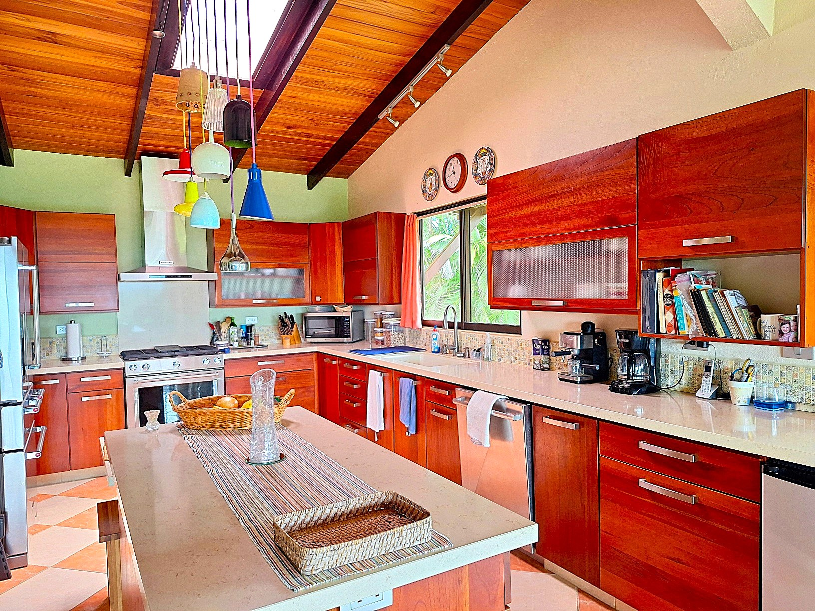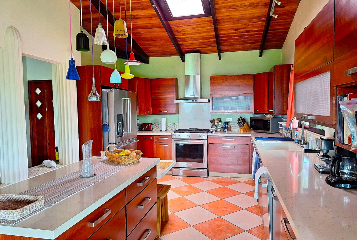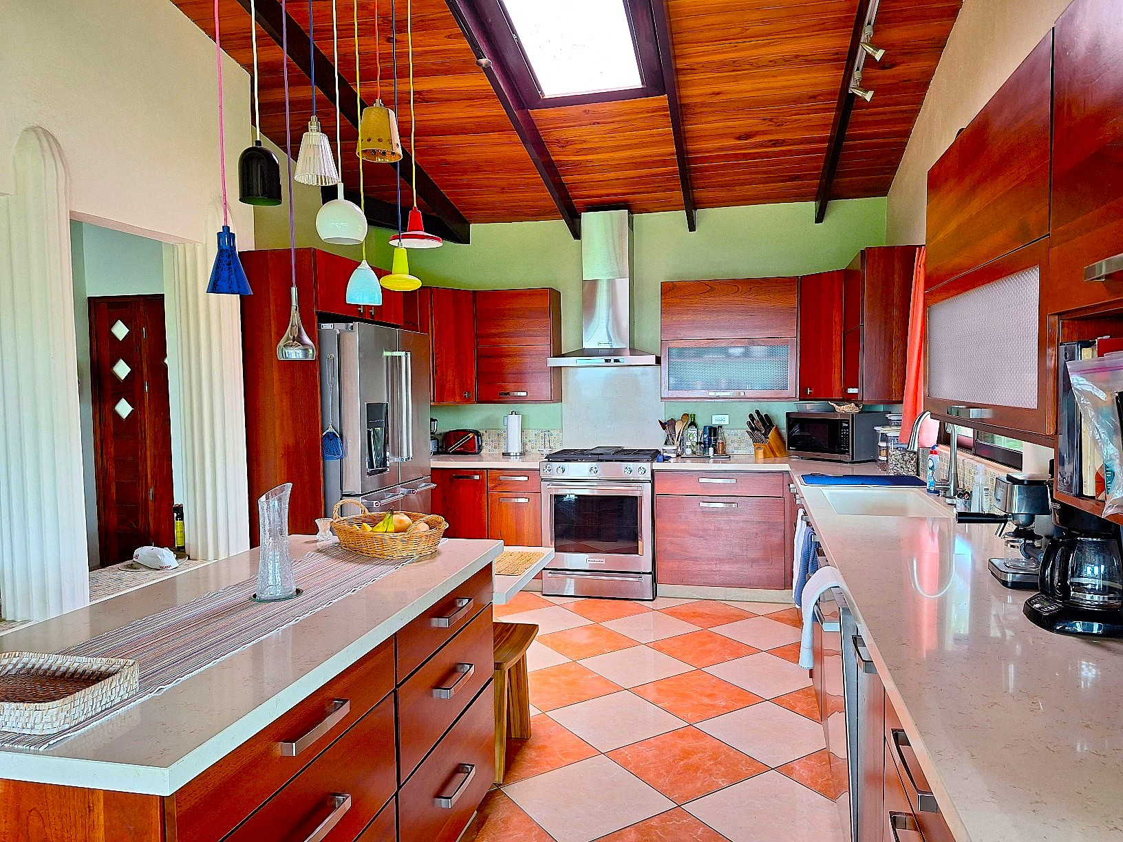 This spacious single-story country home has a large open floor plan with grand panoramic windows facing the breathtaking mountain and volcano views ahead. There is a completely remodeled luxury U-shaped kitchen with a large prepping island. The Lapitec countertops are known for its durability, made from the purest minerals found on Earth. The custom-made cabinetry is from solid quality cedar wood, with soft close doors and drawers. There are luxury pull-out cabinet organizers, blind corner lazy susan slide-outs, and many other incredibly handy features in this Chef’s Dream kitchen. It is equipped with only top line stainless steel appliances, a designer hood extractor, and an extra beer-fridge.