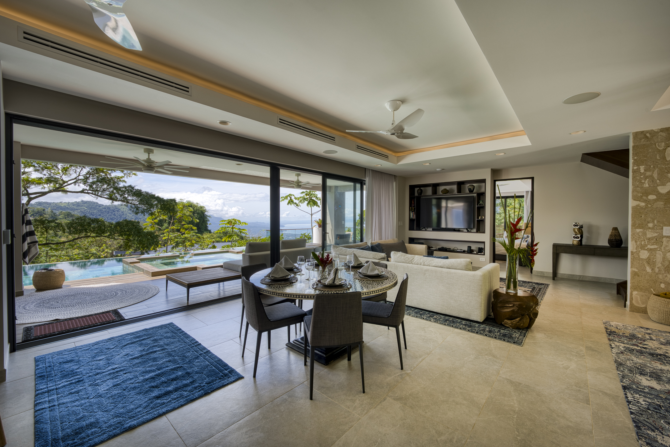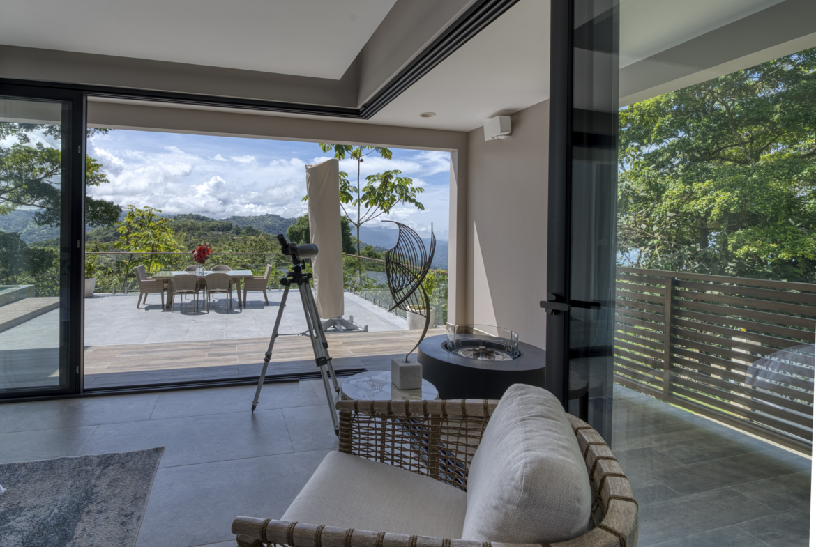 Sliding doors lead to the crown jewel: a heated infinity-edge pool and jacuzzi, perfectly positioned off the main terrace to share the awe-inspiring views. Whether you’re relaxing at sunset or under the stars, every moment feels curated by nature itself. Manicured tropical gardens attract hummingbirds and butterflies, preserving unobstructed vistas.