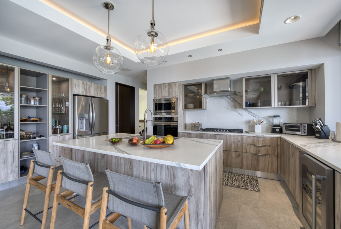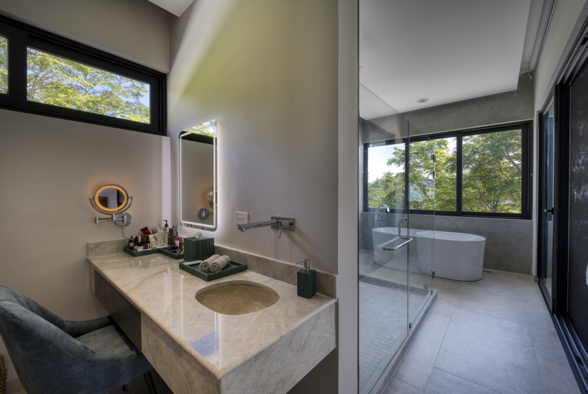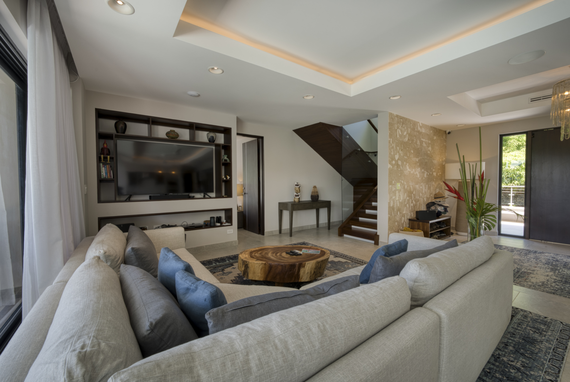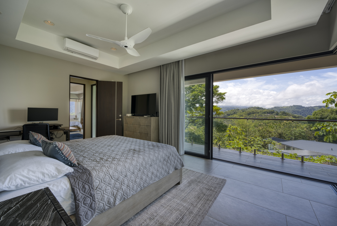 Costa Verde 4 BR Estate with Whale’s Tail View for sale. Nestled amidst the lush peaks of Escaleras, where the mountains meet the sea, discover this extraordinary sanctuary within Costa Verde Estates. More than a residence, it’s a daily ode to nature’s symphony. Awaken each morning on the terrace with freshly brewed Costa Rican coffee, greeted by the glistening Whale’s Tail coastline to the west and the thundering Diamante Waterfall to the east, while mountain streams murmur below. Completed in 2022, this expansive 8,000 sq ft architectural masterpiece seamlessly blends sleek contemporary design with the warmth of natural materials.