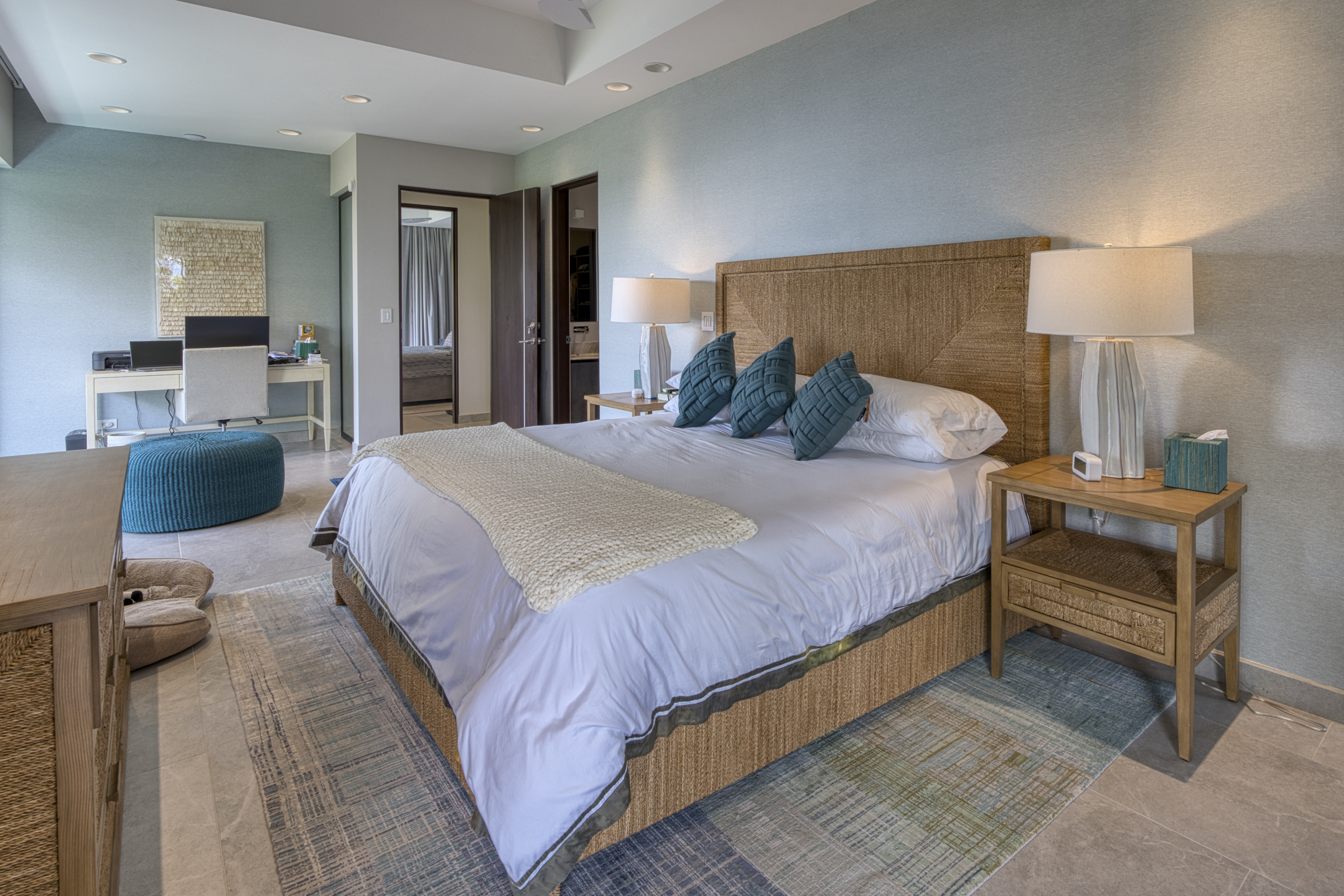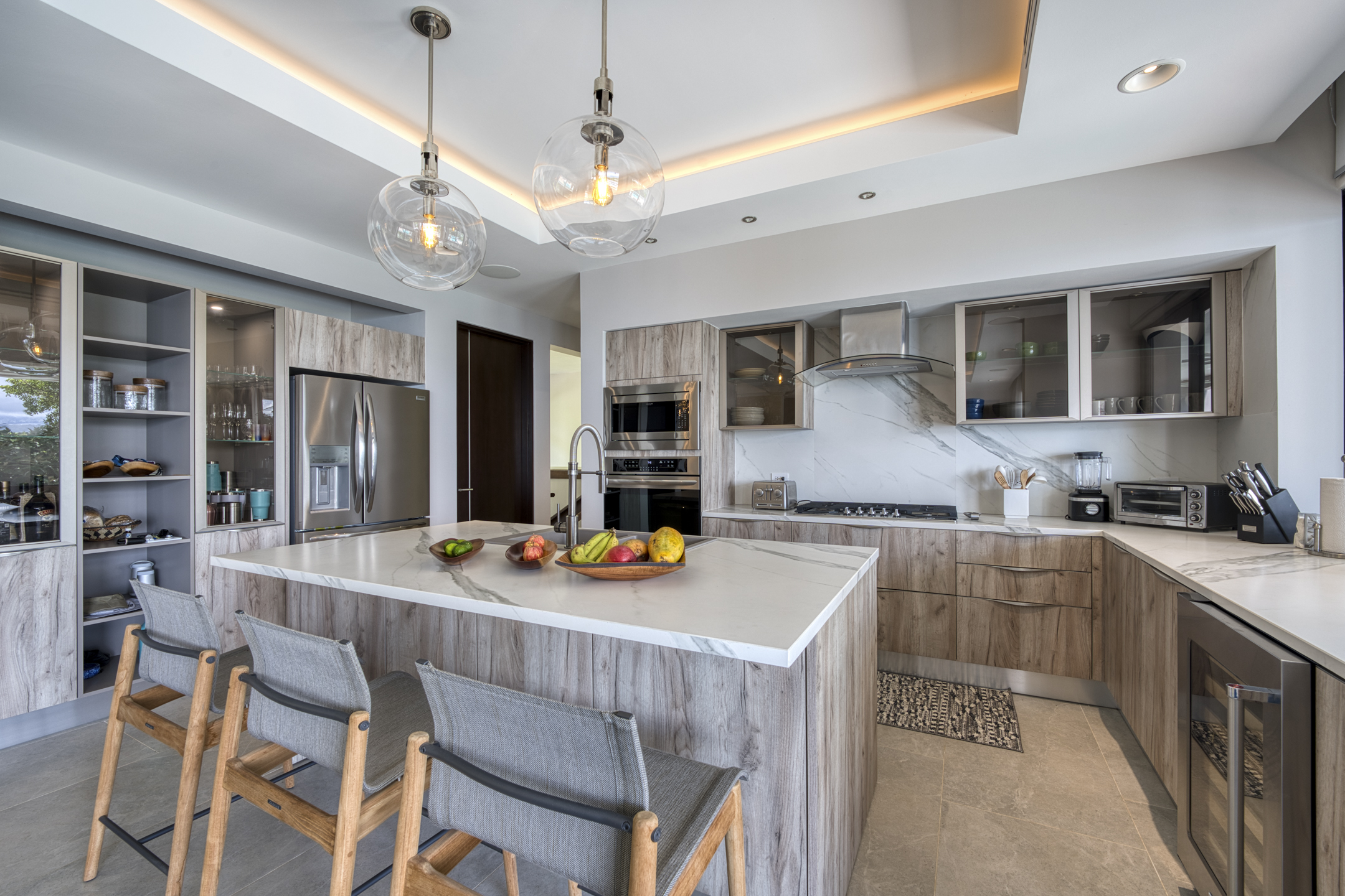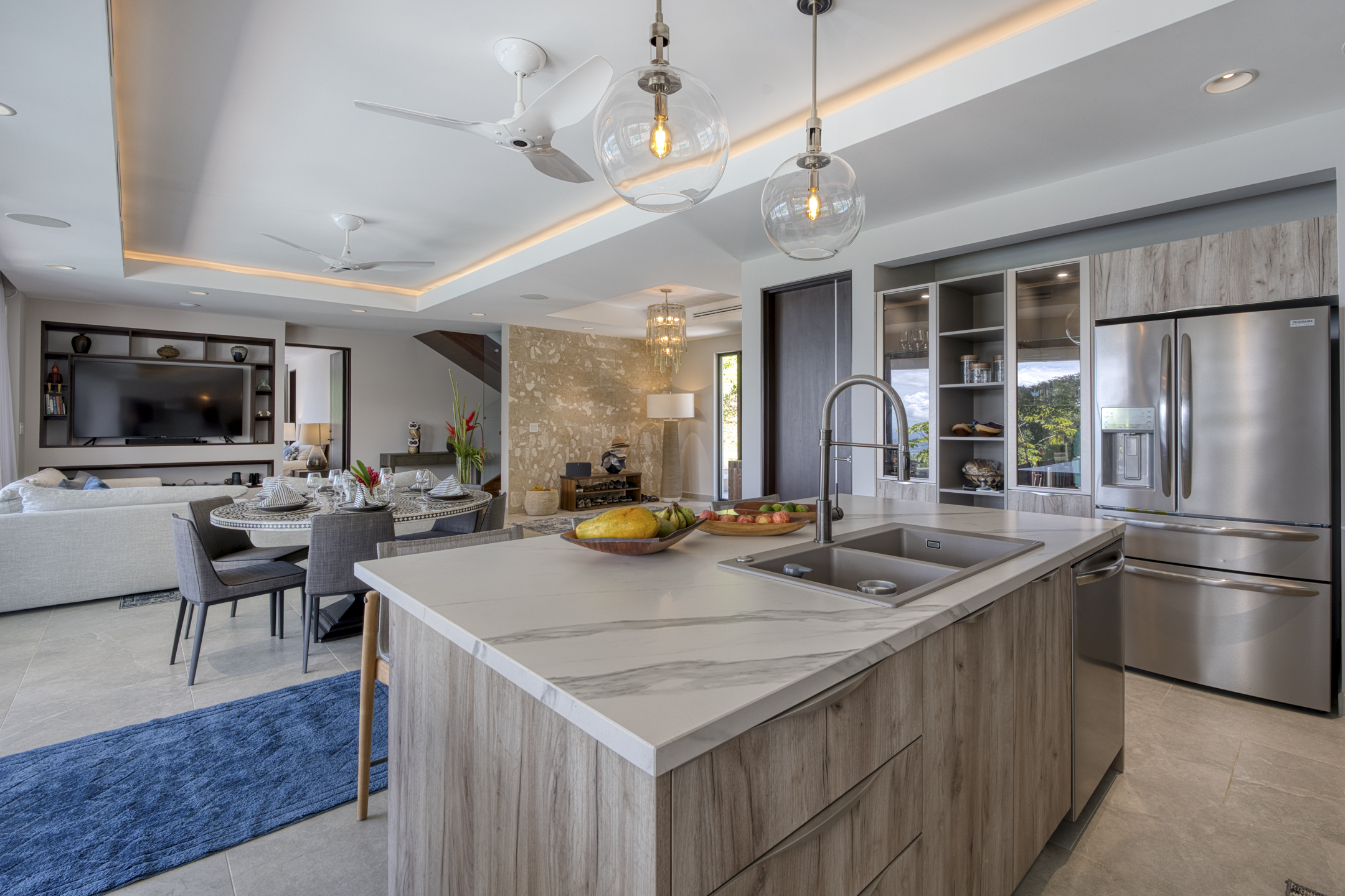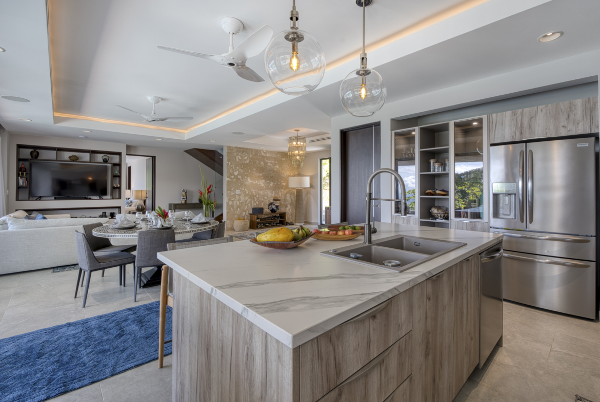 Boasting four spacious bedrooms and five refined bathrooms, privacy and comfort are effortless. An open floor plan bathed in sunlight connects the great room to a chef-grade kitchen adorned with premium appliances and elegant finishes, ideal for both intimate gatherings and grand celebrations. Floor-to-ceiling glass walls welcome tropical light and frame sweeping panoramas of the Pacific Ocean and verdant ridgelines, blurring the line between inside and out.