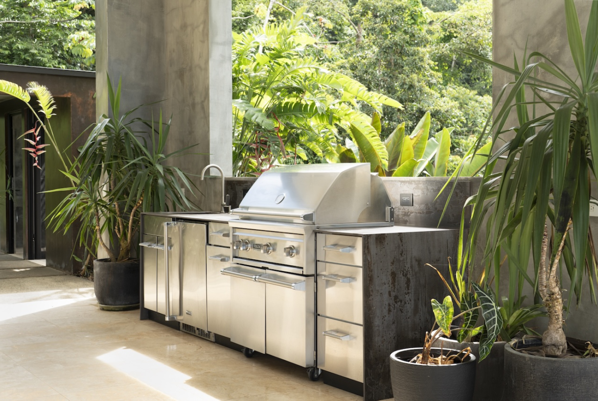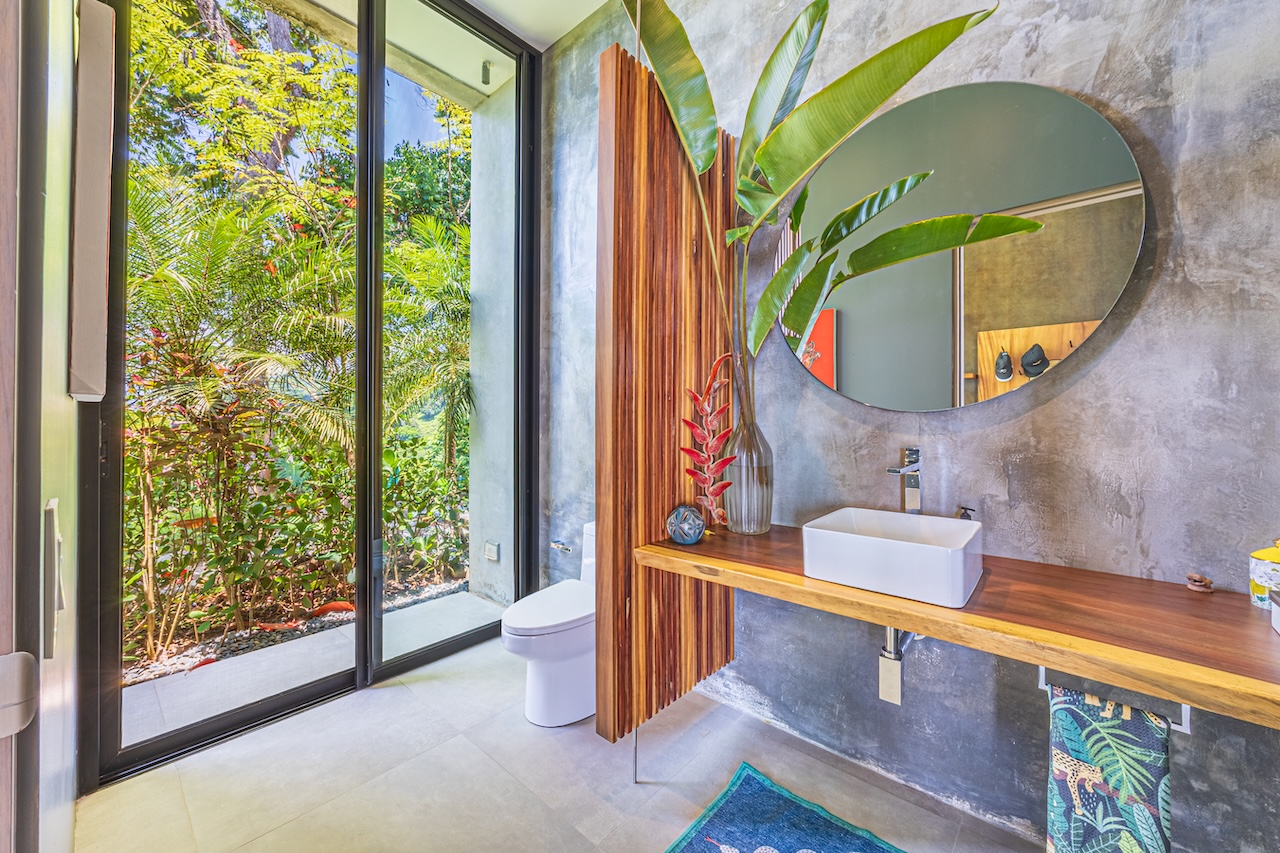 The culinary experience is further enhanced by the sleek, stainless-steel Viking outdoor kitchen and dining area. An adjacent outdoor spa retreat with a rain shower and cantilevered Balinese stone tub extends the home’s experience into the open air—an intimate sanctuary where privacy is absolute, and the jungle is your only witness. Stone paths wind throughout the property, revealing curated tropical fruit and floral gardens, dissolving boundaries between architecture and landscape.