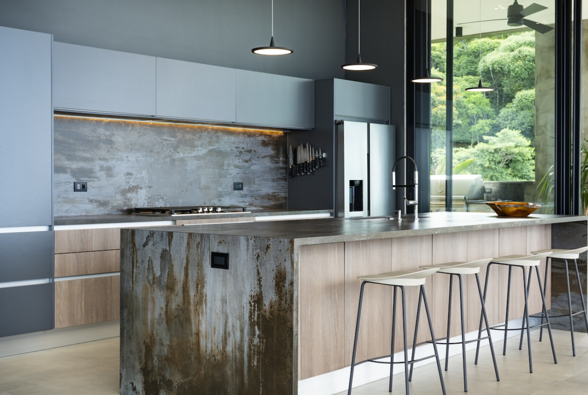A dramatic steel pivot door, echoing the custom entry gate, sets the tone upon arrival and reveals the striking simplicity of the main level. Eleven-foot ceilings with floor-to-ceiling sliding glass doors surround an open-plan Dekton-clad kitchen, dining, and living area that extends beyond to the saltwater infinity-edged pool, its seamless Balinese Sukabumi tile encased in lava stone, flowing like sculpture into the horizon.
