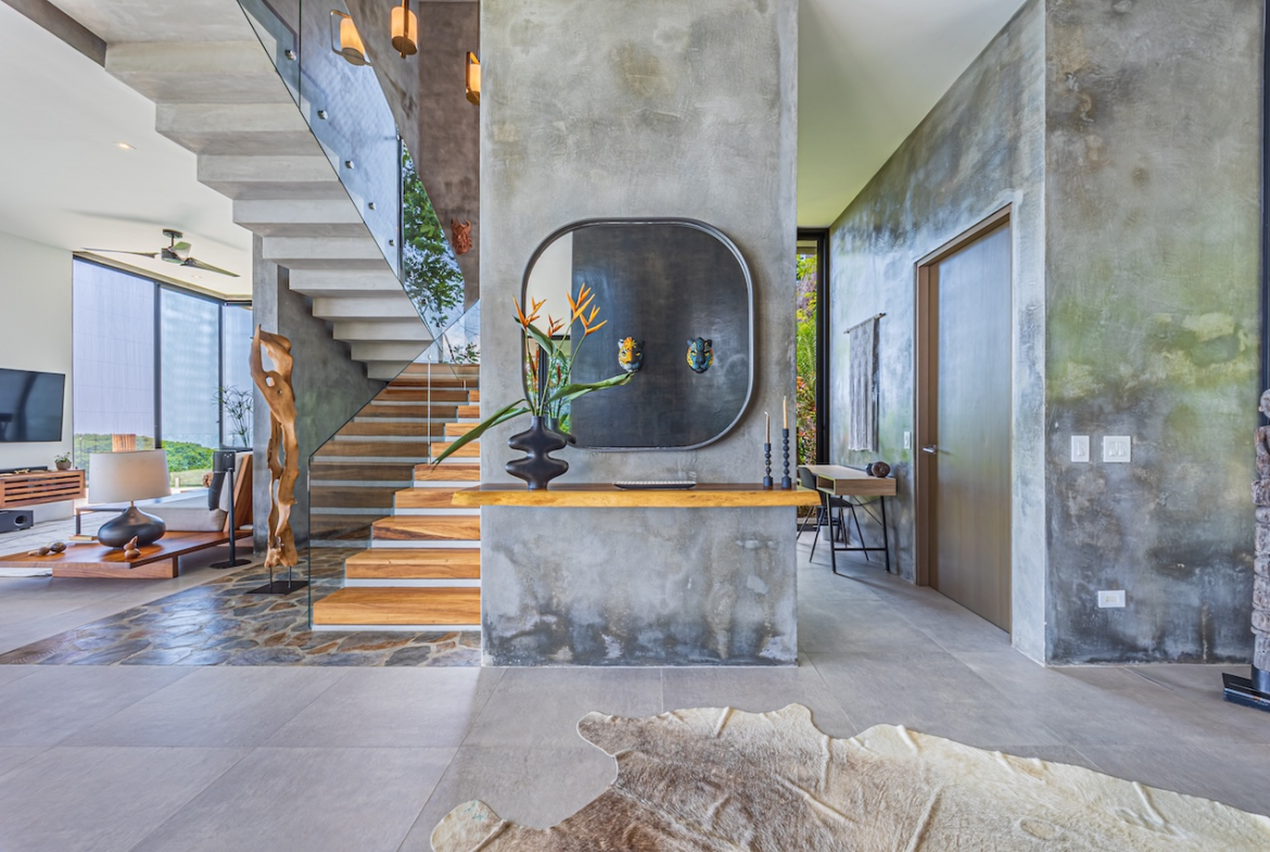 Ascending the concrete staircase to the second level reveals four serene bedrooms that rise high above the canopy, each with extraordinary views. The primary suite features a lava stone-encased double rain shower with sweeping 180-degree vistas, a private patio, and a generous walk-in closet. A junior primary with an ensuite bath opens to the spacious travertine-covered terrace overlooking the undulating Whale Tail. Two additional guest rooms with shared bath complete the package, offering refined comfort and privacy. Sustainability complements design.