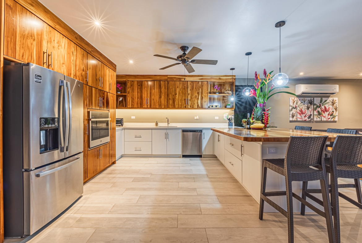 Step inside to a fully furnished interior adorned with custom hardwood accents, elegant tile flooring throughout, and modern amenities. The expansive main floor boasts a gourmet kitchen with a full-sized oven, gas cooktop, refrigerator, microwave, toaster, coffee maker, and blender—ideal for preparing exquisite meals. Relax in the living area with large flat-screen LED TVs, or dine al fresco on sun decks with panoramic jungle and ocean vistas.