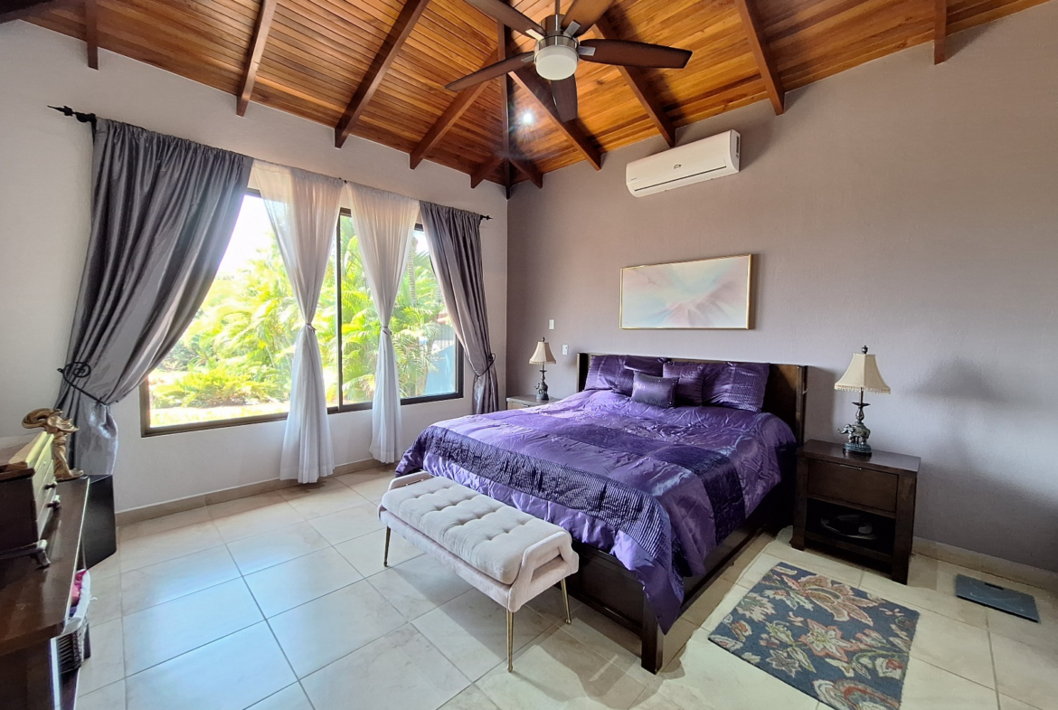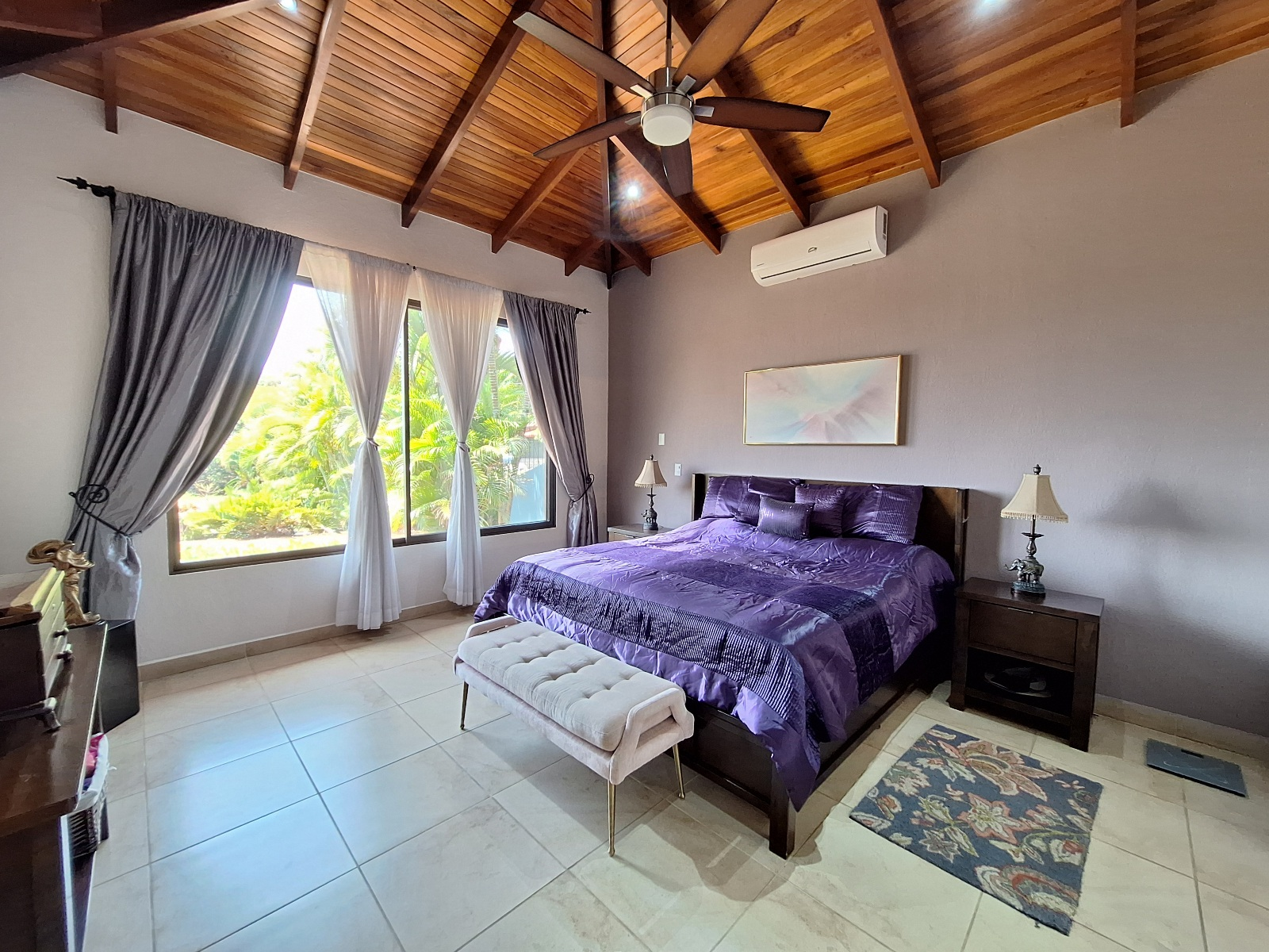 The master bedroom with a king-size bed is very spacious with a walk-through closet and a luxury en-suite bathroom with a quartz double vanity sink and a large walk-in shower with a bench. The views from the master bedroom are precious.