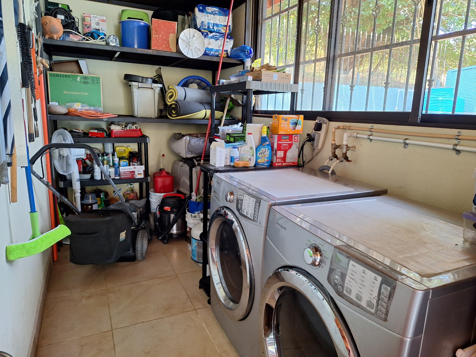 Beautiful lawns and manicured, colorful gardens surround this elegant home, with just enough space to keep it all low-maintenance. The property measures 722 m2 (7771 sq.ft), is completely fenced in, with access through an electric wrought iron gate. There is a carport for private parking with direct access to the house’s back entrance. The oversized laundry room has a washer, dryer, and plenty of storage space.