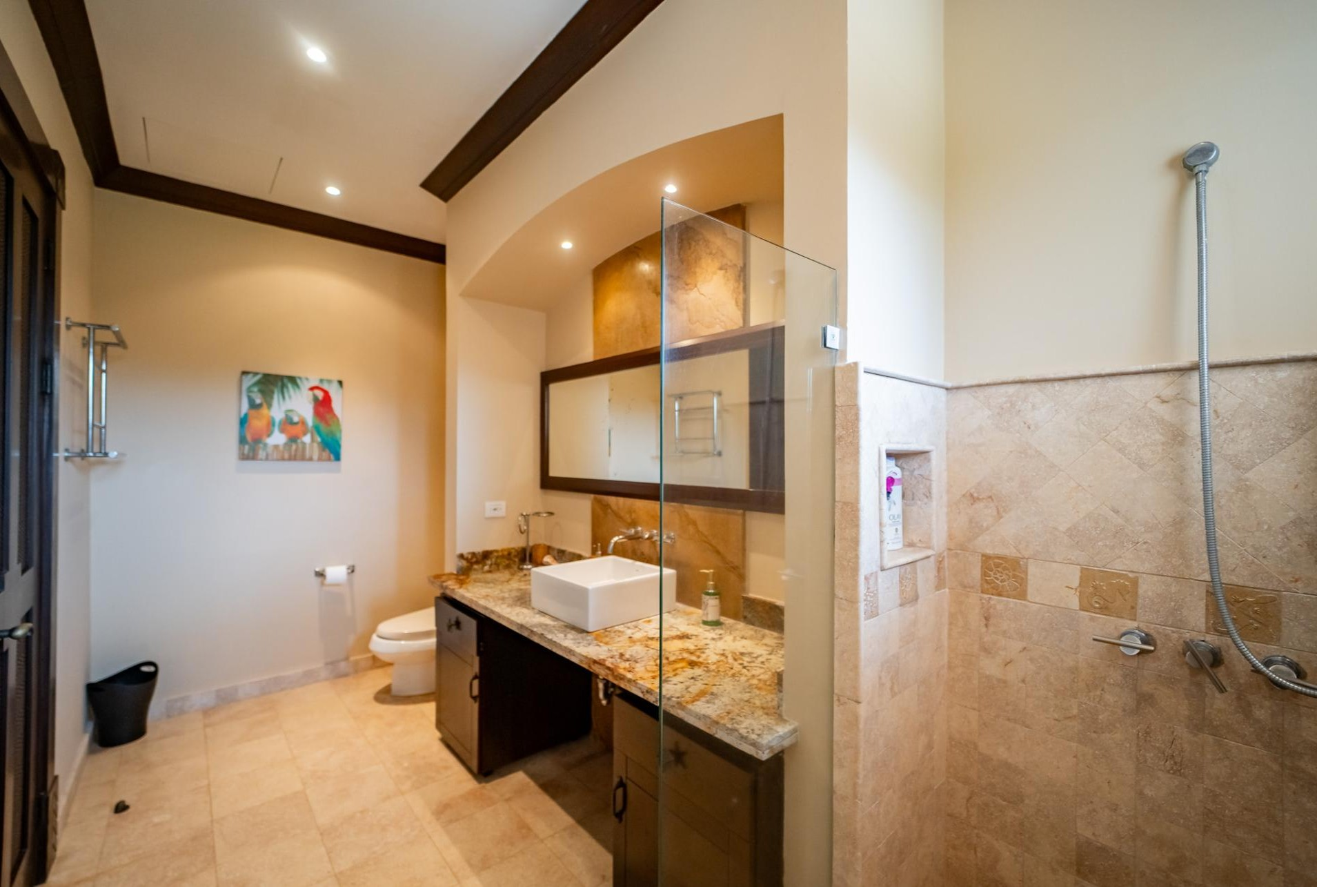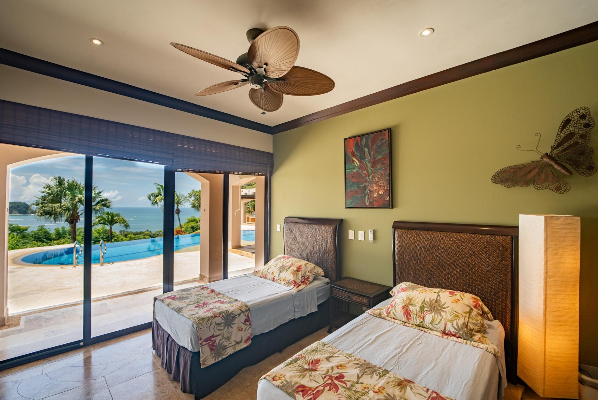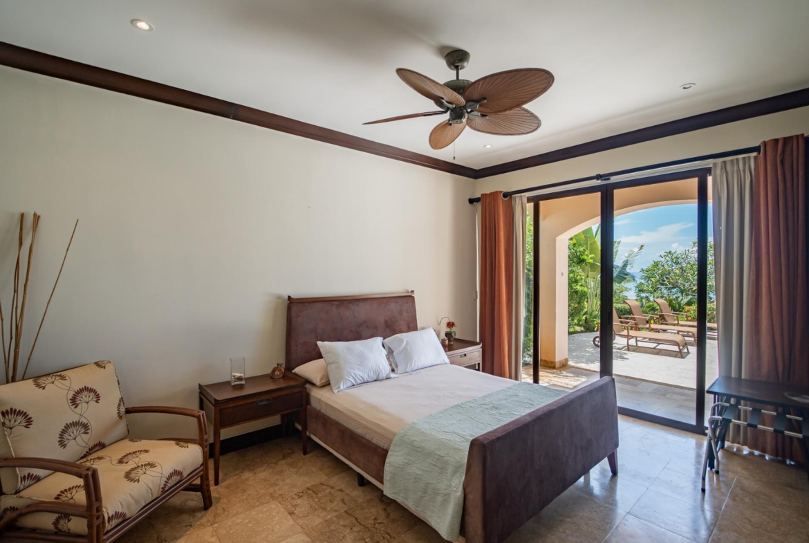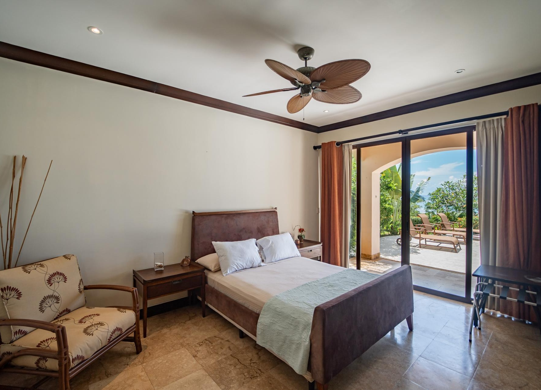 Each bedroom enjoys sweeping views of Sámara Bay and Isla Chora, with two master suites offering large ensuite baths and private balconies. The lower-level bedrooms were thoughtfully designed to accommodate wheelchair access, ensuring comfort and inclusivity for all guests.
