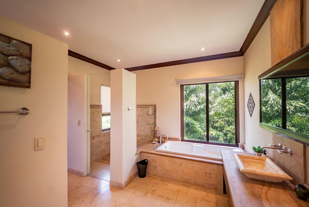 The villa features a fully equipped gourmet kitchen with a temperature and humidity-controlled pantry, expansive living and dining areas, and floor-to-ceiling glass doors that open to a 40-foot saltwater infinity pool and outdoor dining spaces. Multiple terraces, a covered BBQ kitchen, and a rooftop sunset deck make it ideal for entertaining, while lush gardens and towering palms attract monkeys, macaws, and hummingbirds to your doorstep.