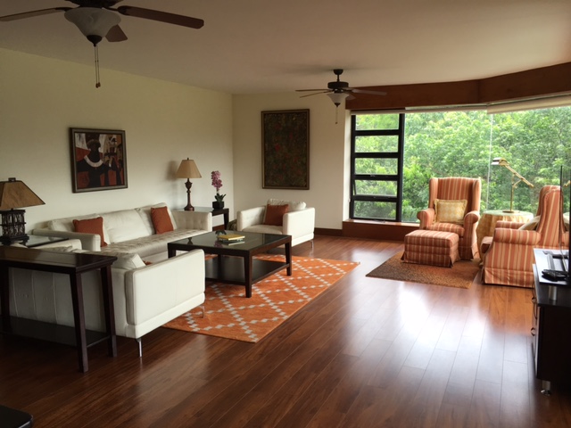 Quality large apartment with big balcony overlooking the Escazu Country Club and golf course .Excellent views to golf and trees .Very peaceful setting ,even walk to club.3 large bedrooms plus big maids .Light living with enormous windows .Big kitchen .Well run apartments with mainly owners living there .Usually older people so quiet . Elevator plus freight elevator at back to back of unit .Wheel chair access even .large parking area with two places . Good sized balcony which is protected from the wind . Completely furnished included in the sale .