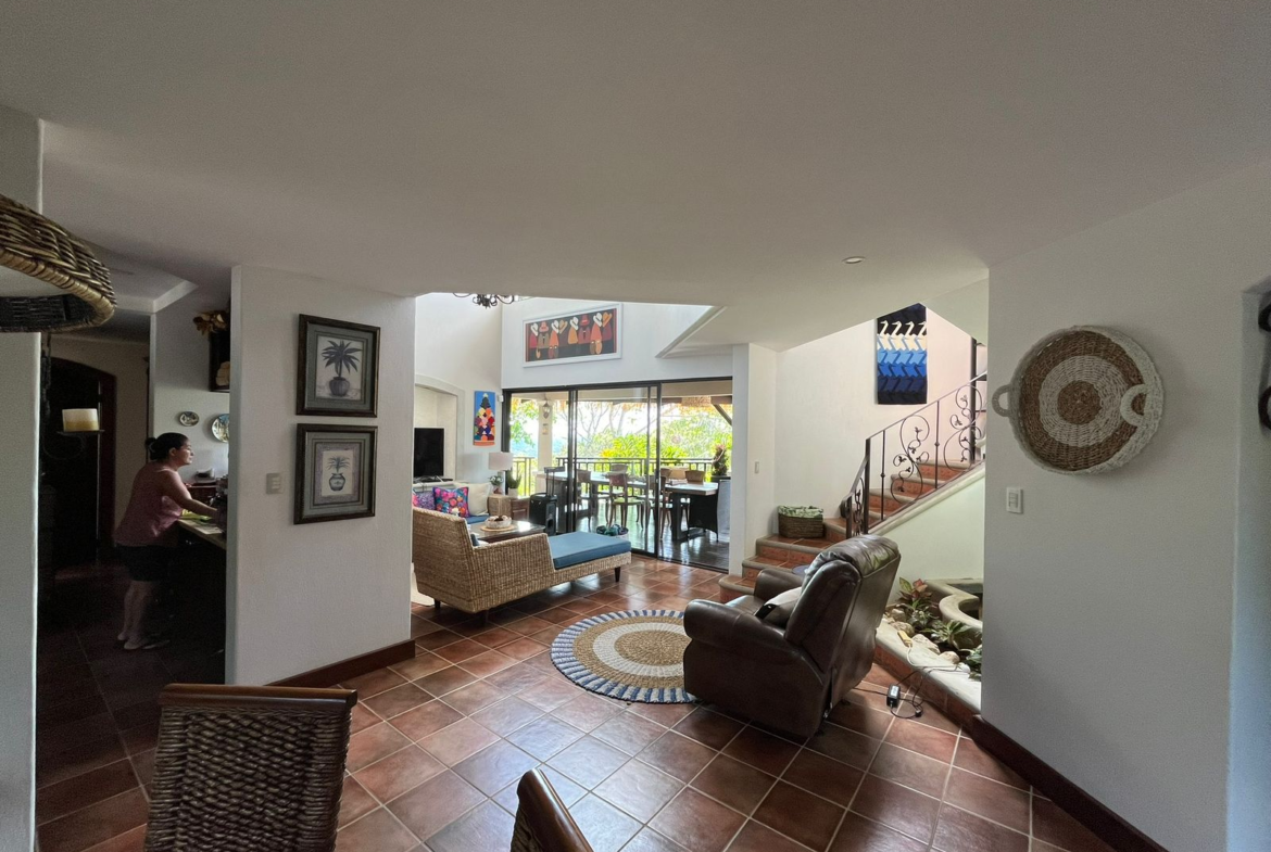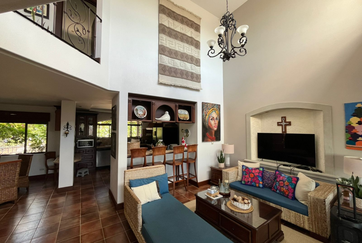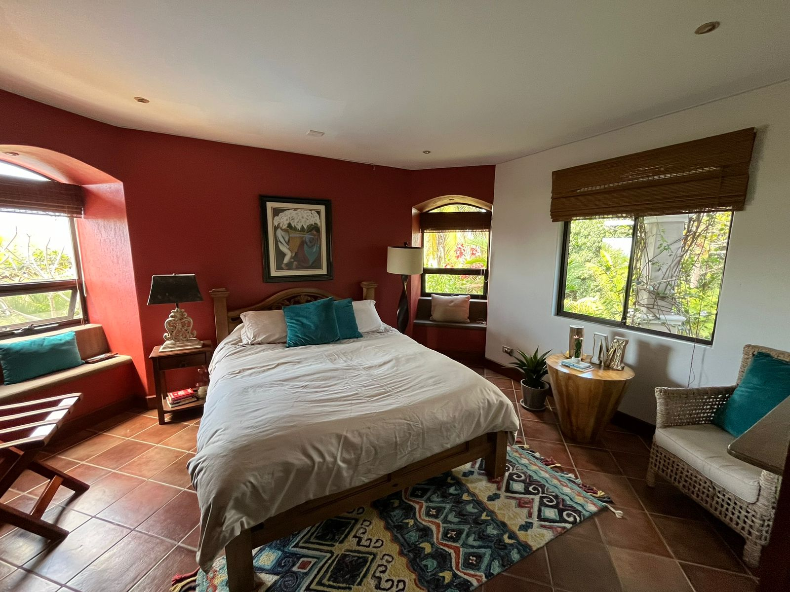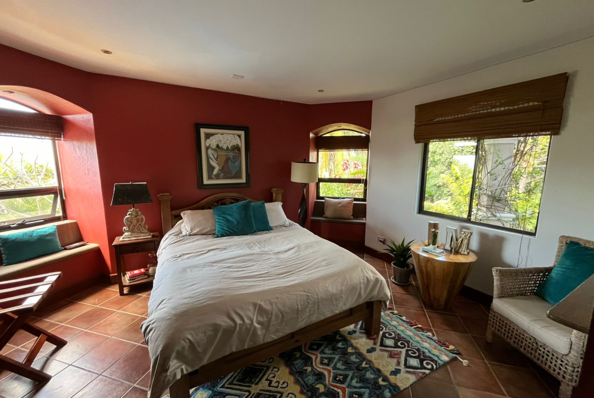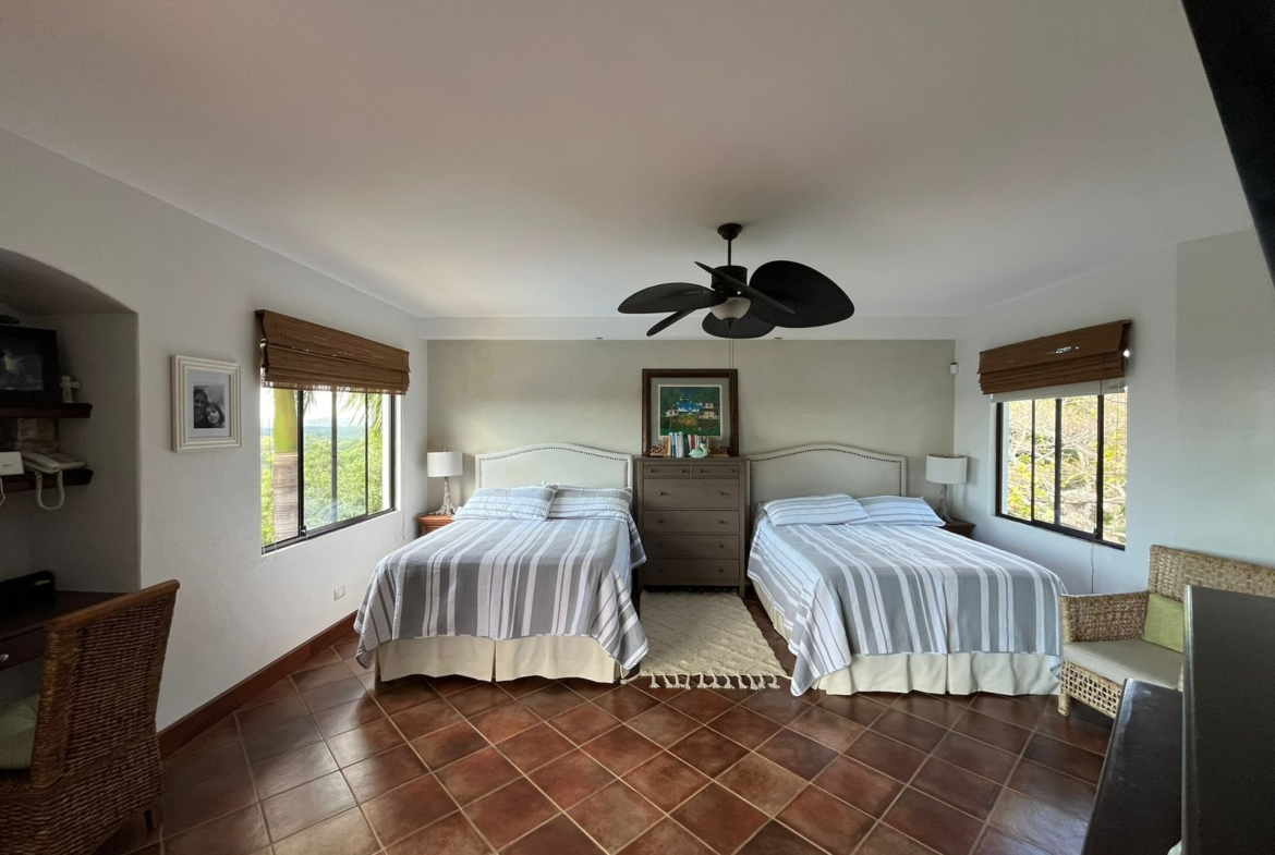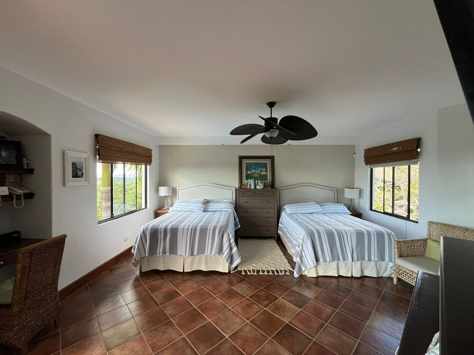 The spacious gardens, with their green spaces, enhance the place’s serenity. The two-story main house has 3 bedrooms and 4.5 bathrooms. The master bedroom includes a walk-in closet, and one of the bedrooms is conveniently located on the ground floor. It features a second-floor terrace with stunning views.