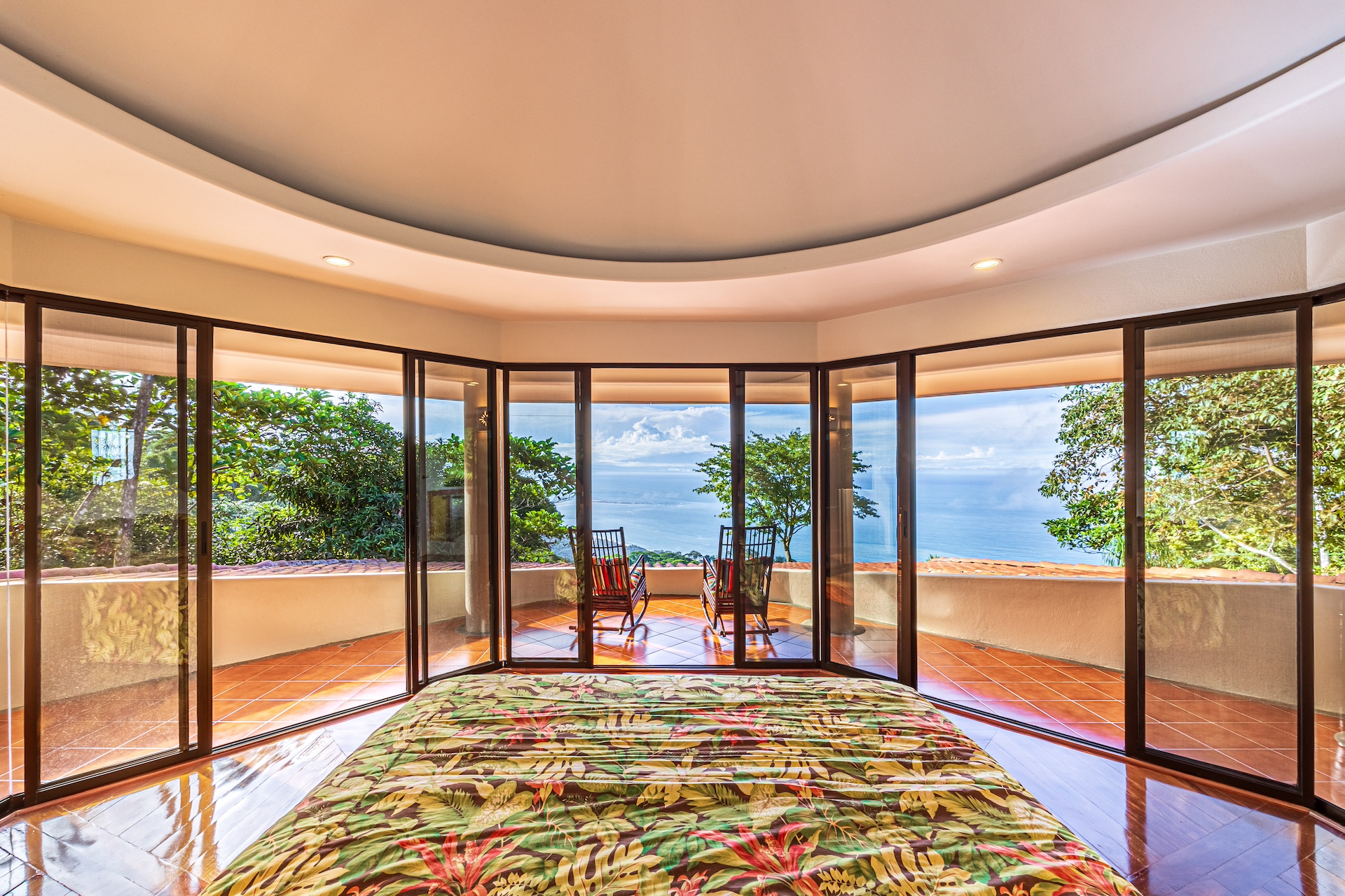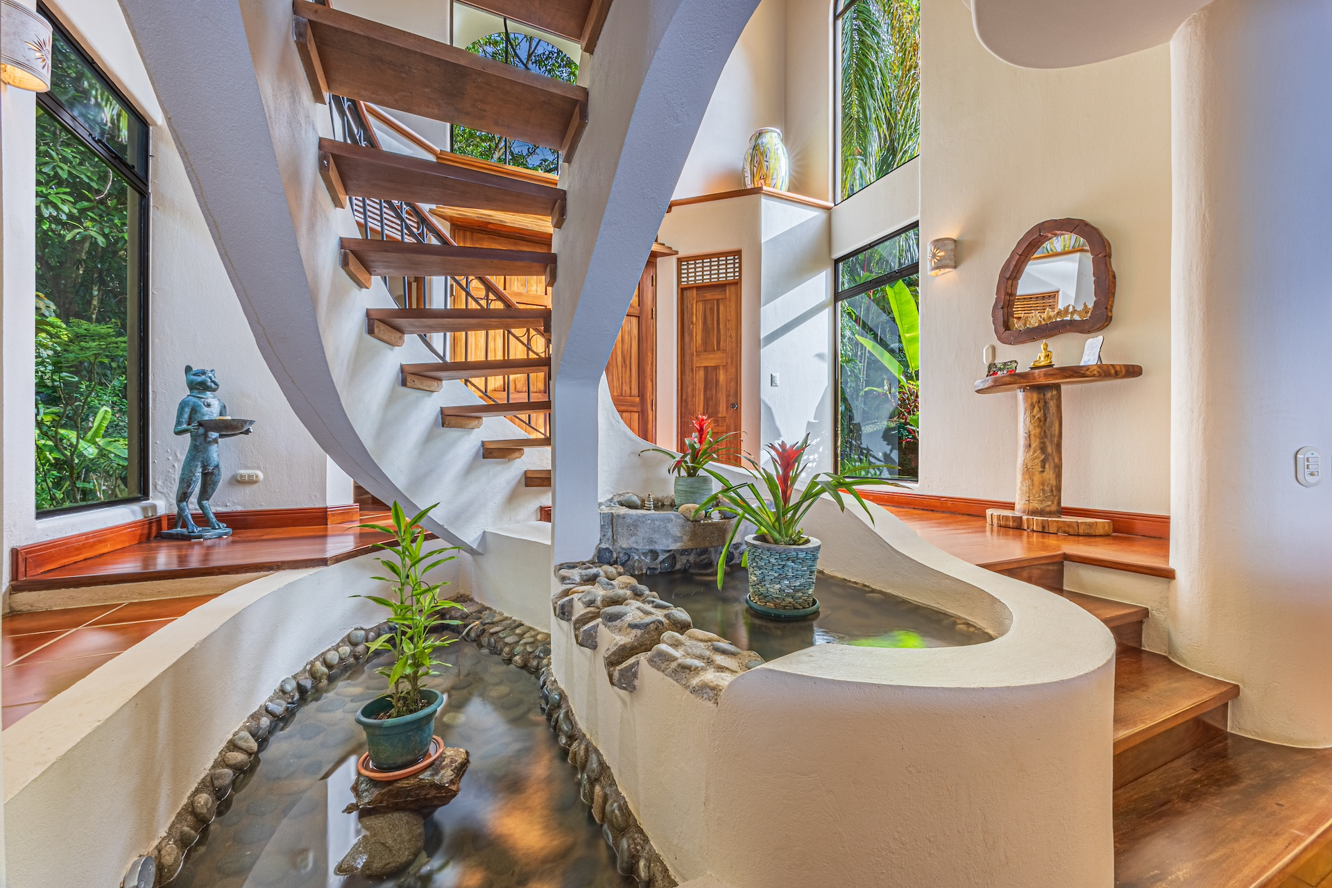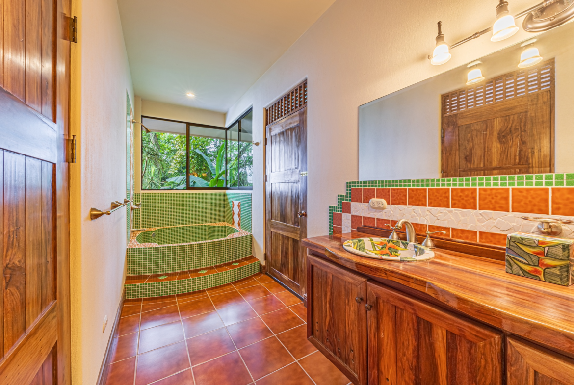 Upon entering the Dominical residence, one is immediately enveloped in sophistication, with a grand two-story foyer showcasing a stunning domed fresco ceiling and an elegant circular staircase framed by intricate wrought iron railings and rare hardwood floors. Ascending to the primary suite—an expansive domain that occupies the entirety of the second floor—guests are treated to a wrap-around balcony that offers sweeping views and an intimate connection with the local wildlife, including playful monkeys and vibrant toucans. The luxurious ensuite features intricate mosaics, a double vanity, a clawfoot tub, and an outdoor shower, creating an oasis of serenity. A spacious walk-in closet adorned with bespoke teak cabinetry adds an element of refined practicality.