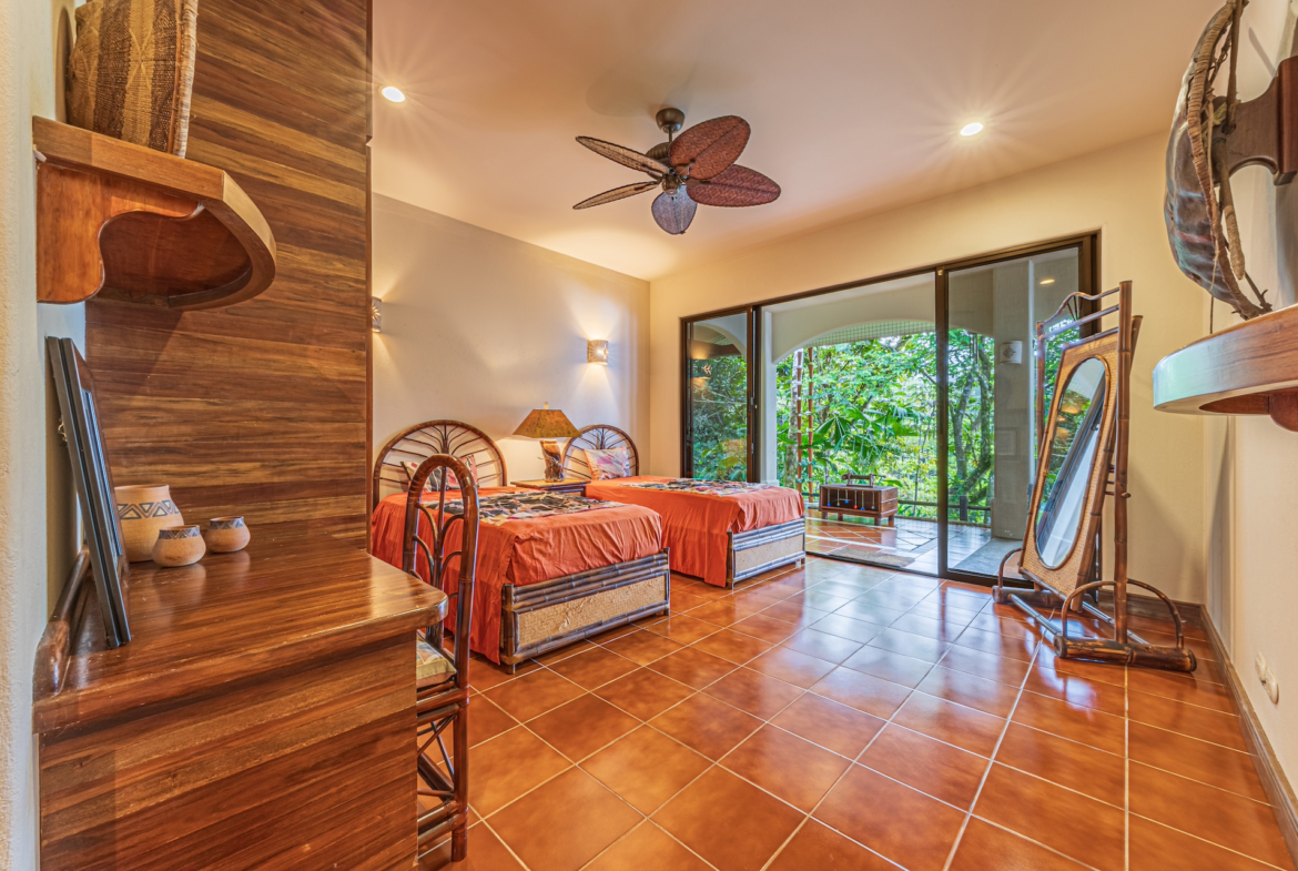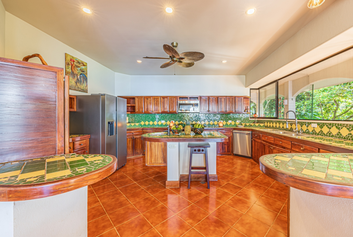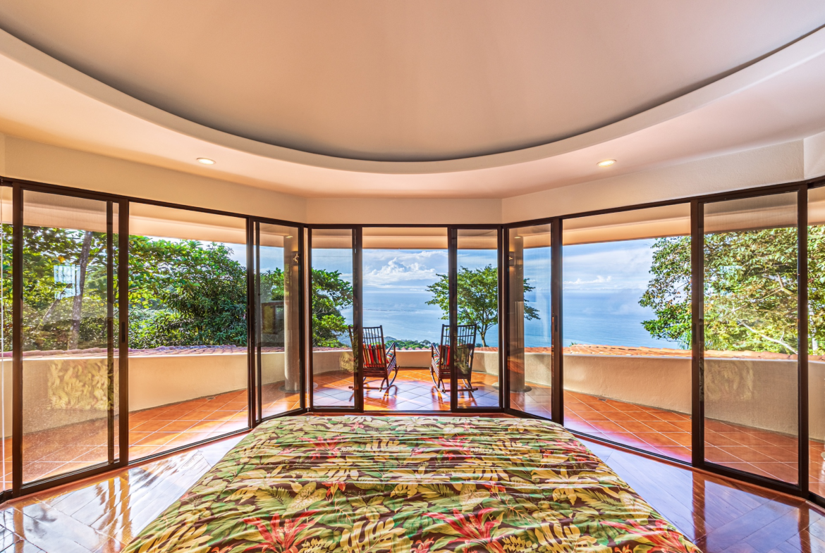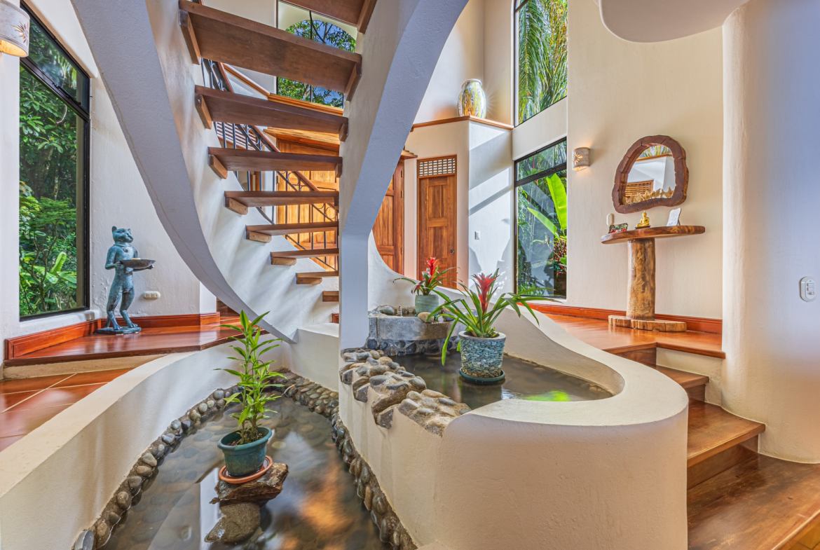 Upon entering the Dominical residence, one is immediately enveloped in sophistication, with a grand two-story foyer showcasing a stunning domed fresco ceiling and an elegant circular staircase framed by intricate wrought iron railings and rare hardwood floors. Ascending to the primary suite—an expansive domain that occupies the entirety of the second floor—guests are treated to a wrap-around balcony that offers sweeping views and an intimate connection with the local wildlife, including playful monkeys and vibrant toucans. The luxurious ensuite features intricate mosaics, a double vanity, a clawfoot tub, and an outdoor shower, creating an oasis of serenity. A spacious walk-in closet adorned with bespoke teak cabinetry adds an element of refined practicality.