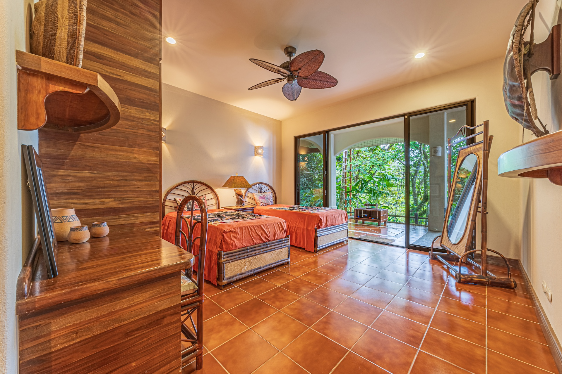 Flanking either side of the home are spacious guest suites, each designed with custom teak cabinetry and private access to covered patios, offering enchanting views of the jungle and ocean. A picturesque garden courtyard, linked by a covered walkway, separates the residence from the two-car garage and a well-equipped laundry and service area.
