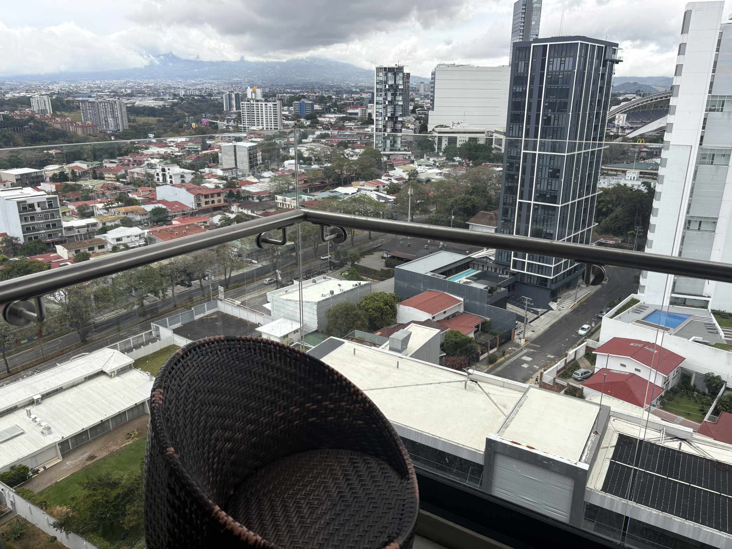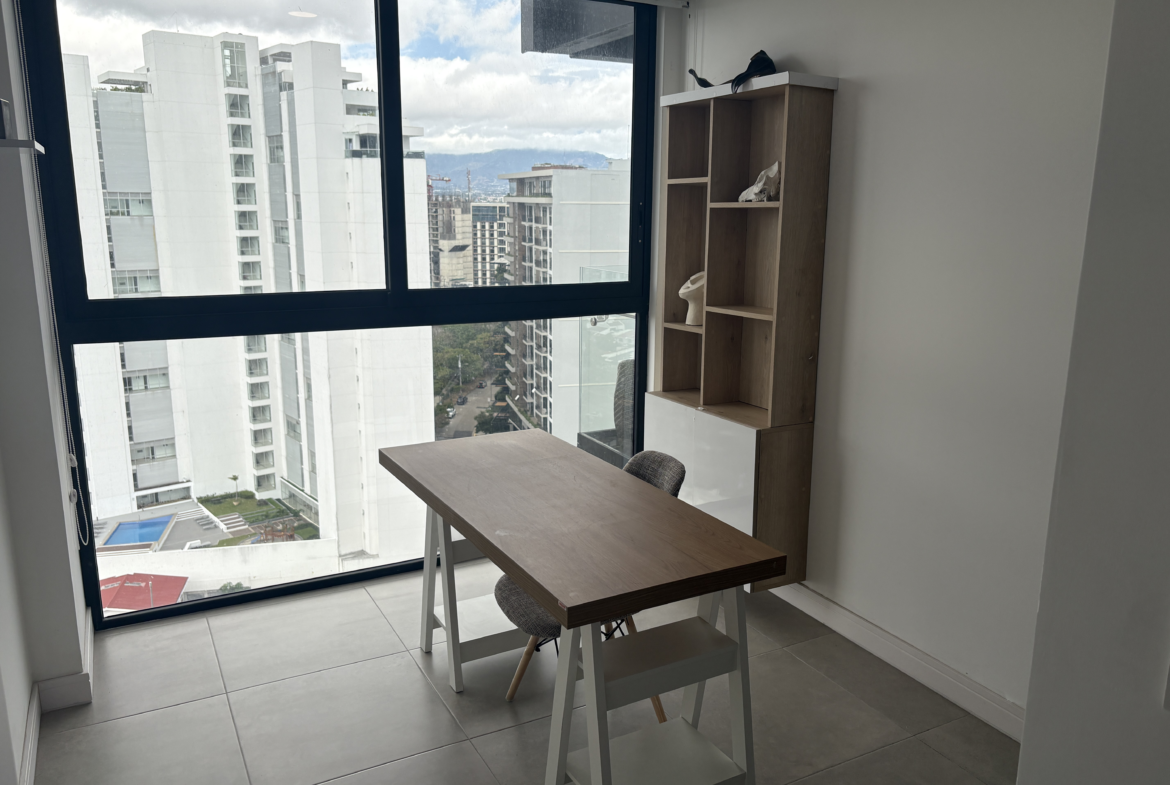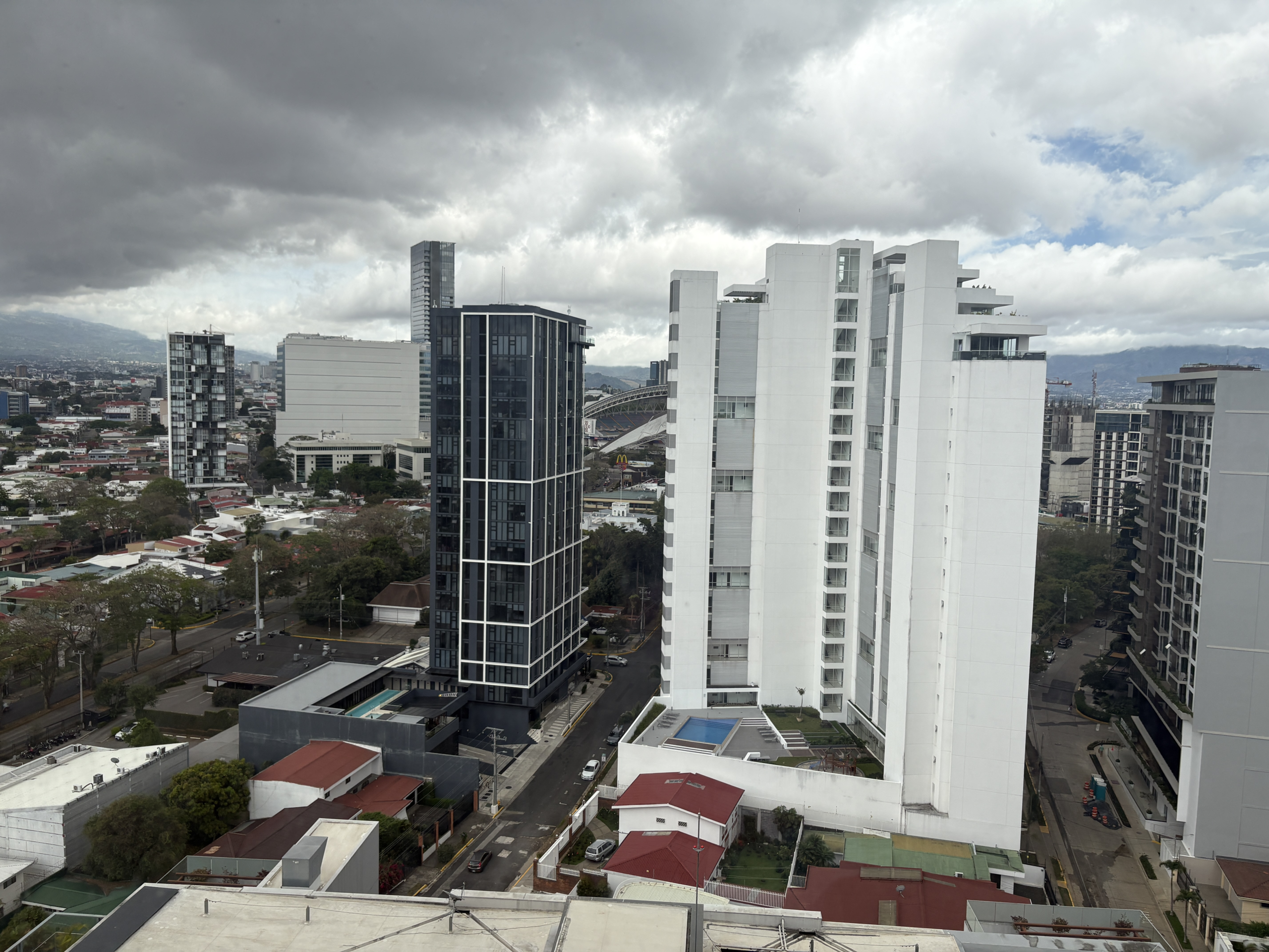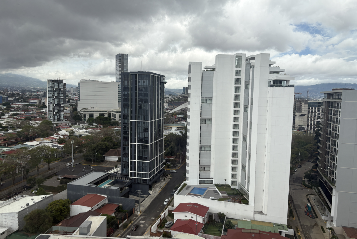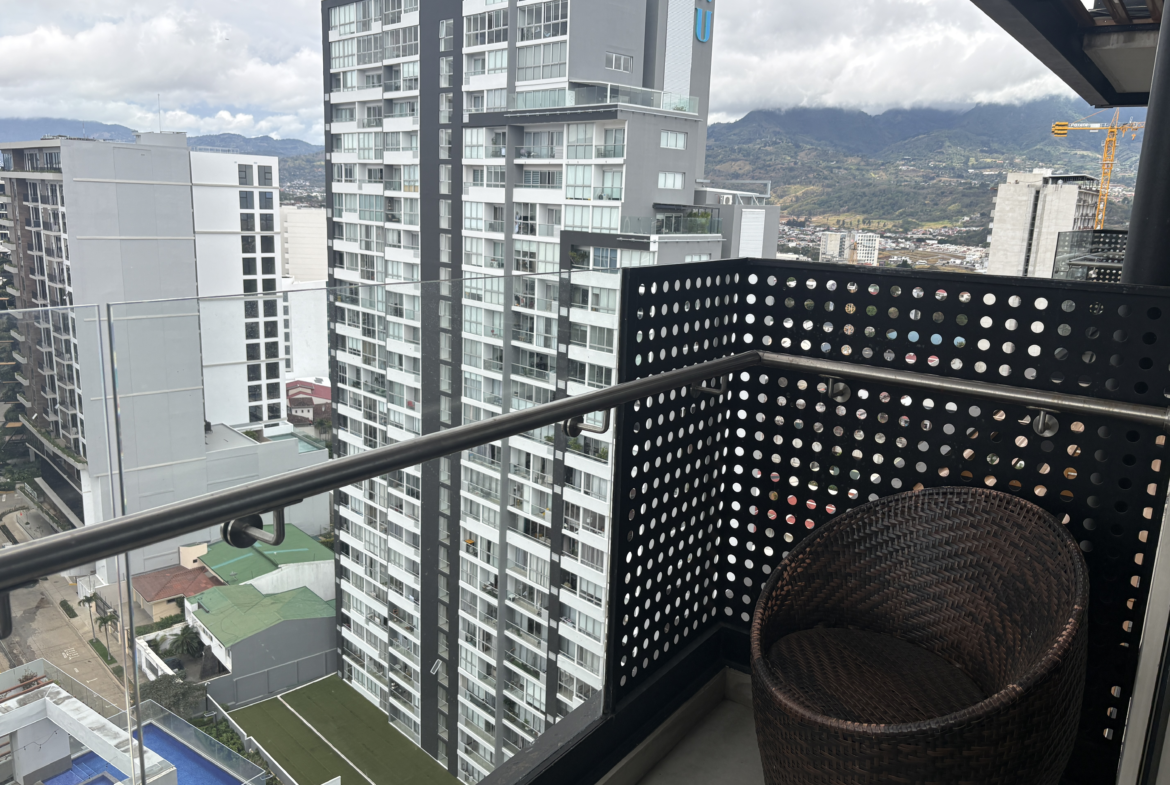 This turnkey residence features a bright, open-concept living and dining area, complemented by floor-to-ceiling windows that frame panoramic views of San José and the surrounding mountains. The private balcony is ideal for enjoying sunsets high above the city.