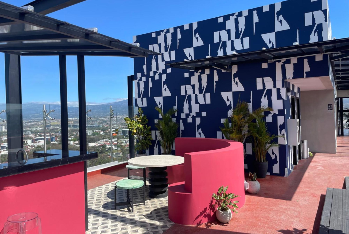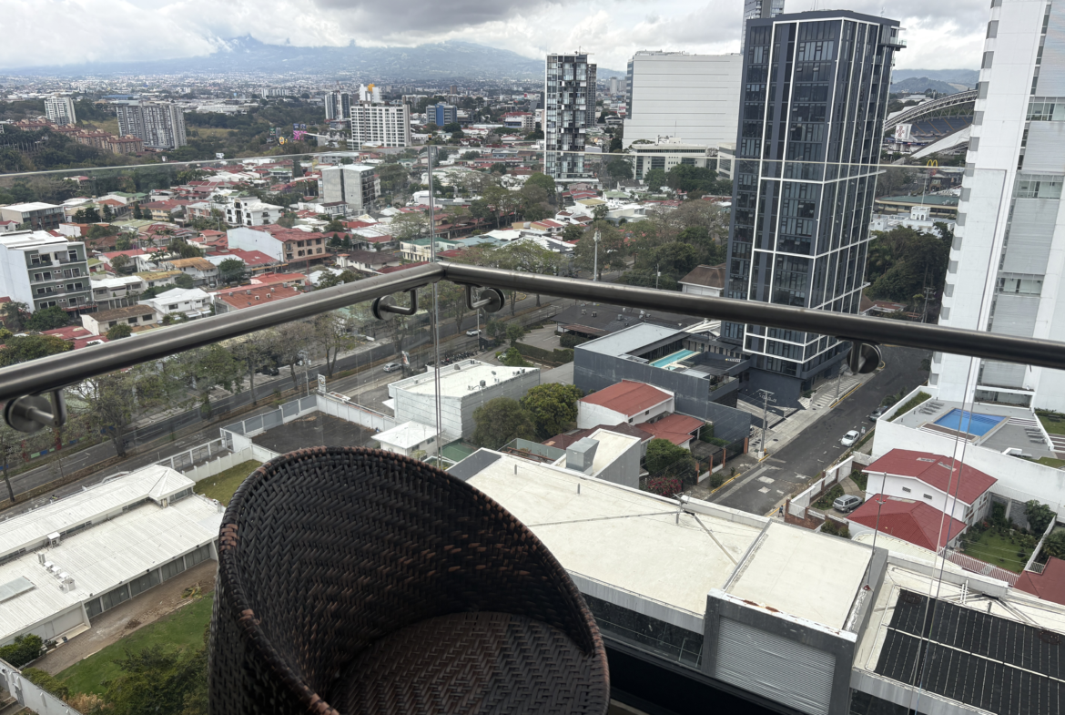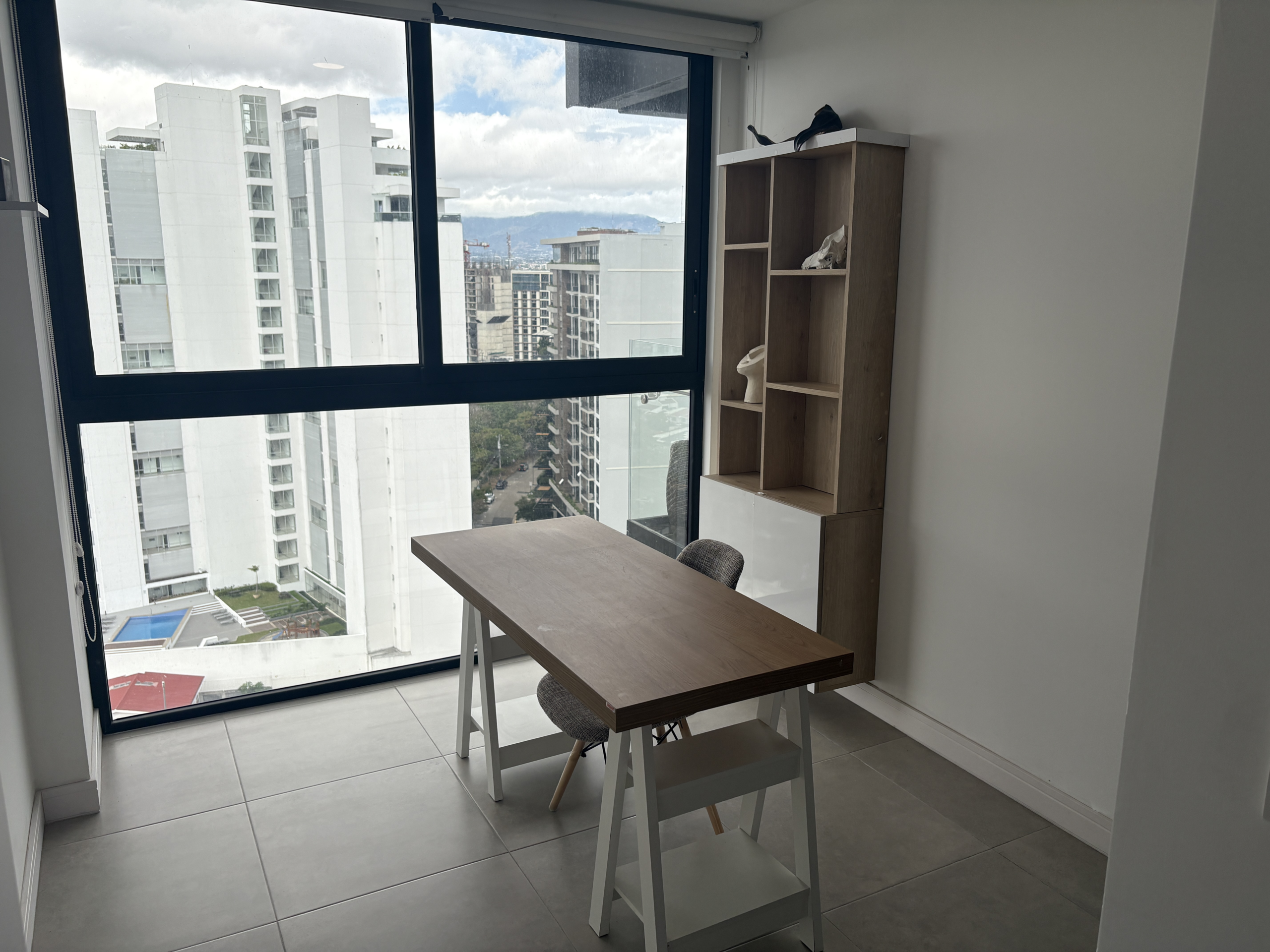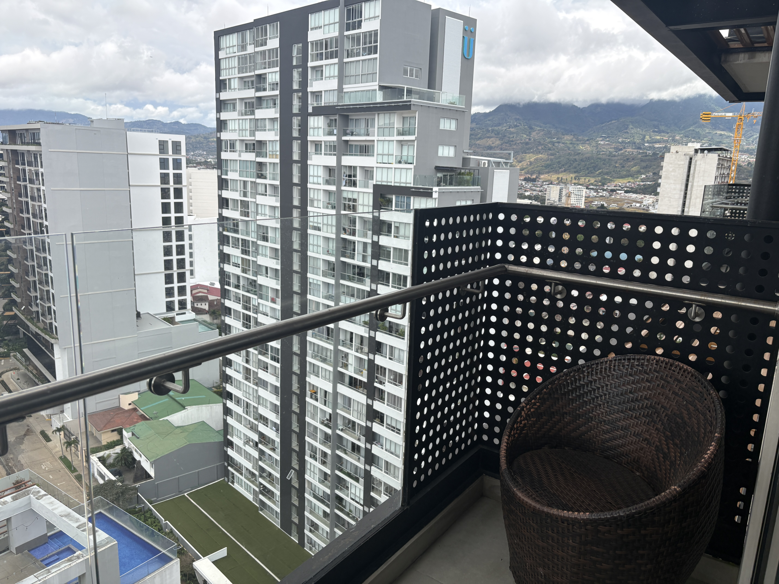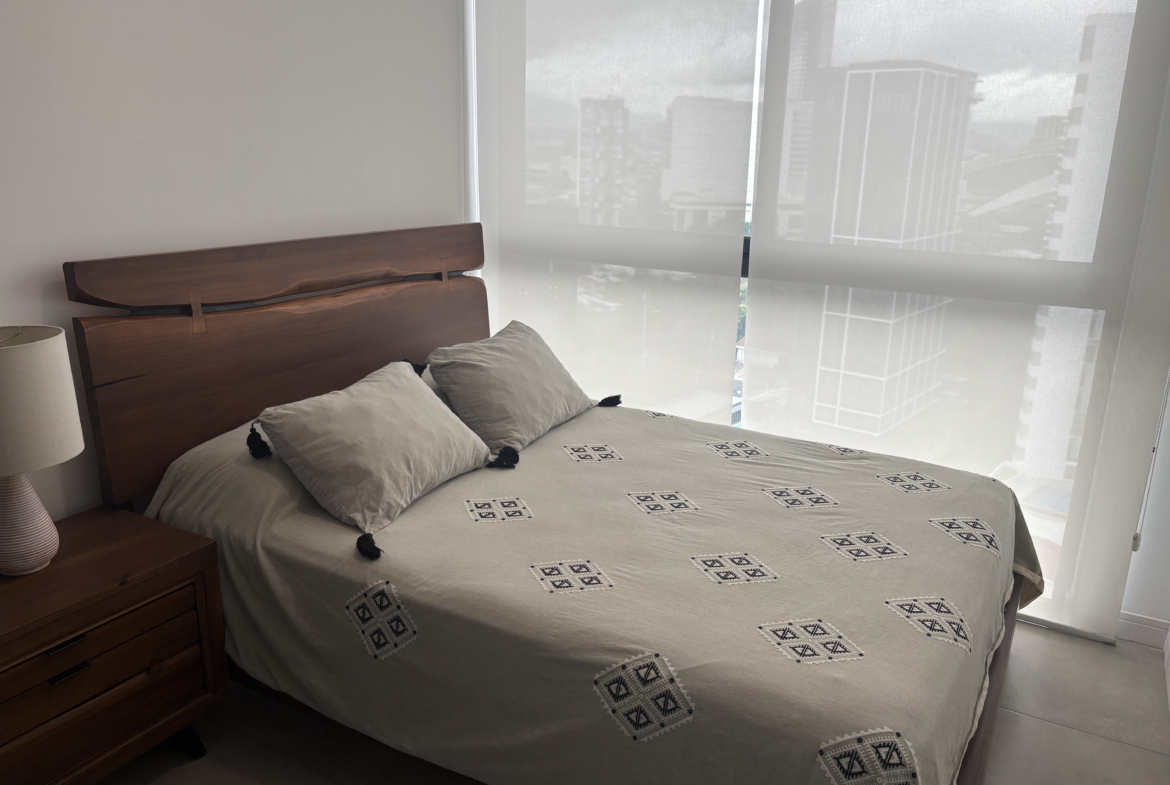 This turnkey residence features a bright, open-concept living and dining area, complemented by floor-to-ceiling windows that frame panoramic views of San José and the surrounding mountains. The private balcony is ideal for enjoying sunsets high above the city.