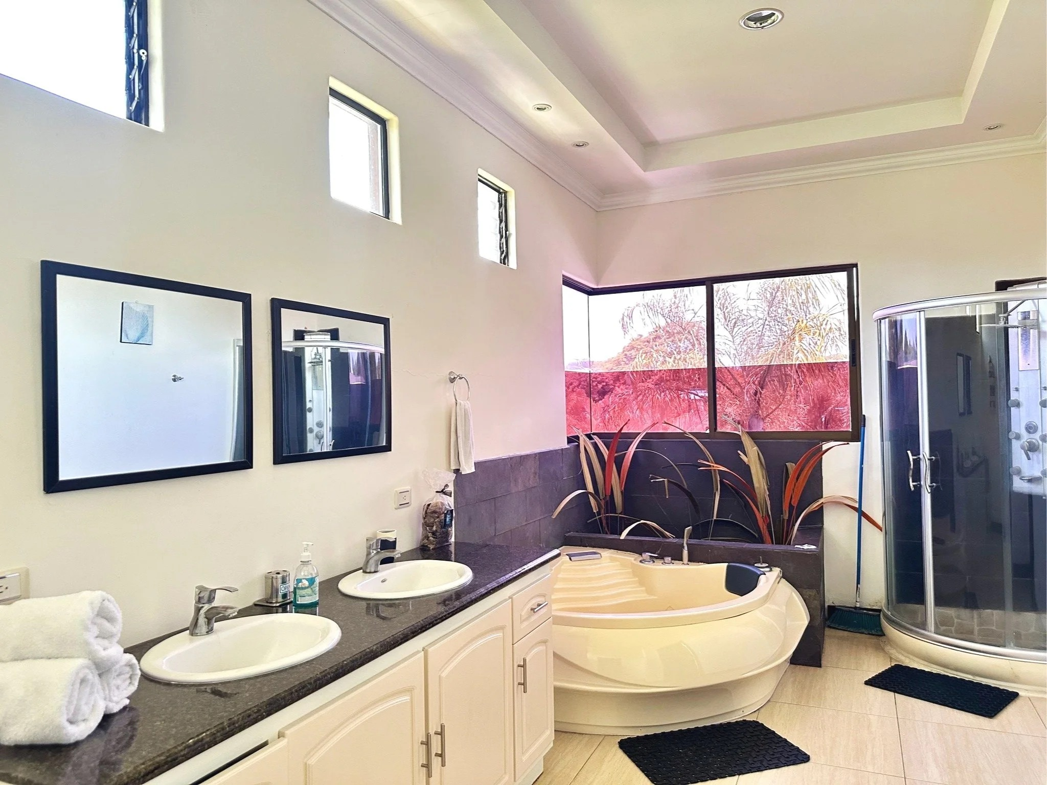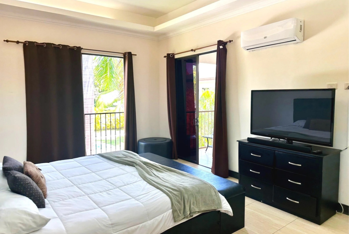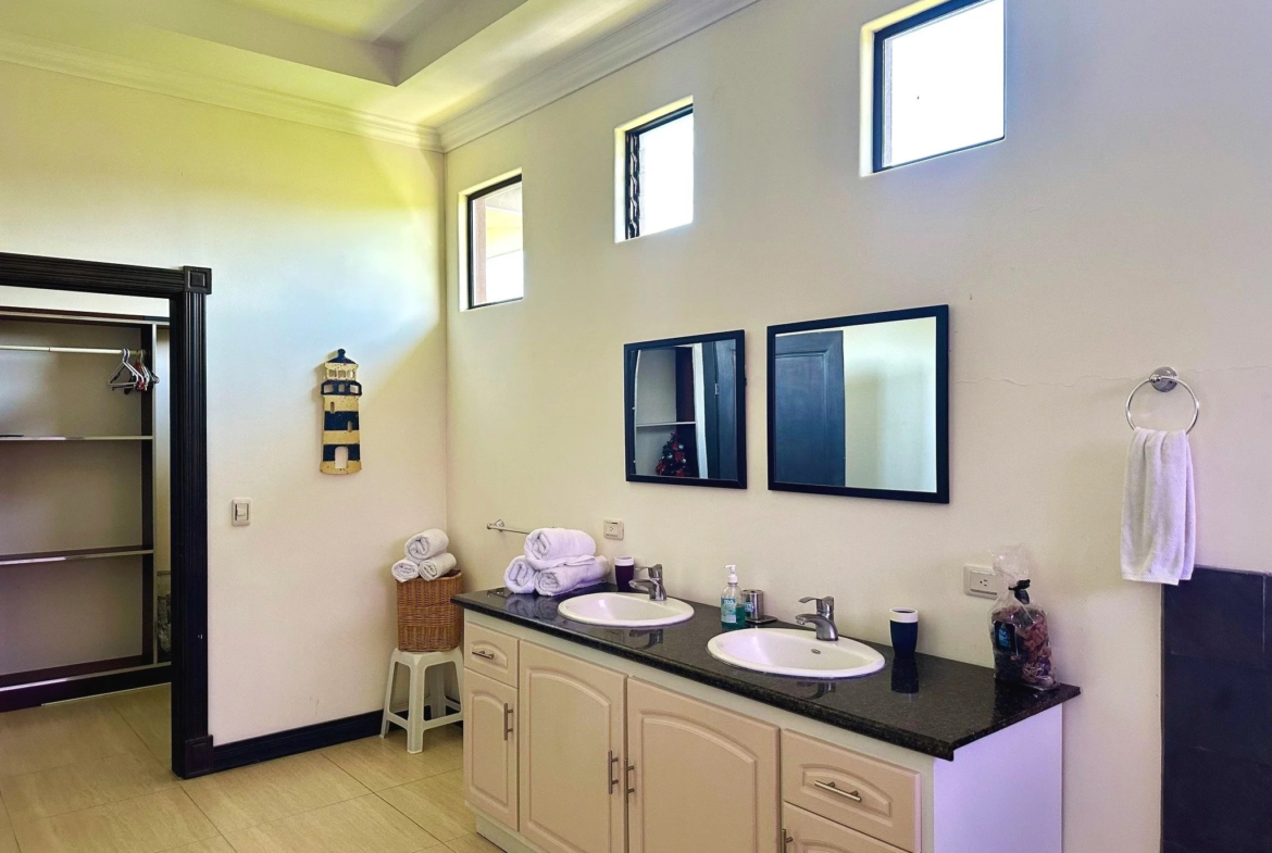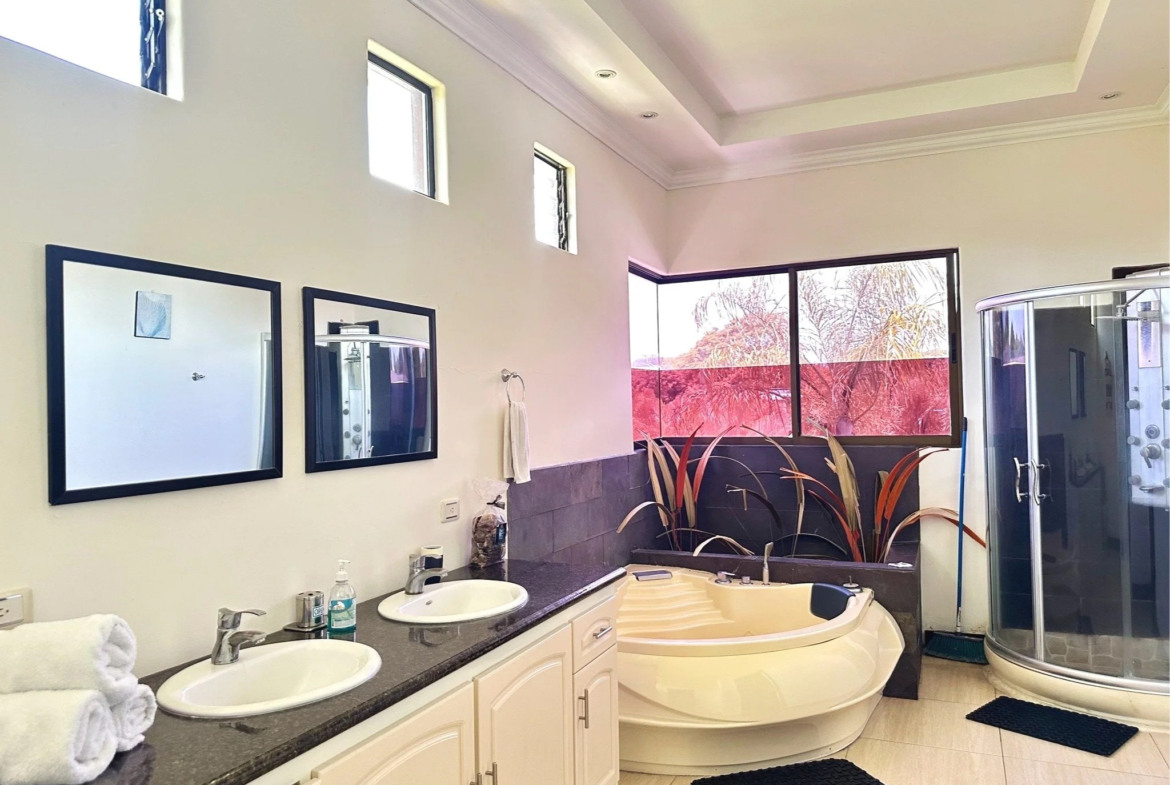 The large master bedroom has an en-suite oversized bathroom with a shower and a jacuzzi, as well as a walk-in closet.