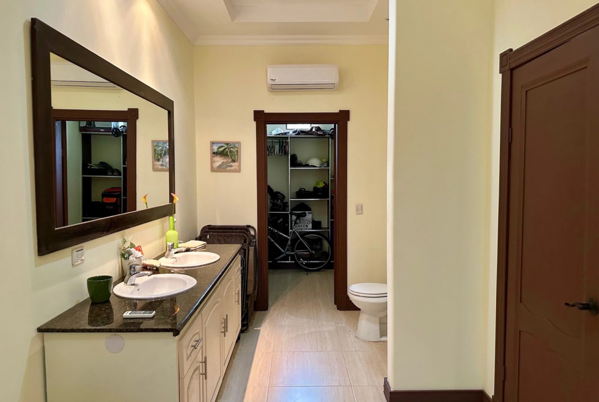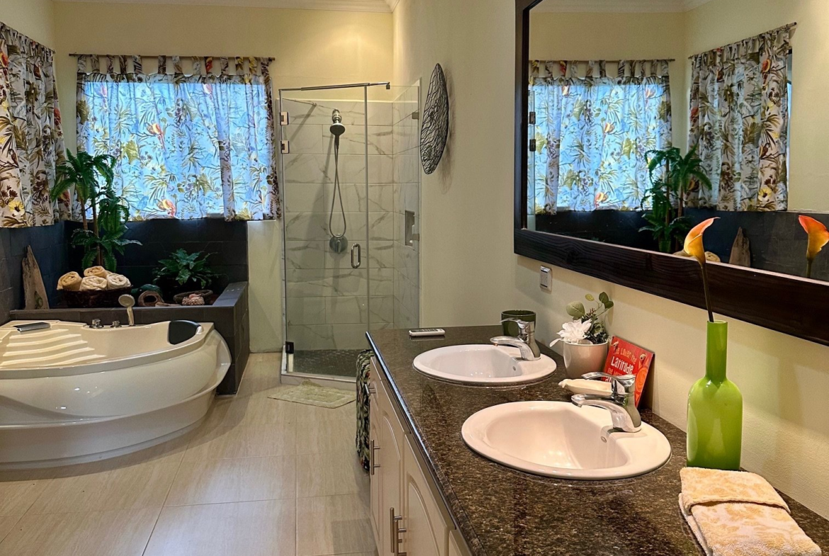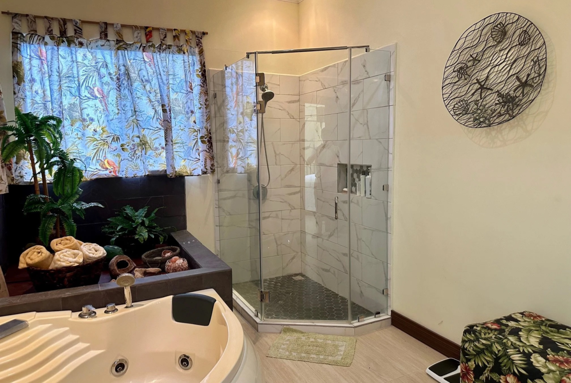The master bedroom is spacious and features an oversized bathroom with a shower and a jacuzzi, as well as a walk-in closet.