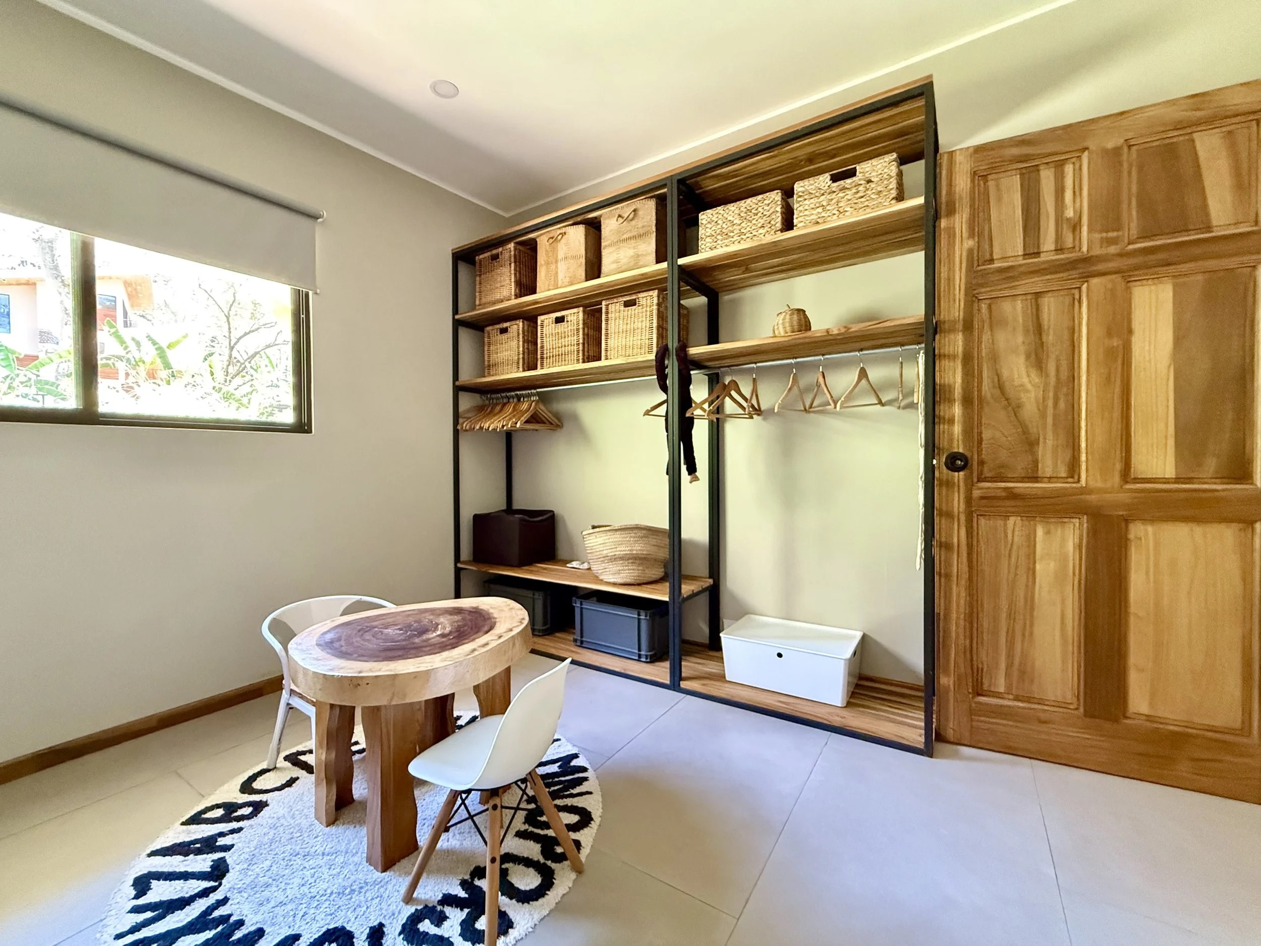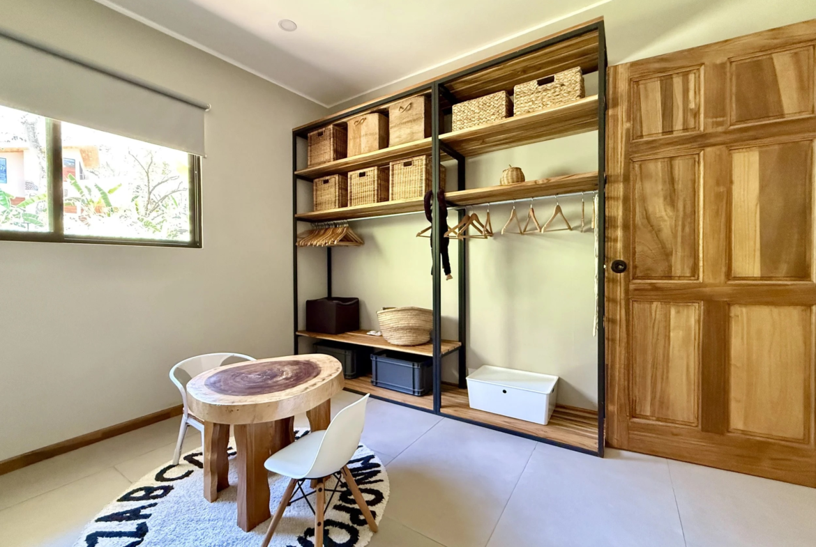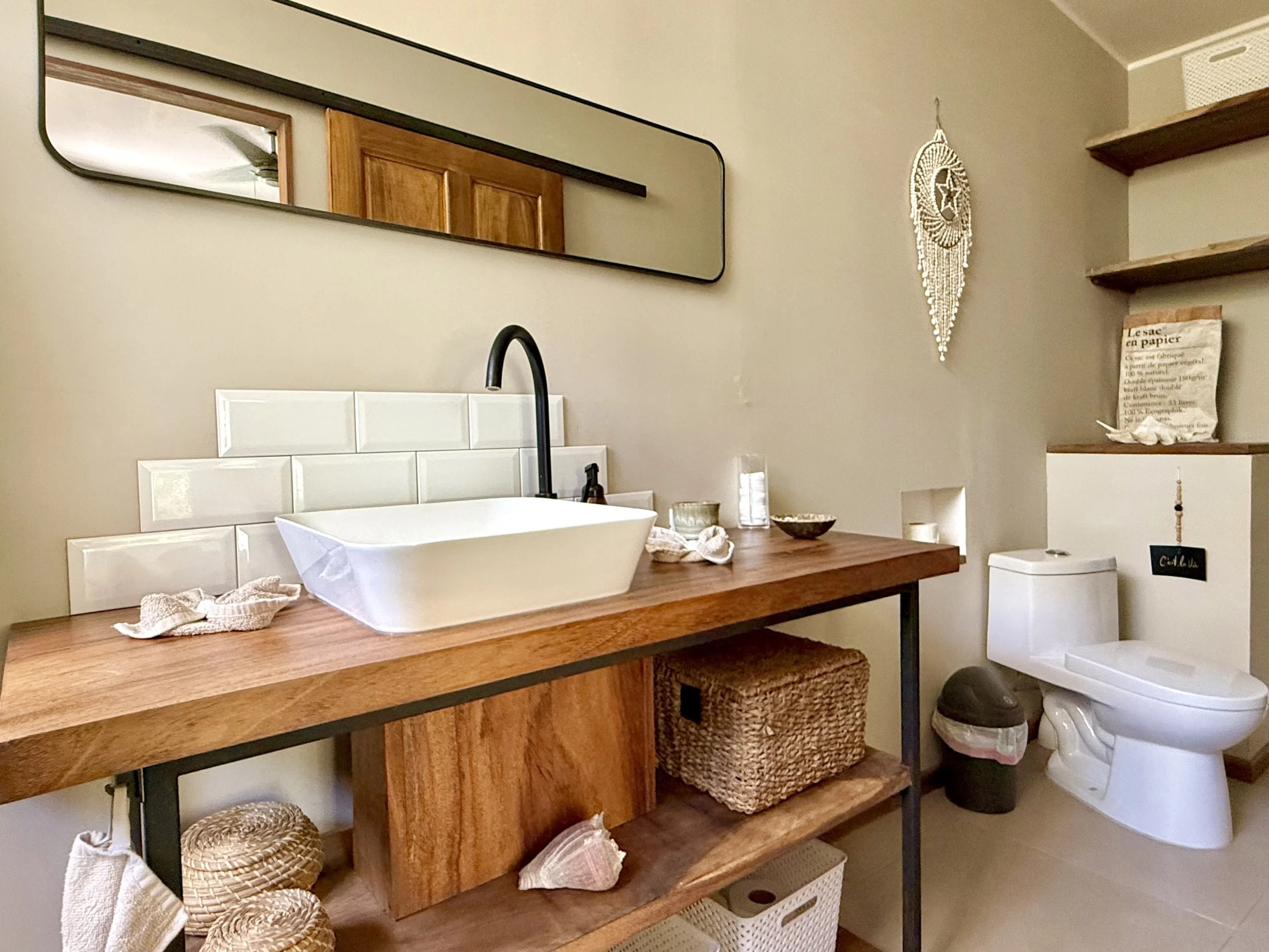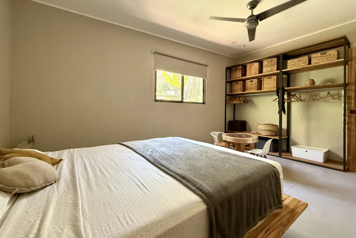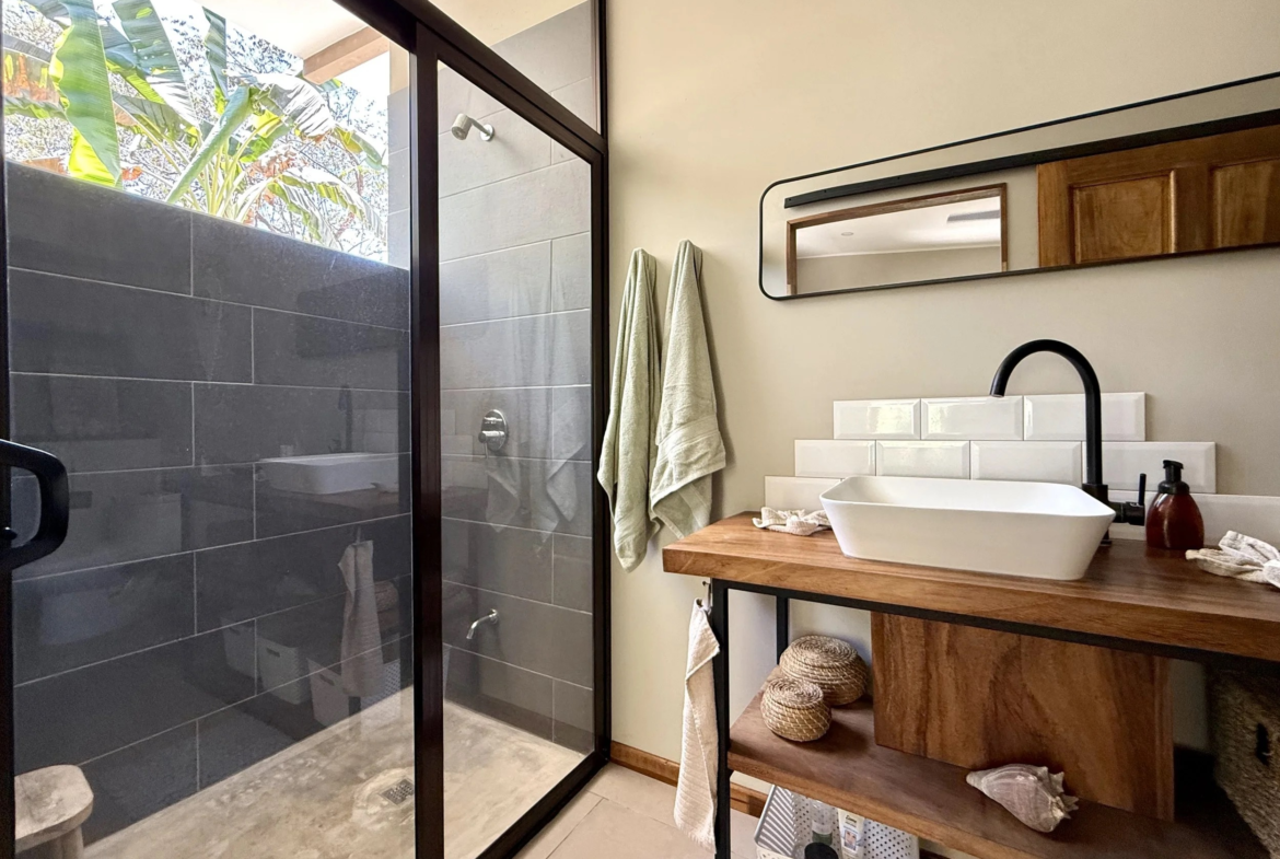 Both bedrooms are comfortable and generously sized, while the bathroom maintains the home’s understated, easygoing style. Modern elements with a Costa Rican flair.