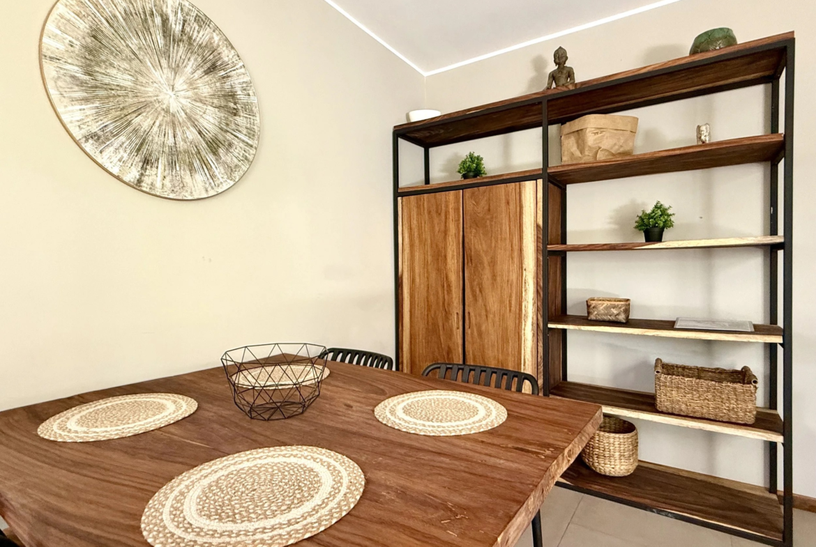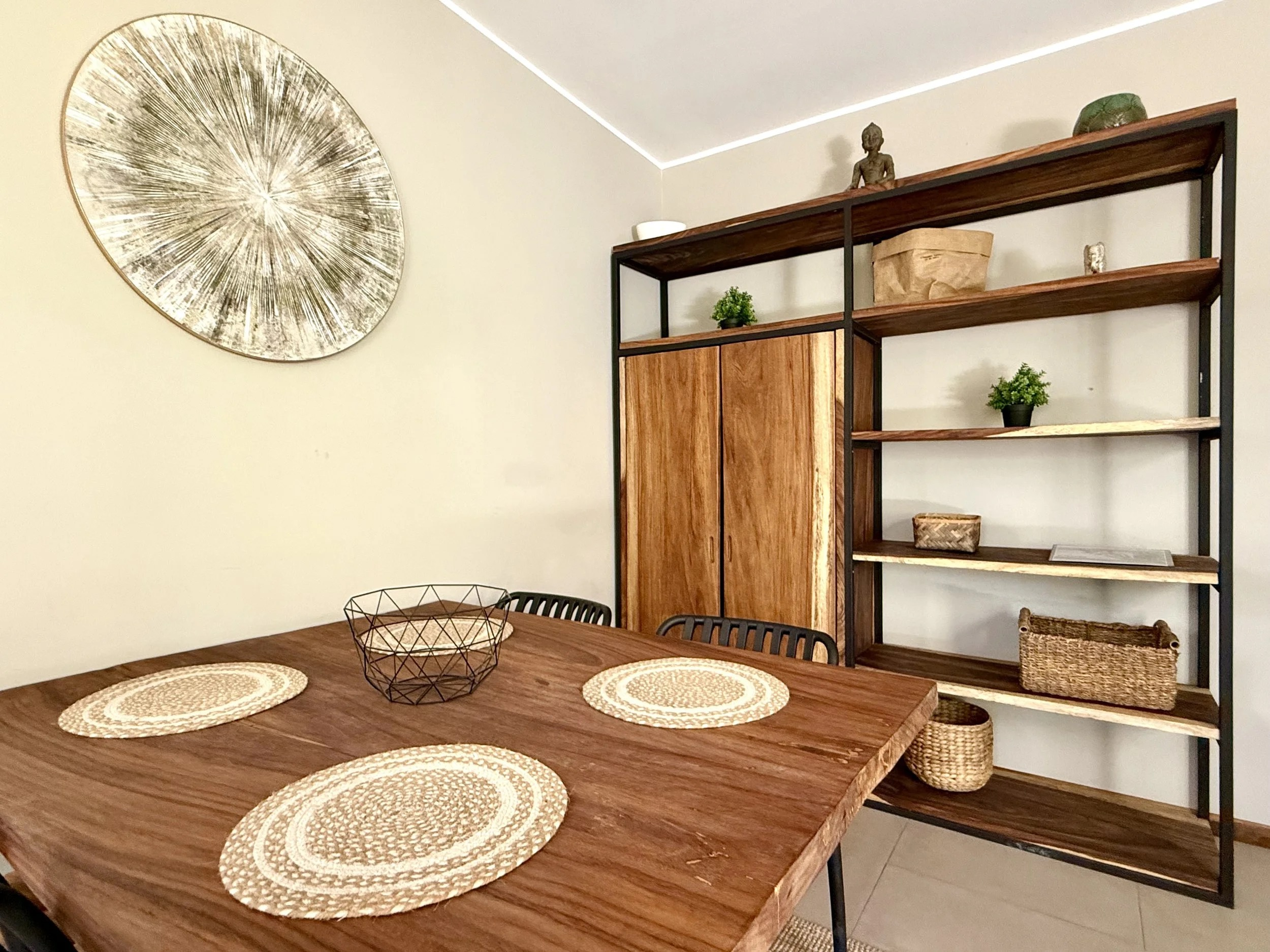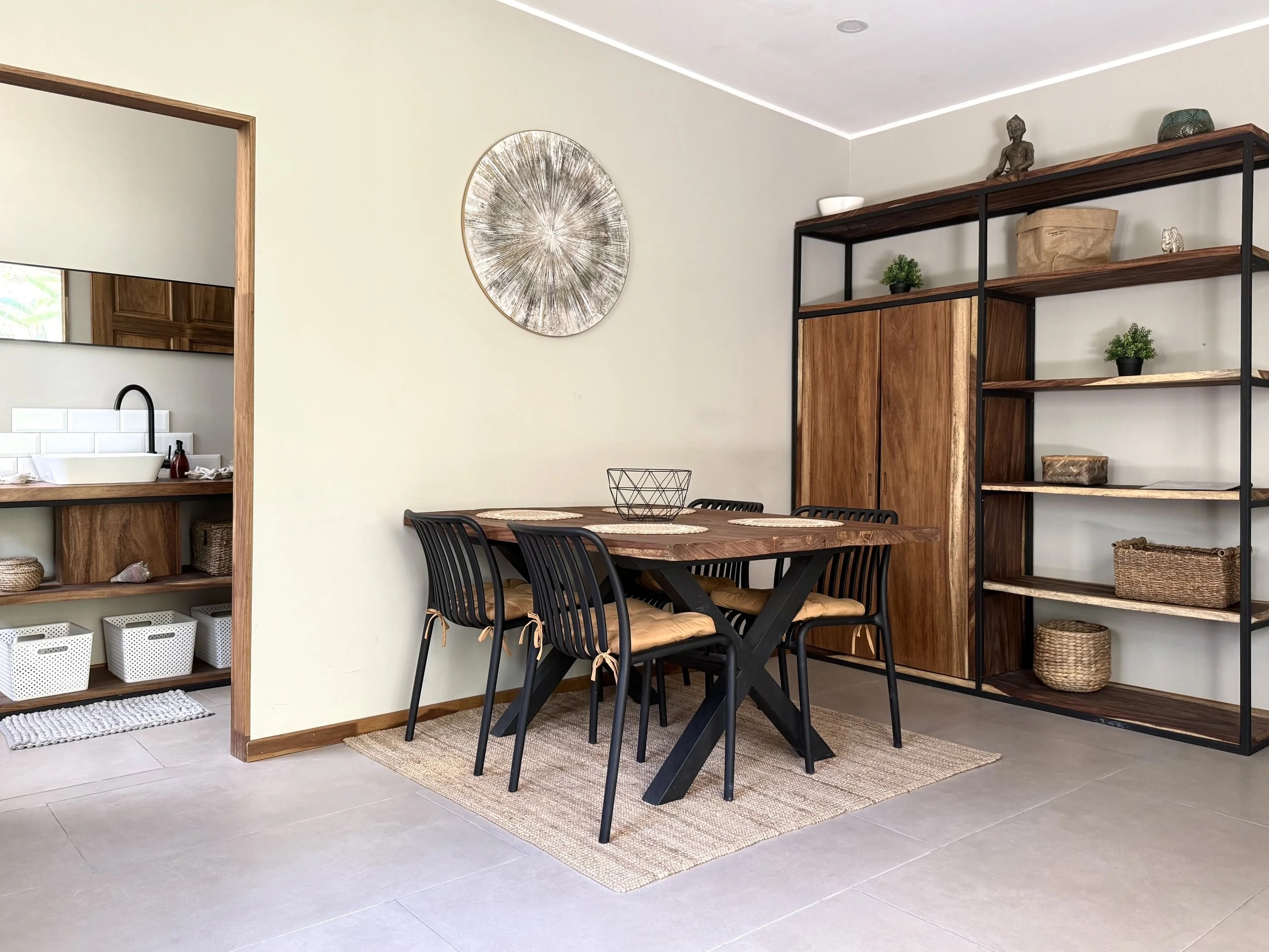 The kitchen is practical and well-appointed, blending modern touches with a relaxed, tropical sensibility.