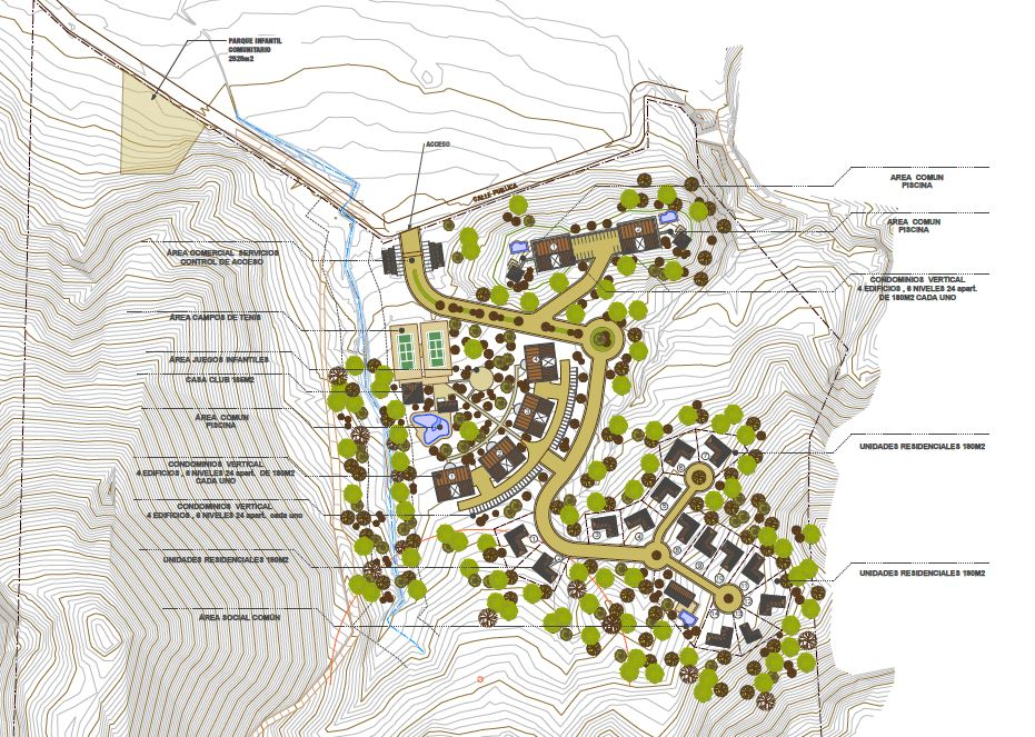 - Estrategia para la definición del Agua Potable: después de negociaciones con la ASADA, Autoridades Locales del agua, se ha determinado que la mejor opción para el proyecto de agua potable es la obtención de una concesión para utilizar el agua que sale de un manantial ubicado en la propiedad para ser utilizado como fuente de agua potable para el Proyecto, sin tener que cavar un pozo – que implica regulaciones ambientales adicionales. El retiro que se requeriría dicha naciente si el agua es para ser utilizado sólo para el proyecto, no para uso público – de cien (100) metros, lo que permite el diseño de los proyectos en curso a desarrollar. Además, si garantizamos que el terreno por encima de la naciente sería “Área protegida”, no afecta a nuestro diseño actual.