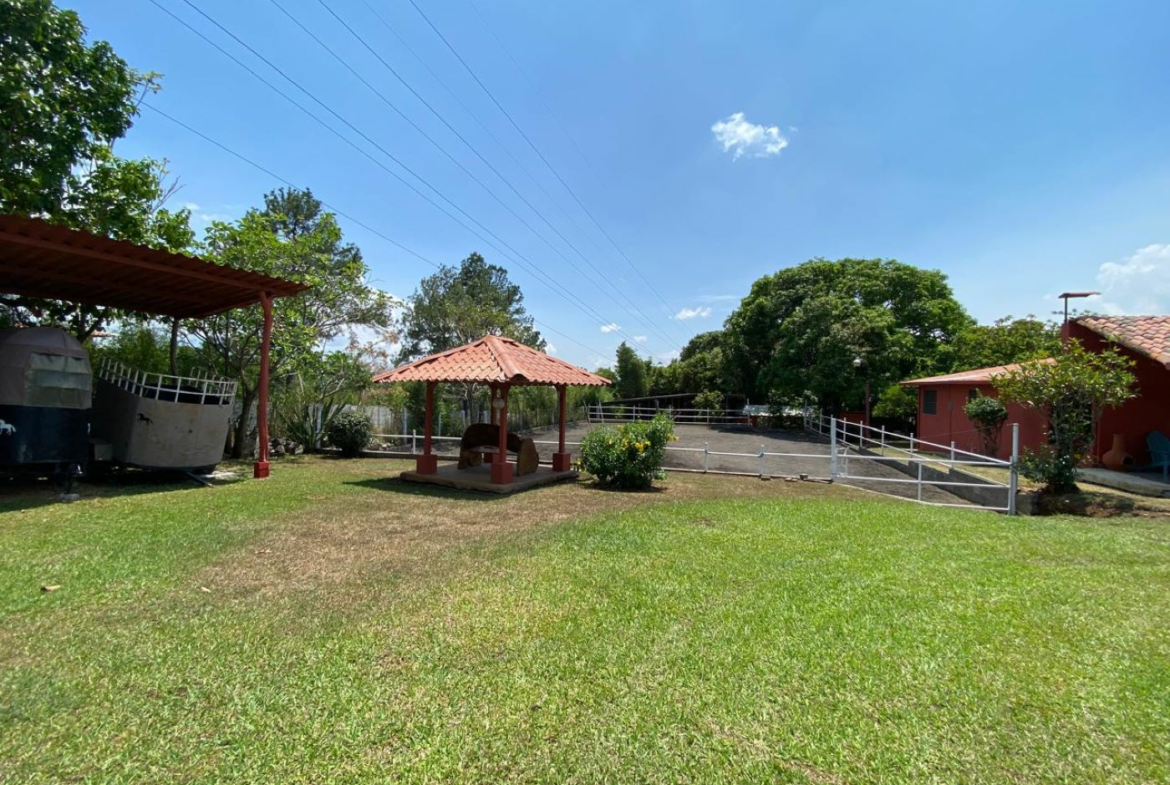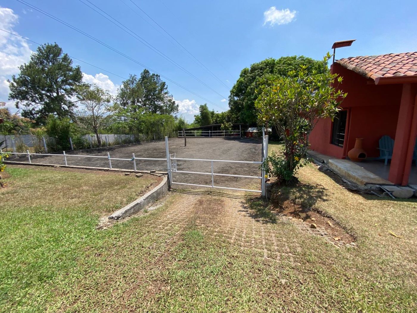 Hay una casa principal de 2 dormitorios, un patio cubierto para automóviles, un espacio cubierto con barbacoa y medio baño, una vivienda para el cuidador separada de la casa y establos para 7 caballos.