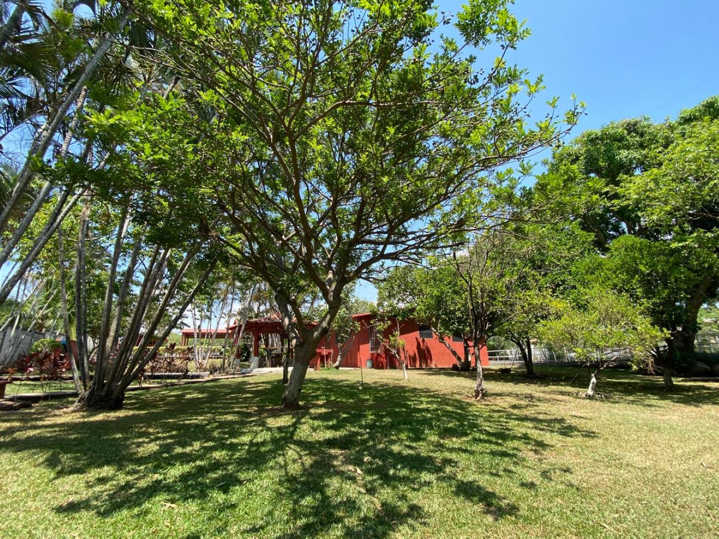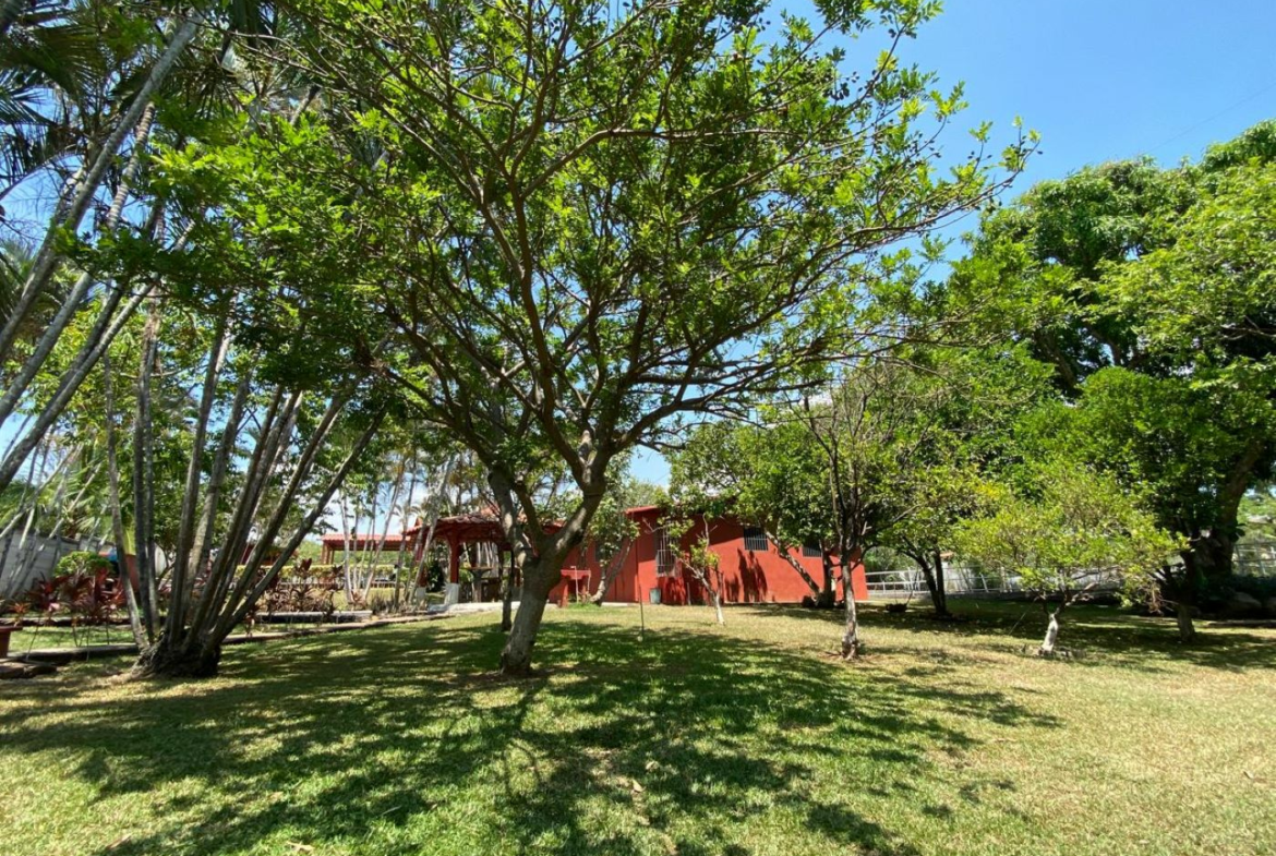 El jardín está bien cuidado, con muchos árboles frutales, plantas tropicales y un patio verde.