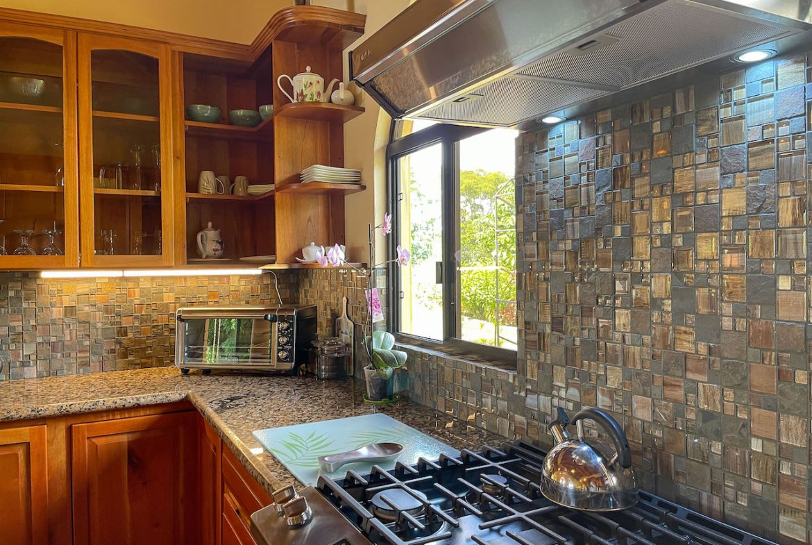 The patio on the ocean side has a built-in sink counter with granite counters + replaced faucets and cedar cabinets below for extra storage, plus light/fan. The patio on the mountainside has a simple light but also features an iron gate enclosure with a wood-framed top.