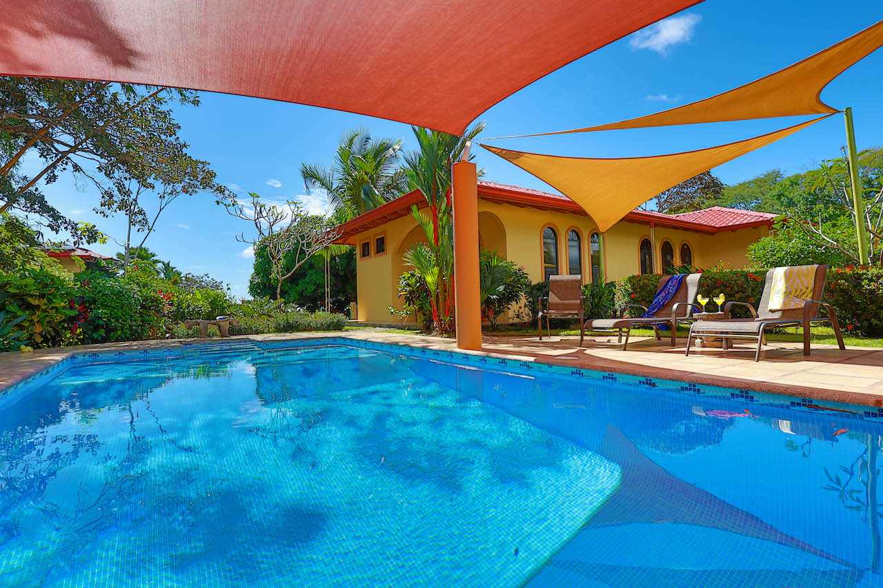 The iron arbor covered in tropical purple wisteria-type flowers leads into the saline pool (salt-like your tears) with a deep end of 2 m, and a shallow end of 1m. with built-in steps. It is fully tiled in mid-blue mosaics with a 7 inches deep, navy & white stylized wave pattern border. The pool features 6 columns with 3-Australian Shade Sails, 1-largest rectangular + 2 largest triangles, the colors selected to match the villa. Beneath these shades are two chaise lounges and 2 other poolside chairs. Red Lipstick Palms reflect nicely in the pool water, + other flowering plants. The built-in Water Storage Tank, a feature of a Robert Fraser home, ensures you will never be without water should the community water system be shut down for repairs.