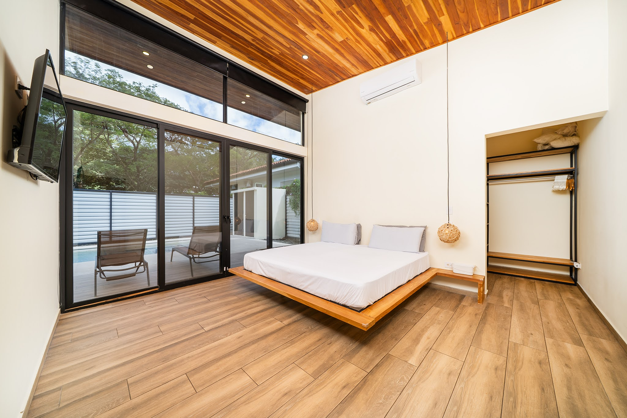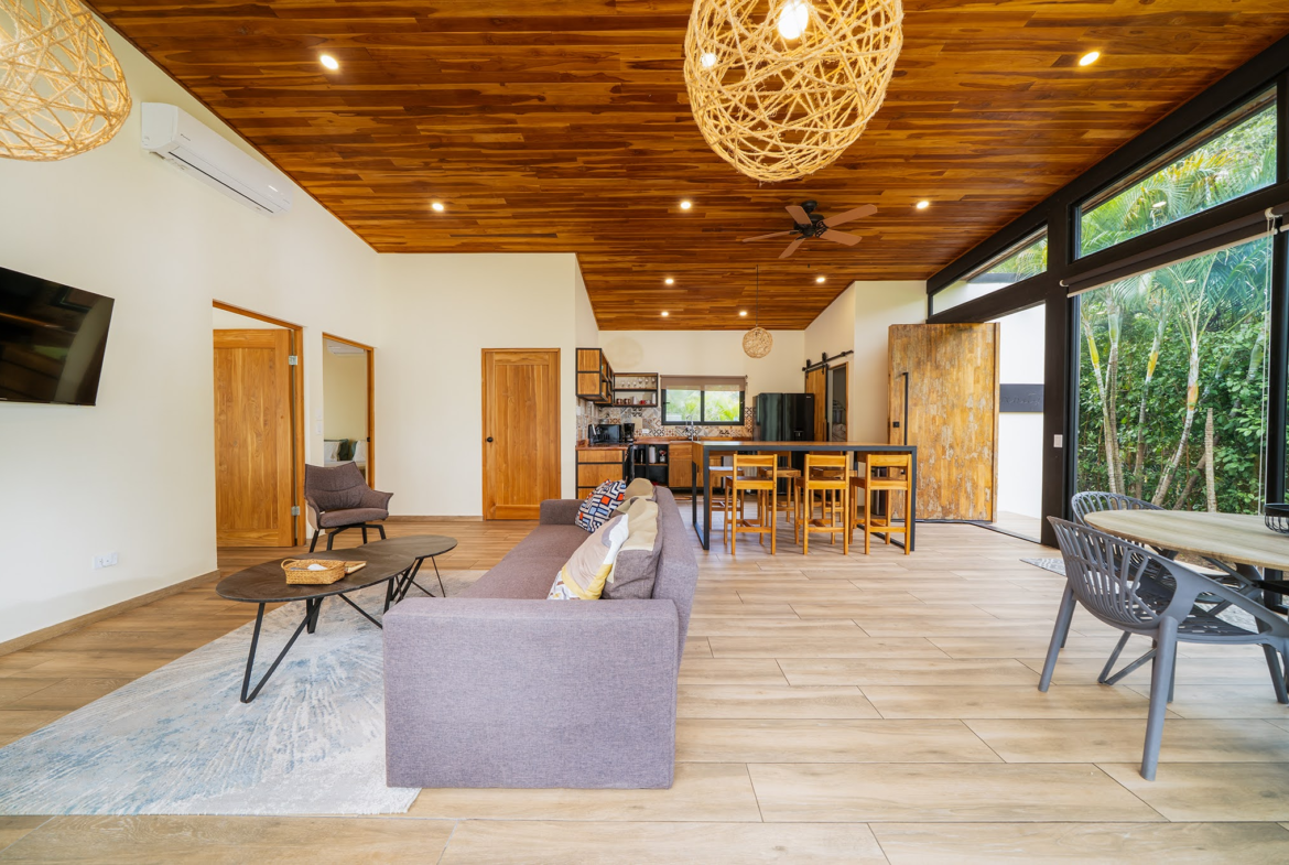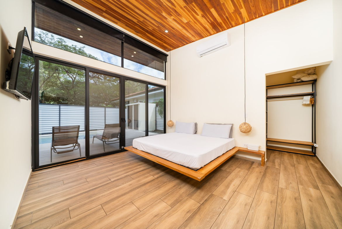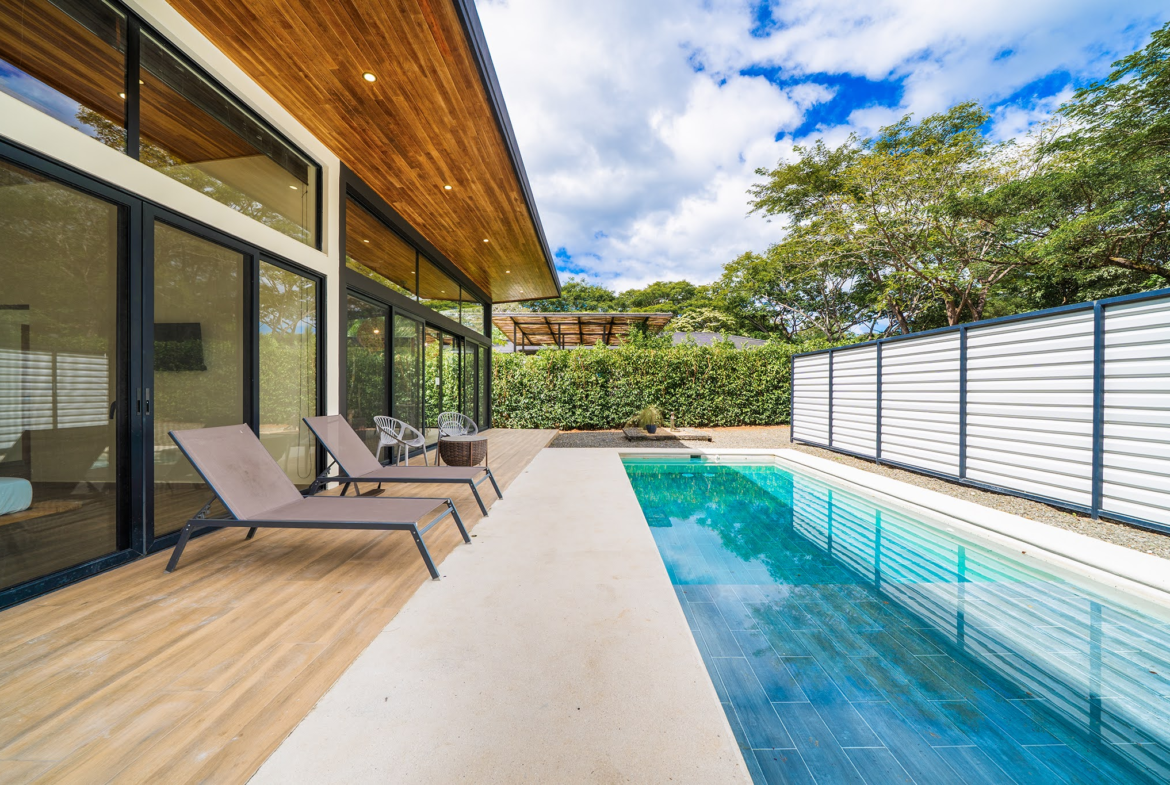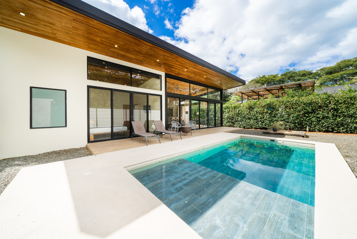 Modern Contemporary Tamarindo Beach 2 BR House with Pool for sale. A beautifully designed 2-bedroom, 2-bathroom home located in a secure gated community just minutes from the heart of Tamarindo and its world-class beaches. This nearly new-construction residence features soaring ceilings and an open-concept floor plan, creating a bright, airy atmosphere that seamlessly blends indoor and outdoor living.