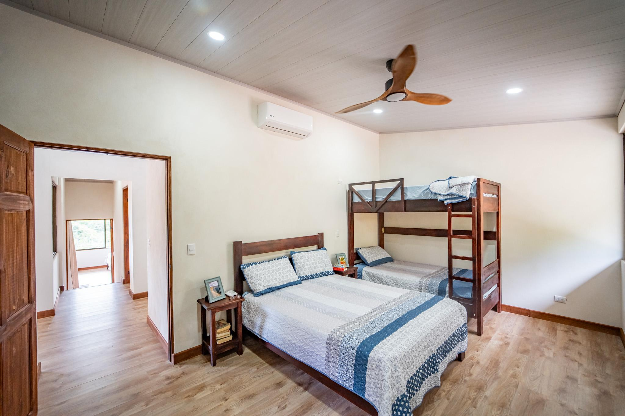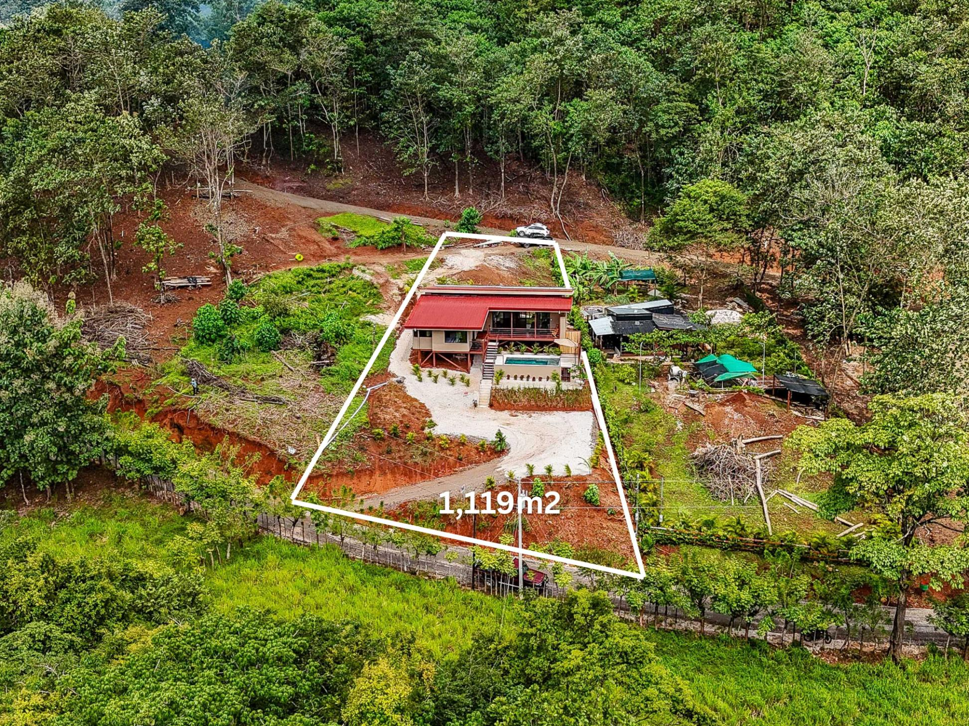 This mountain view home features three bedrooms and two bathrooms across approximately 164 square meters of indoor and outdoor living space. Locally sourced Melina wood, harvested from the property, is featured throughout — from the floors and shelving to the custom-built beds — giving the home a warm, organic feel that reflects its surroundings.