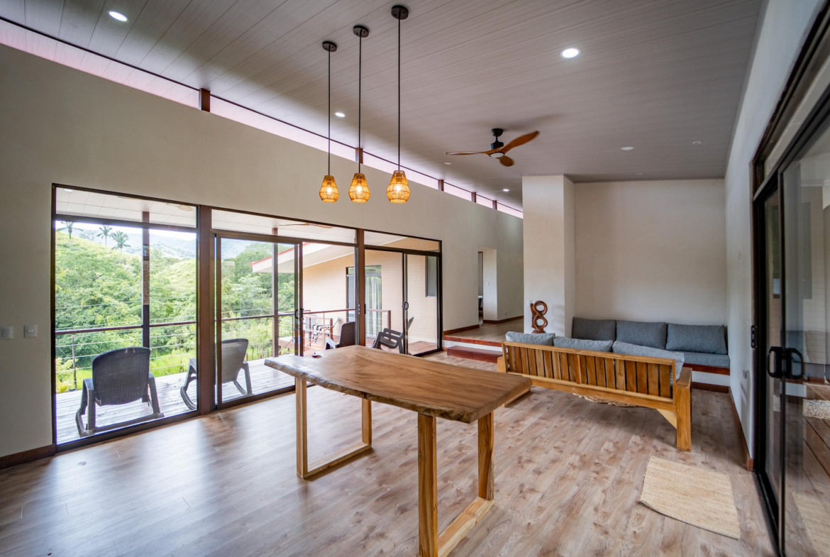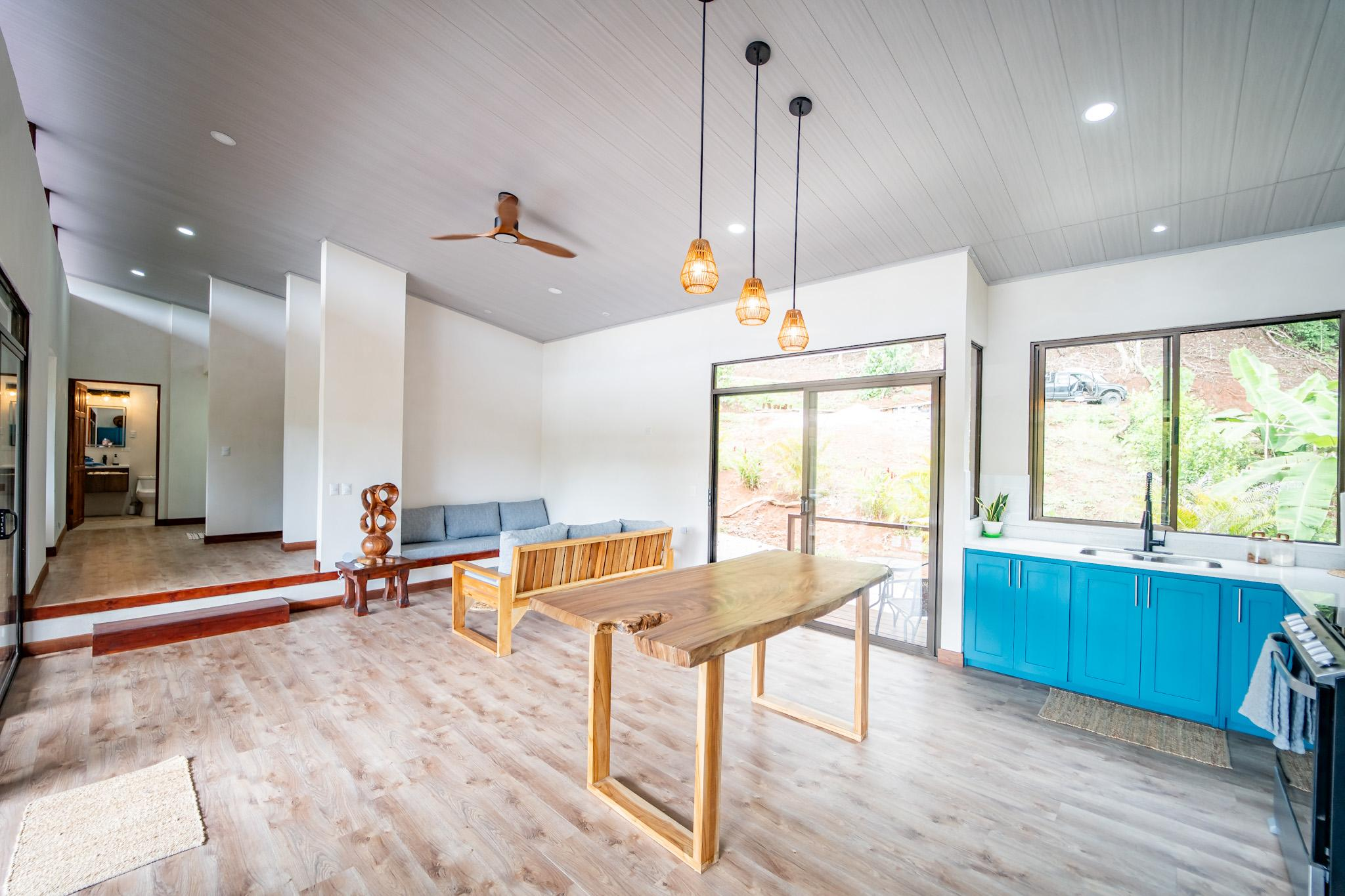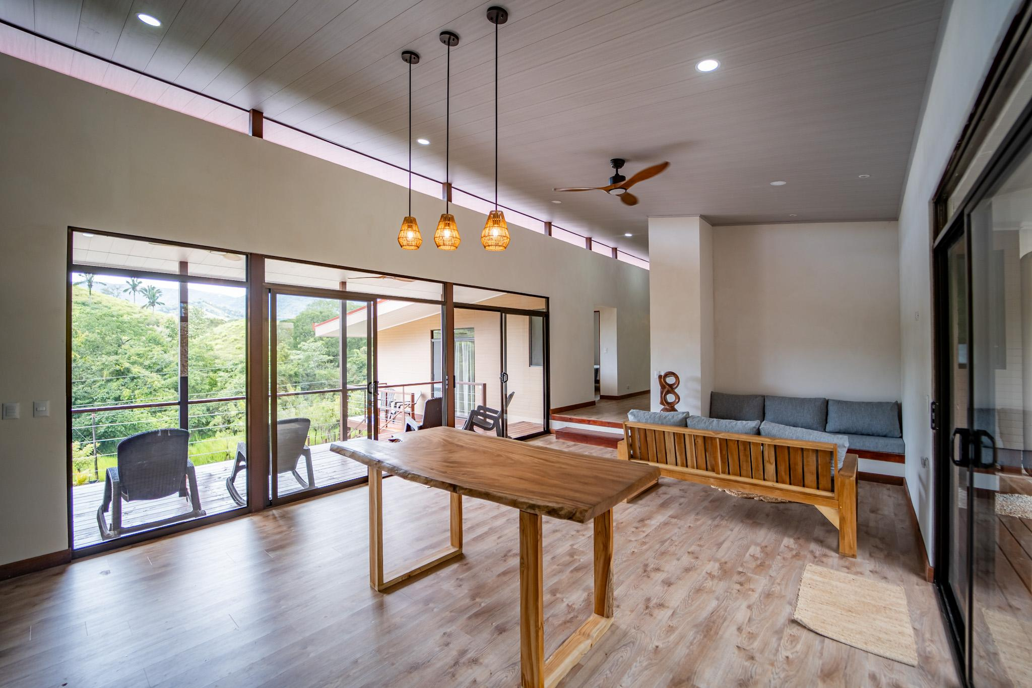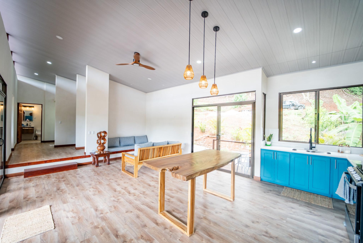 Inside, large glass panels flood the home with light and frame the mountain backdrop. The open layout connects the living area with a custom kitchen finished in granite countertops, a six-burner gas stove, and handcrafted Melina and teak shelving. Instead of a fixed island, a beautiful Guanacaste wood dining table anchors the space, adding flexibility and character.