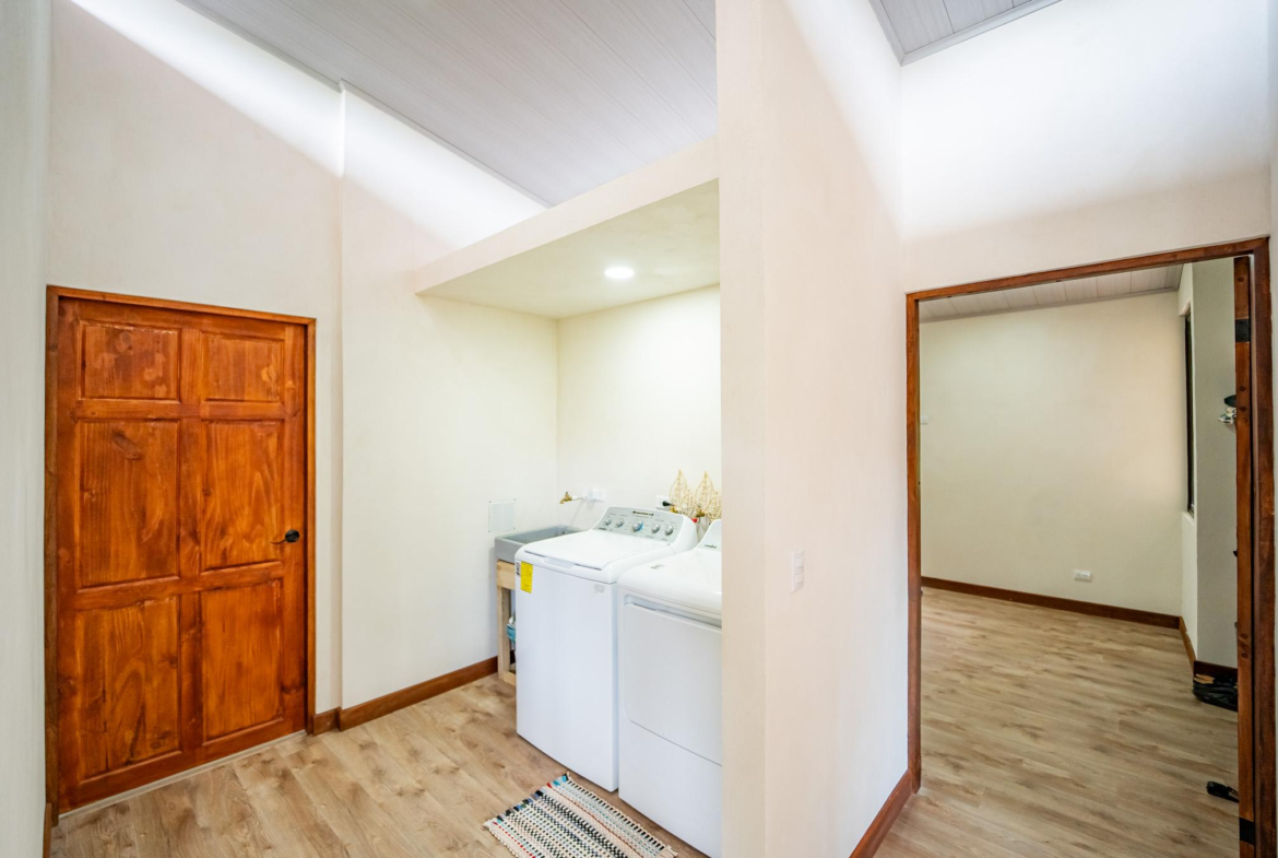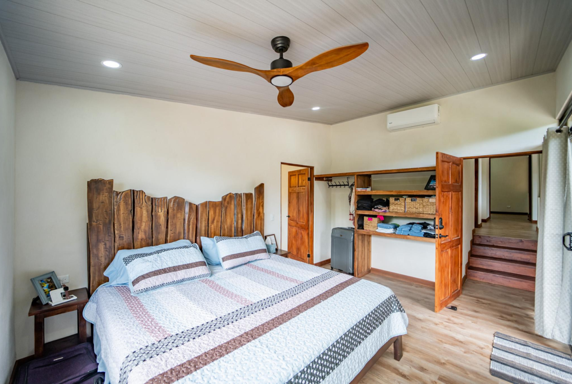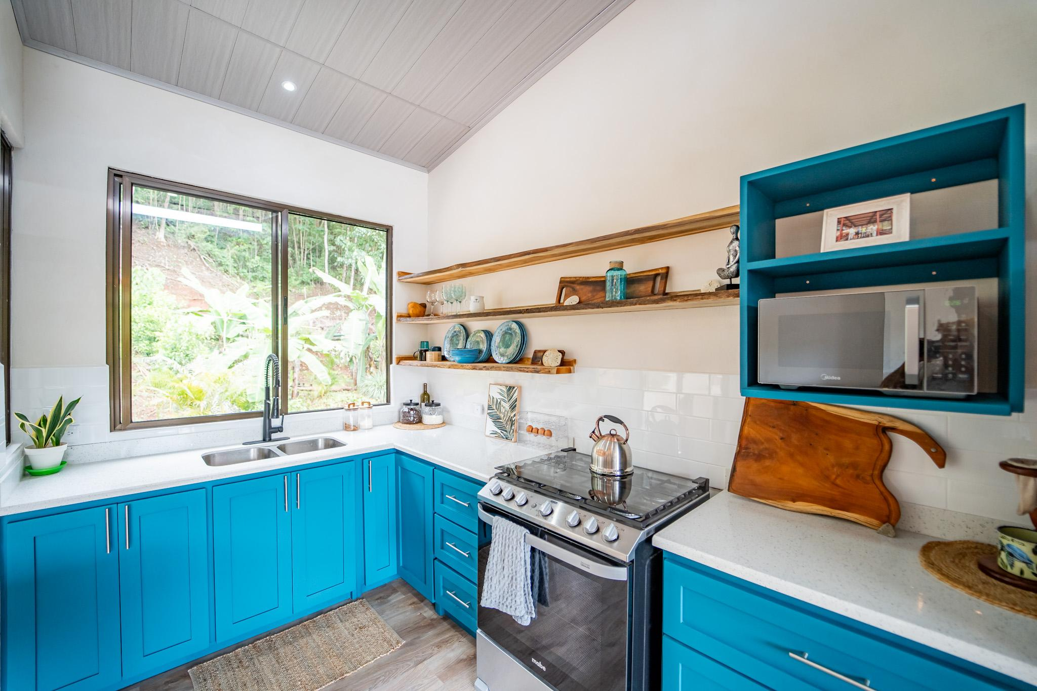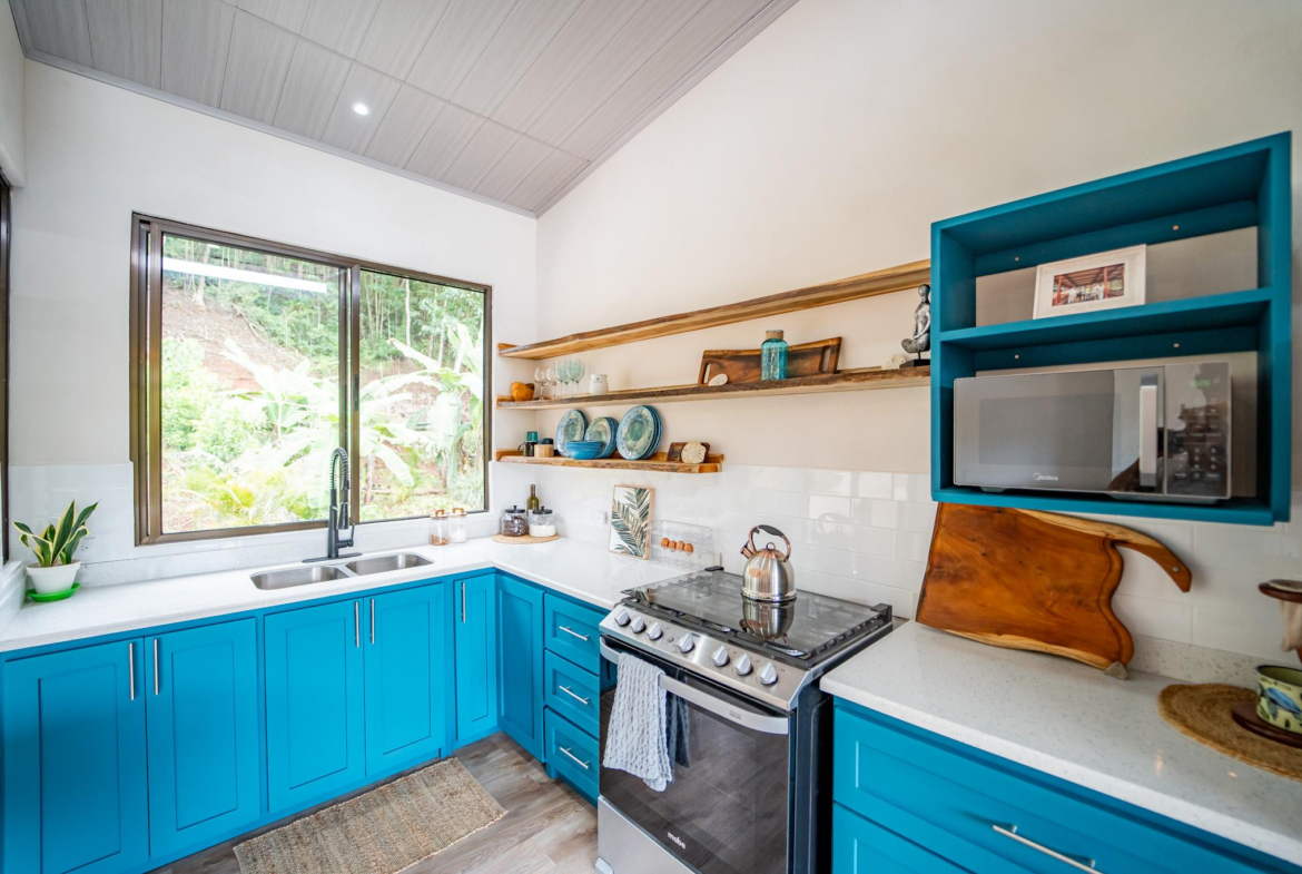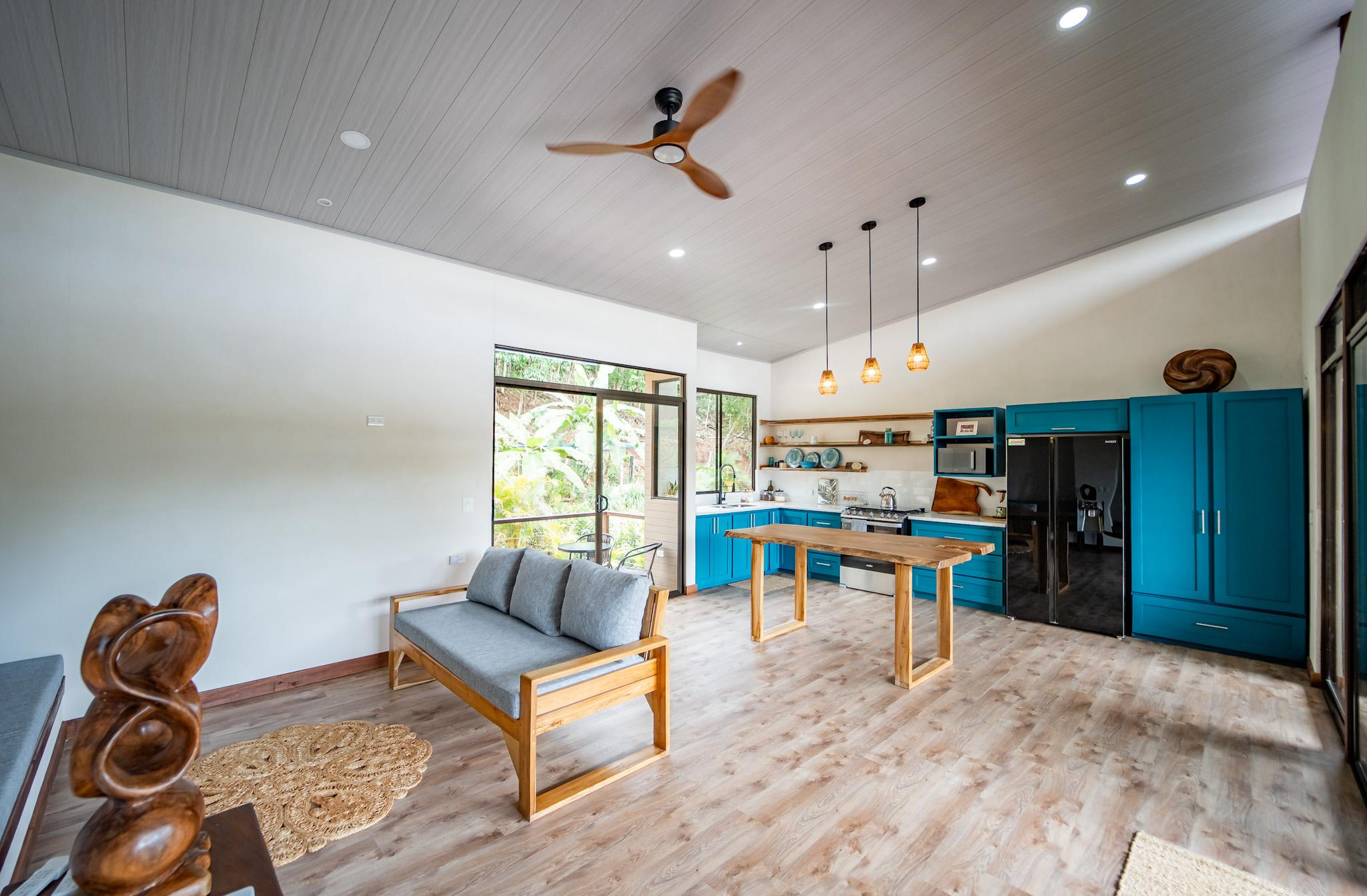 Inside, large glass panels flood the home with light and frame the mountain backdrop. The open layout connects the living area with a custom kitchen finished in granite countertops, a six-burner gas stove, and handcrafted Melina and teak shelving. Instead of a fixed island, a beautiful Guanacaste wood dining table anchors the space, adding flexibility and character.