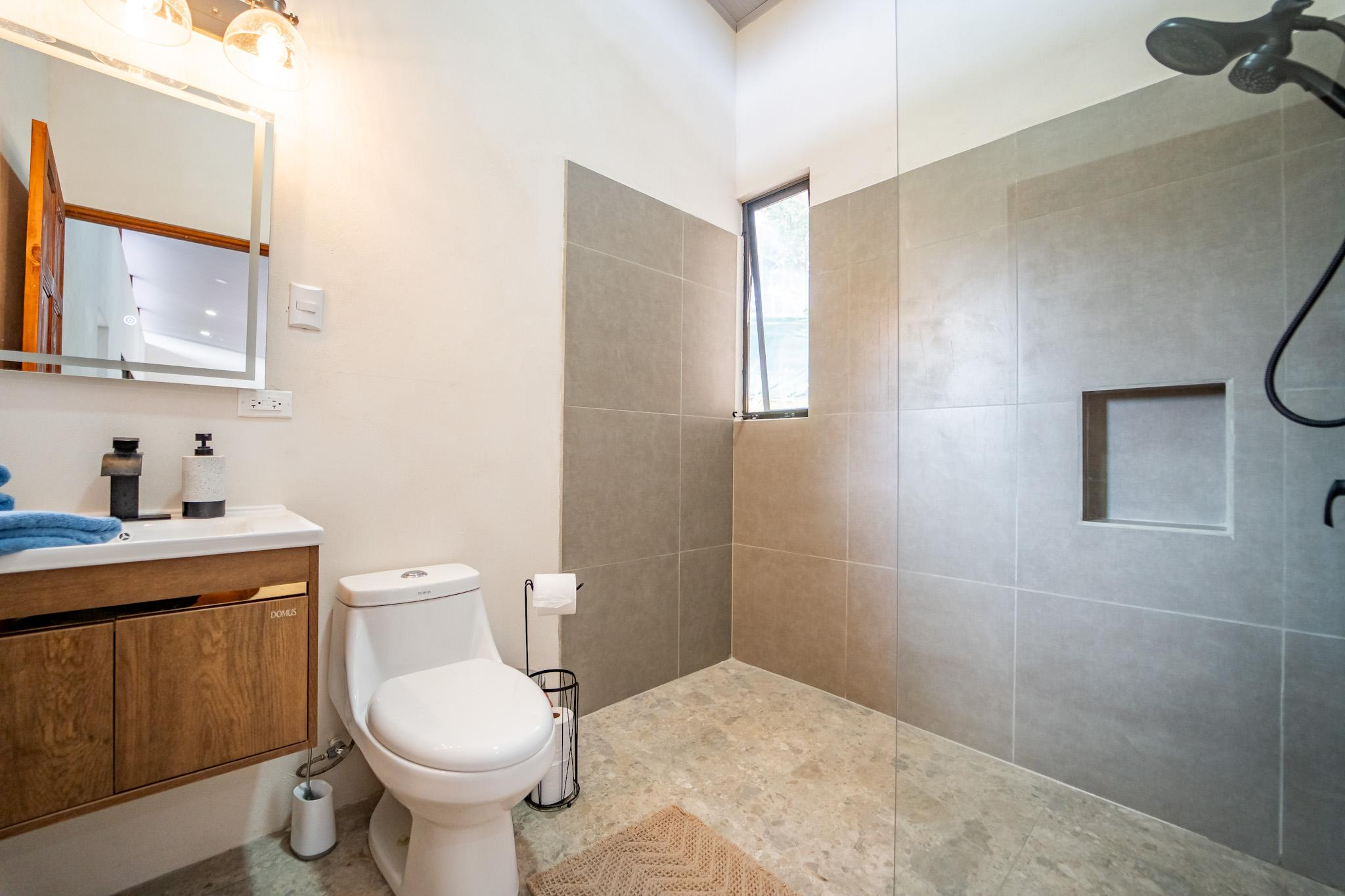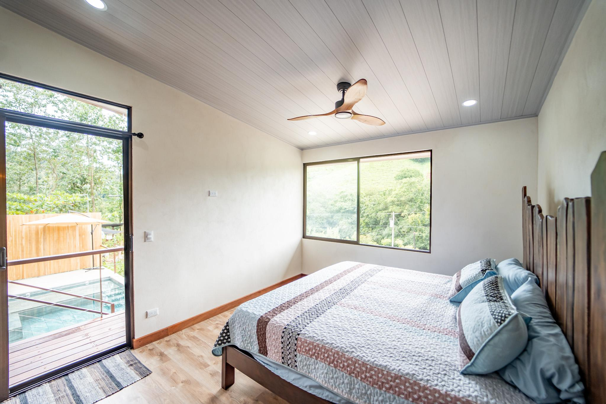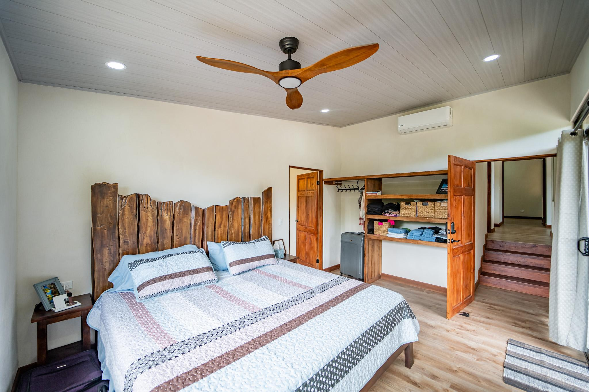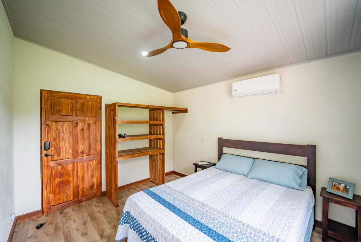 Inside, large glass panels flood the home with light and frame the mountain backdrop. The open layout connects the living area with a custom kitchen finished in granite countertops, a six-burner gas stove, and handcrafted Melina and teak shelving. Instead of a fixed island, a beautiful Guanacaste wood dining table anchors the space, adding flexibility and character.