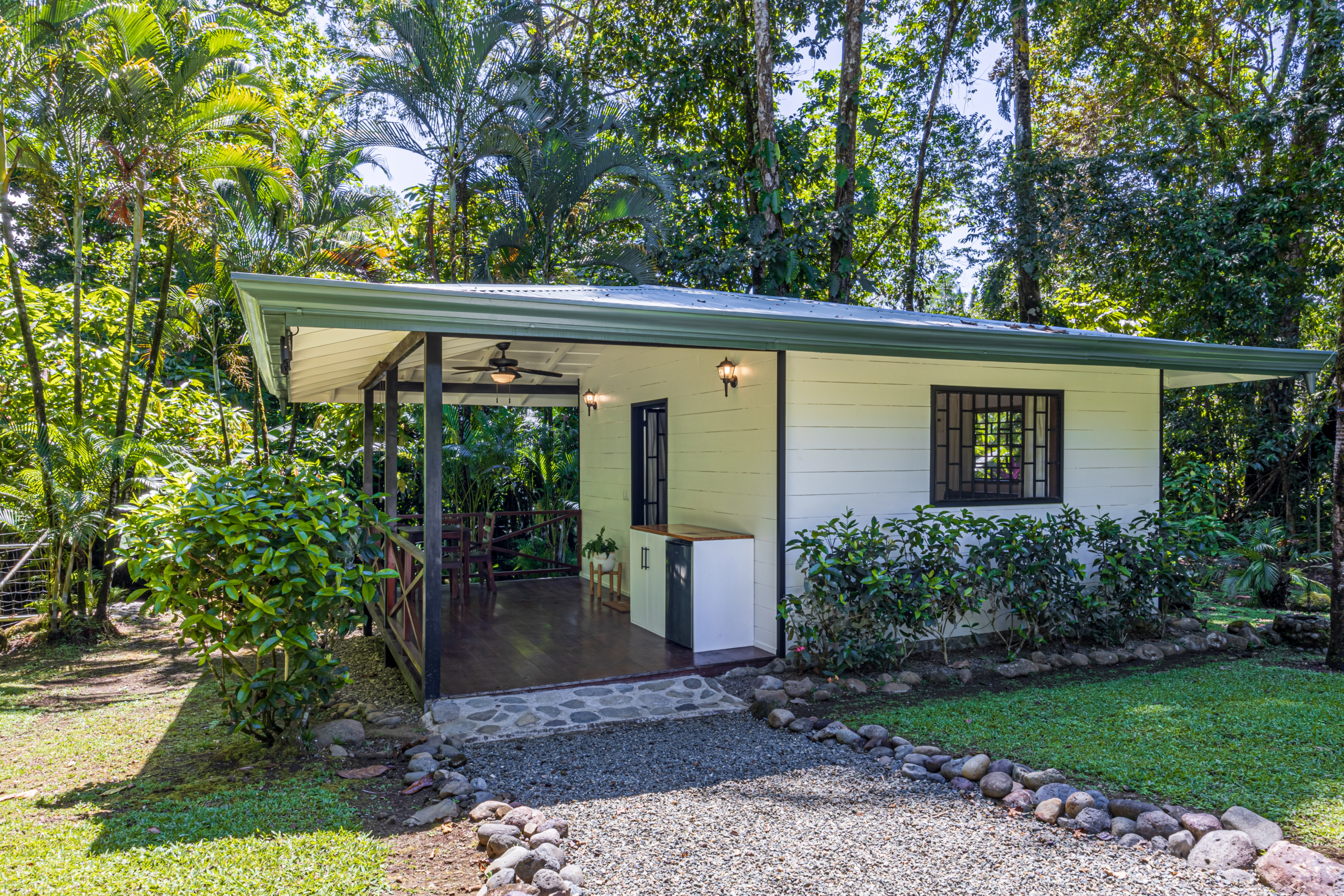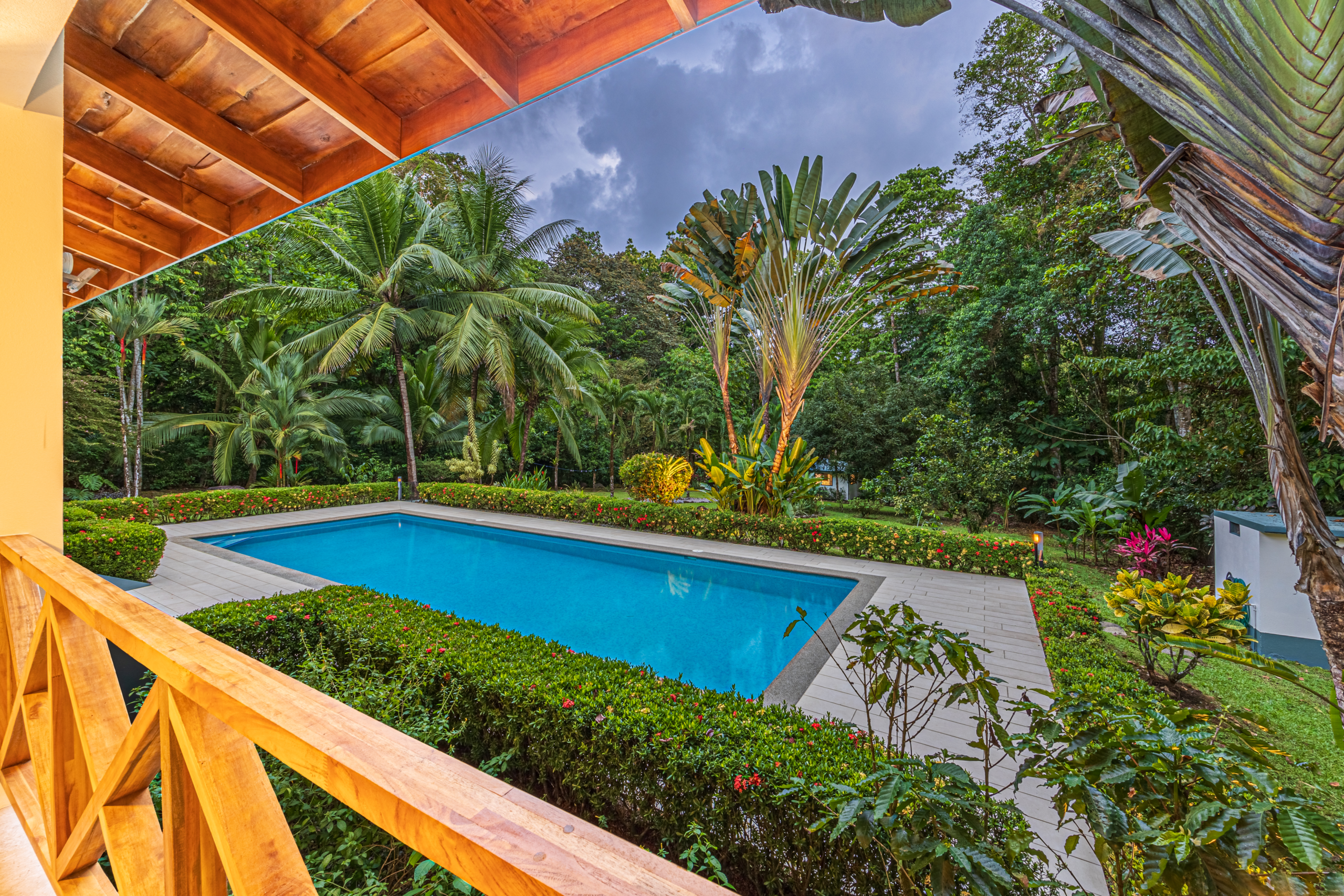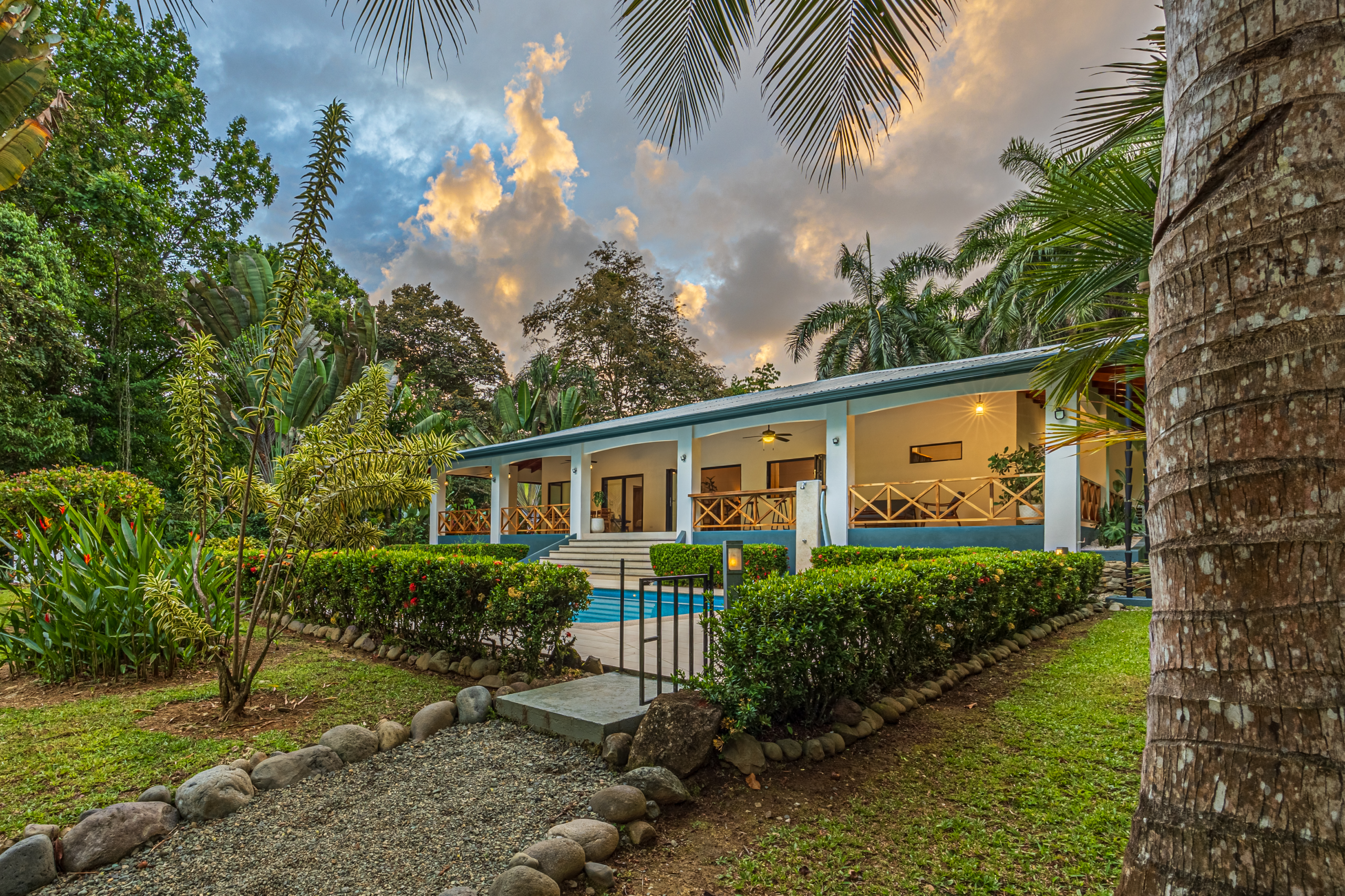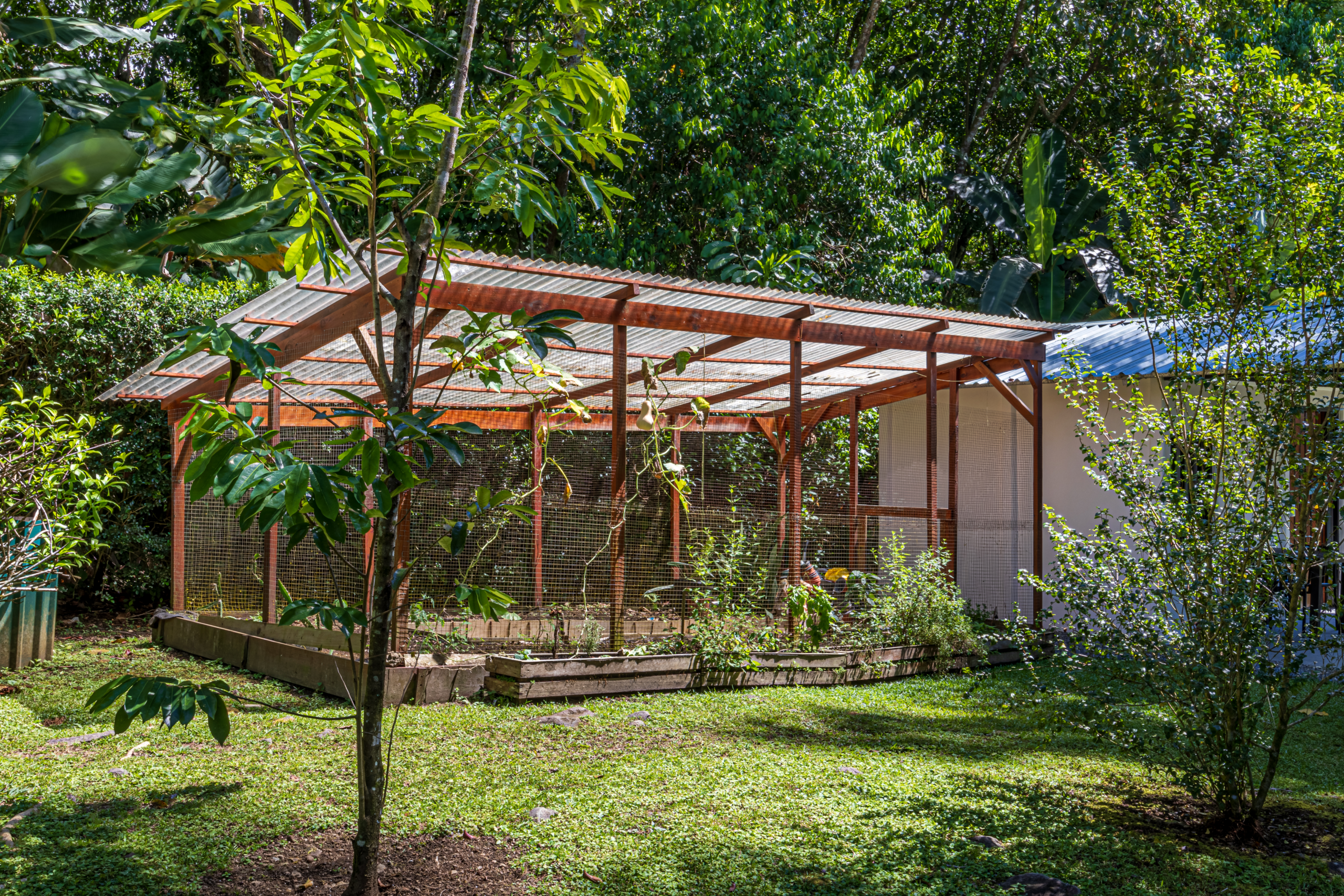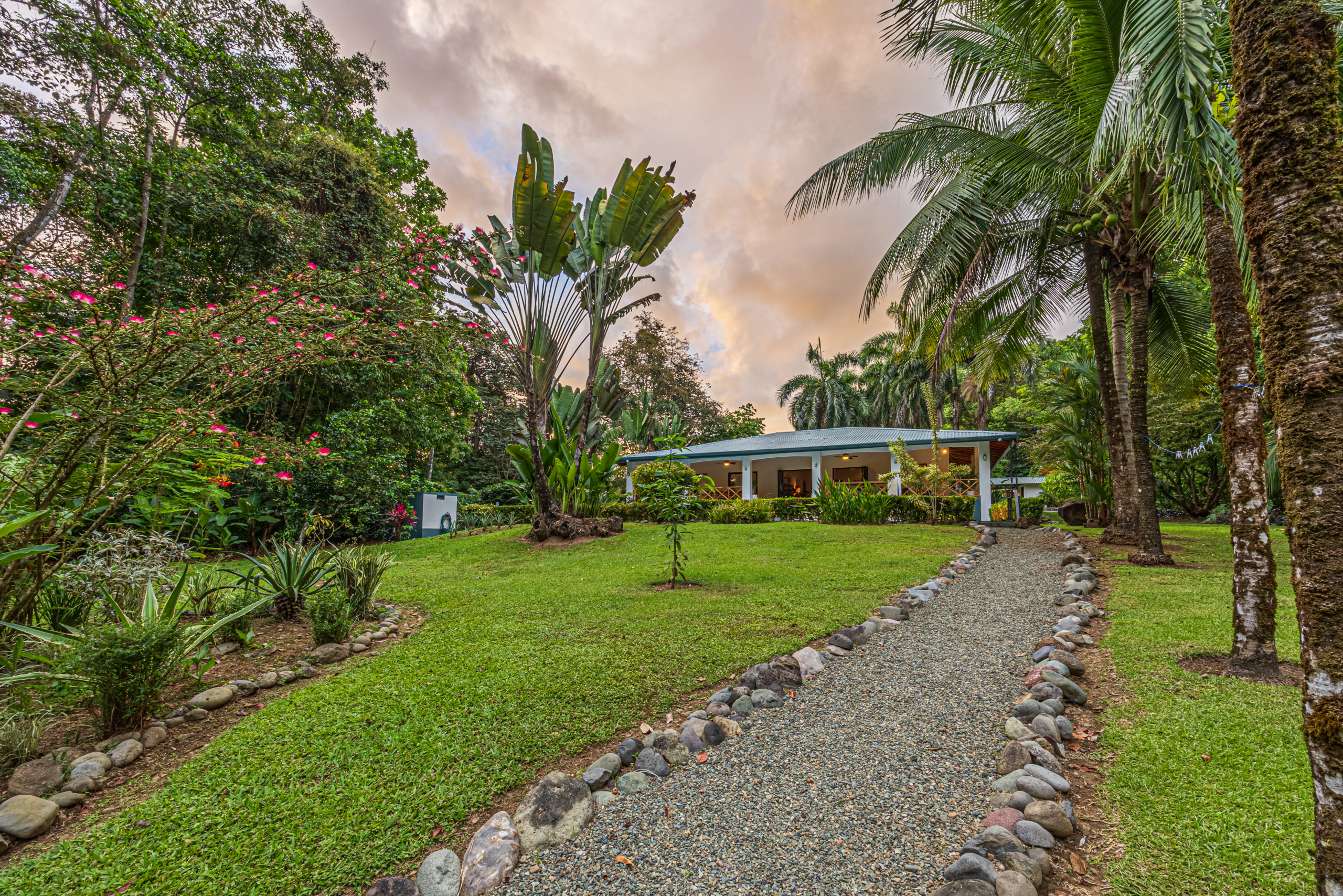 A giant, iconic palm tree-lined entrance (Casa Palmera) welcomes you into this fully fenced property, surrounded by lush jungle and bordering the Rio Balso. The organically maintained gardens are abundant with fruit trees, herbs, and a thriving Mariola beehive—all cultivated without sprays. A shade house provides an ideal environment for nurturing plants and growing fresh produce.