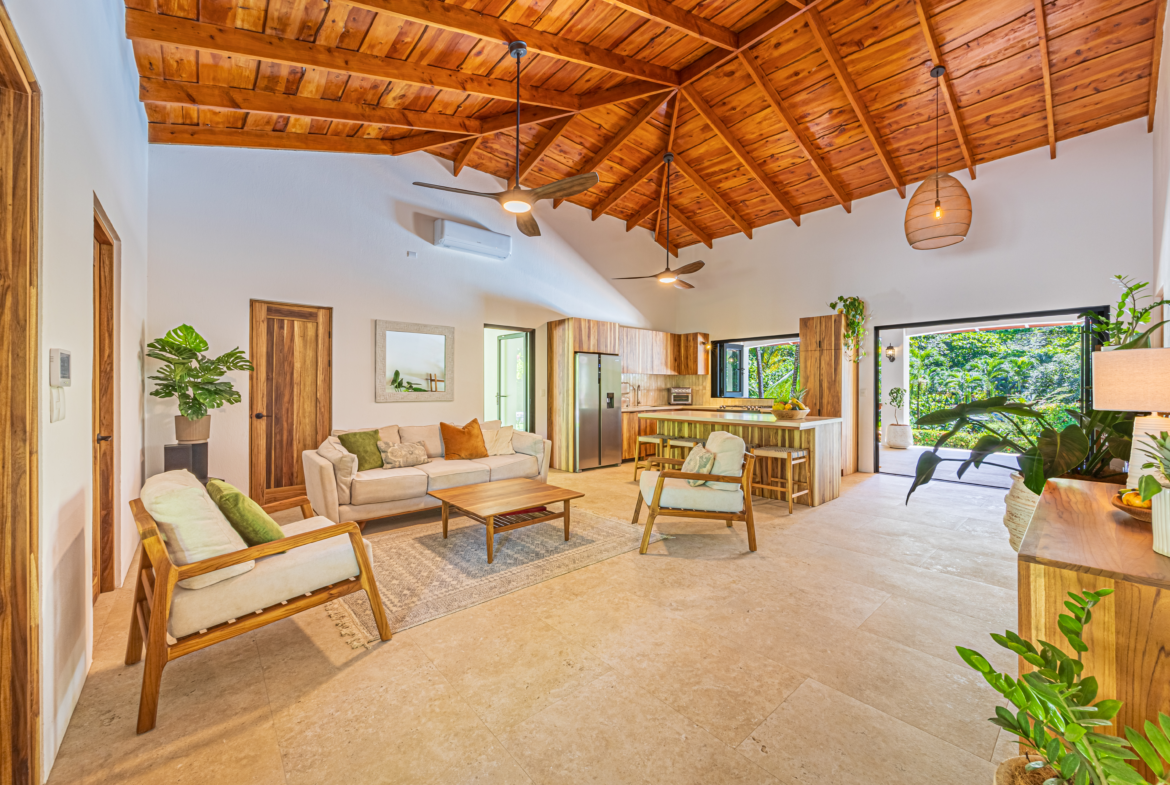 Ojochal 3 BR Luxury Home and Guesthouse on River for sale. Step into a thoughtfully designed home that blends modern comfort with sustainable living. This beautifully crafted residence features a spectacular 45ft x 15ft pool, accordion sliding screen windows & doors (Europa), a new Laurel kitchen and doors, and Spanish tiles with a ‘Slipstop’ finish for both style and functionality. A calming ambiance with low measured EMF readings throughout, complete household surge protection, and a security system with alarm, cameras, and floodlights, ensuring both safety and peace of mind. A backup 1000L water tank provides additional water security and reliability.