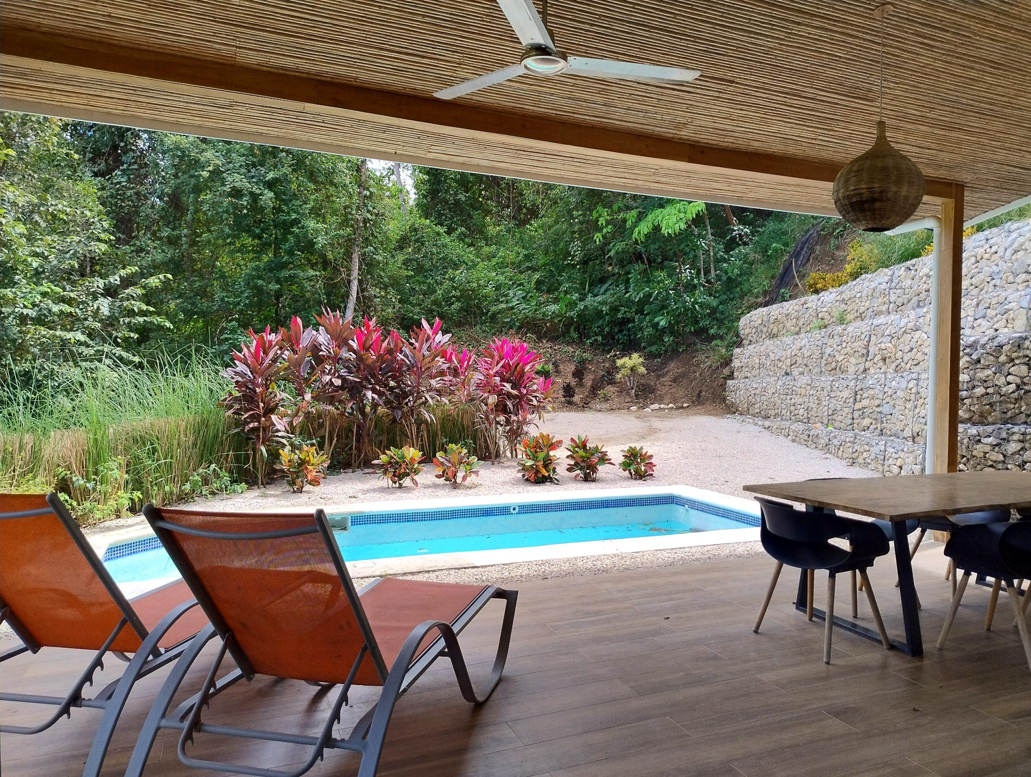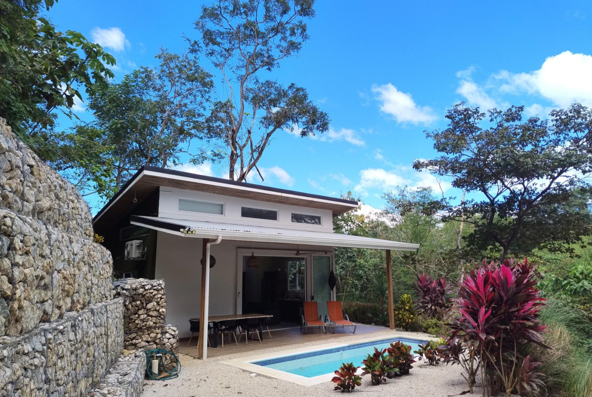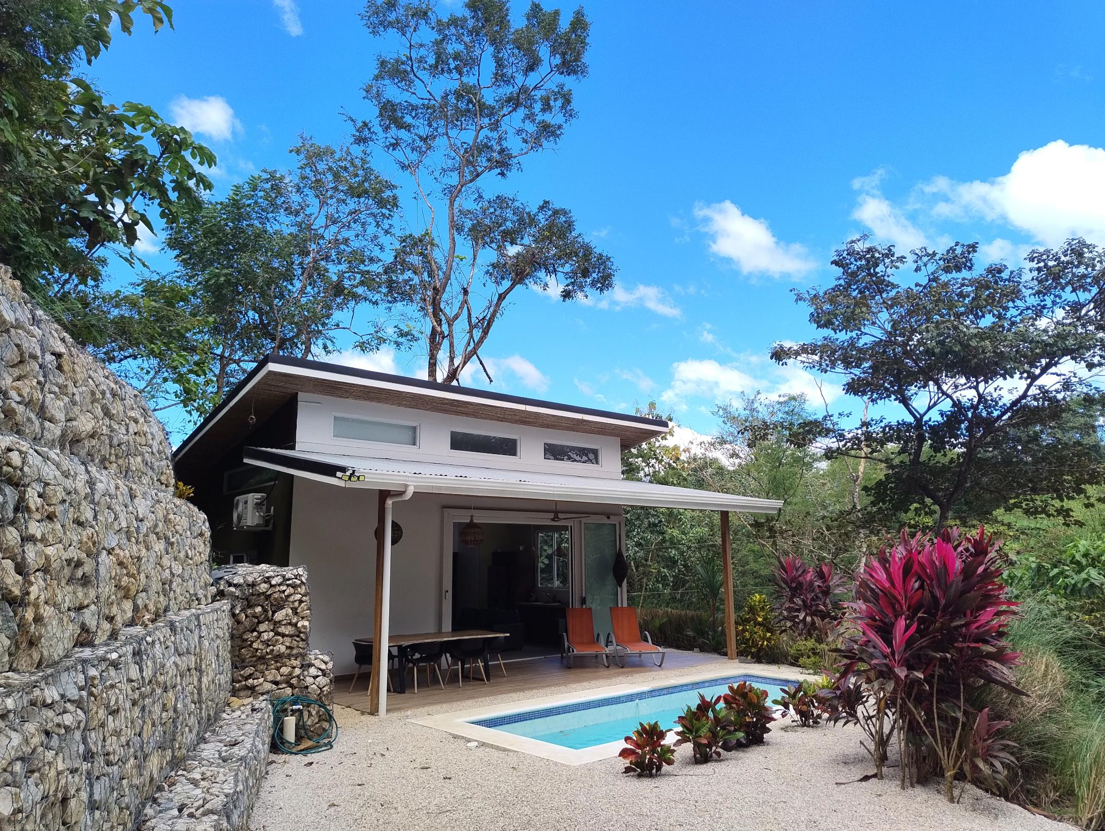 Playa Samara Modern 3 BR house with Pool and Guesthouse for sale. Where modern elegance meets serene jungle living, this home is nestled above a quiet road, offering the perfect blend of seclusion and convenience just a short drive from Samara town.